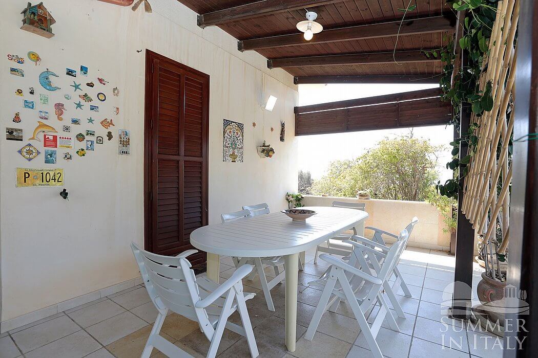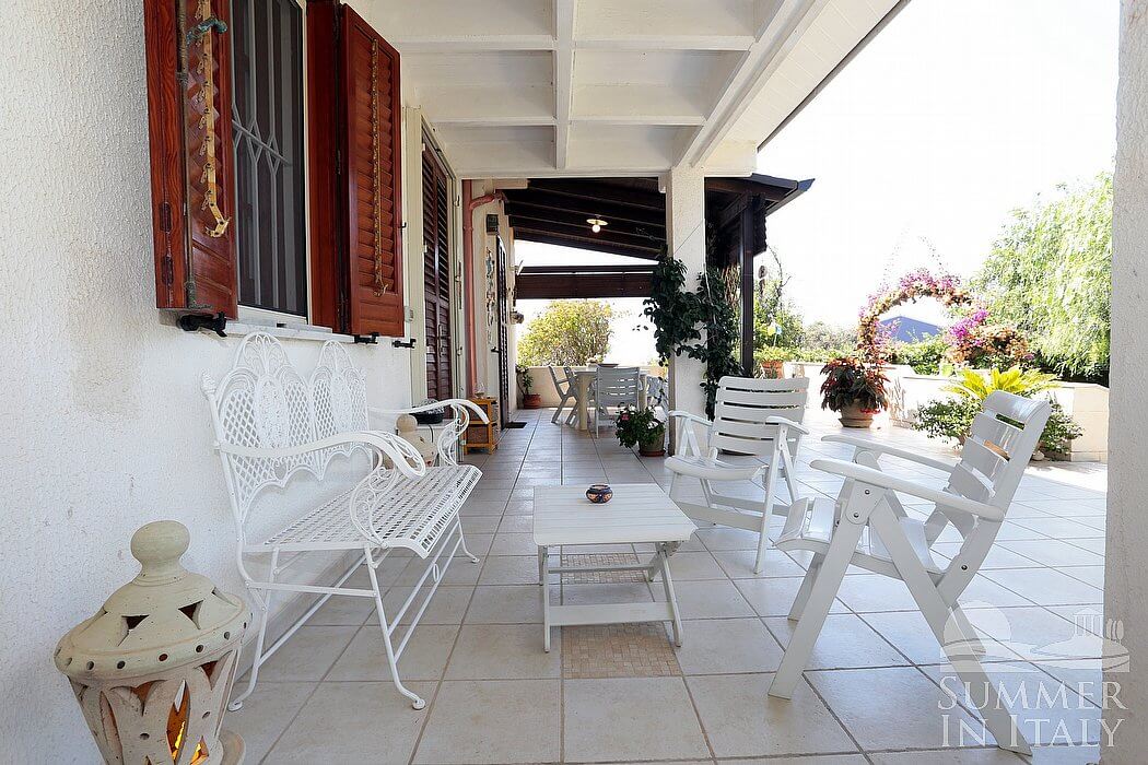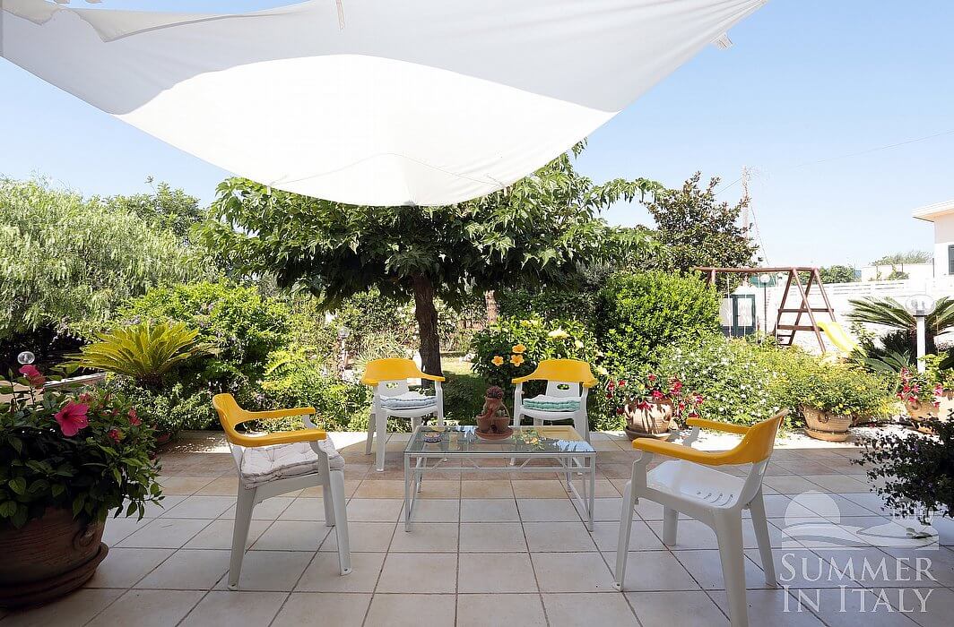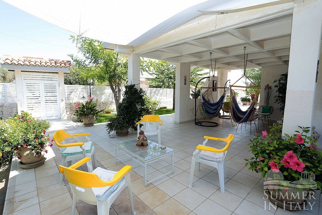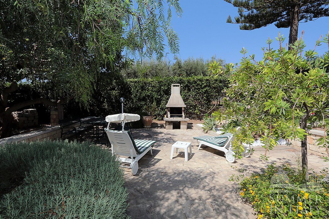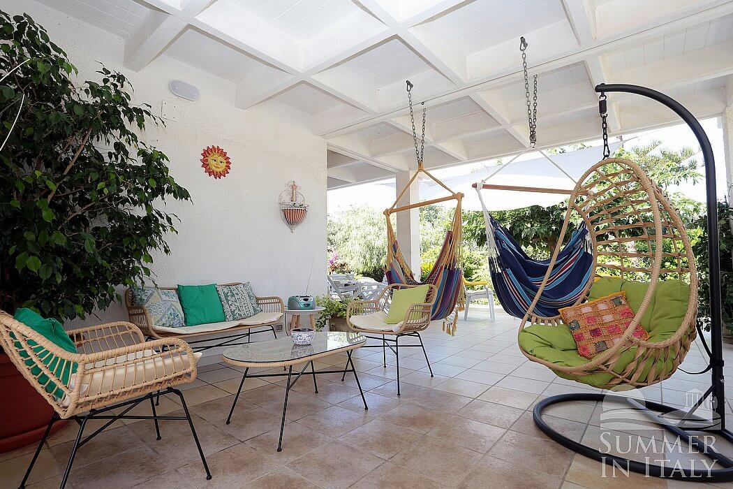 The patio is 250 square meters (2690 square feet) large. It is partly shaded by a porch and by a characteristic wood roof. It is equipped with a small sofa and two armchairs and with tables, chairs, deck chairs and hammocks. From the patio you will enjoy a spellbinding view of the garden and, partially, of the sea.
