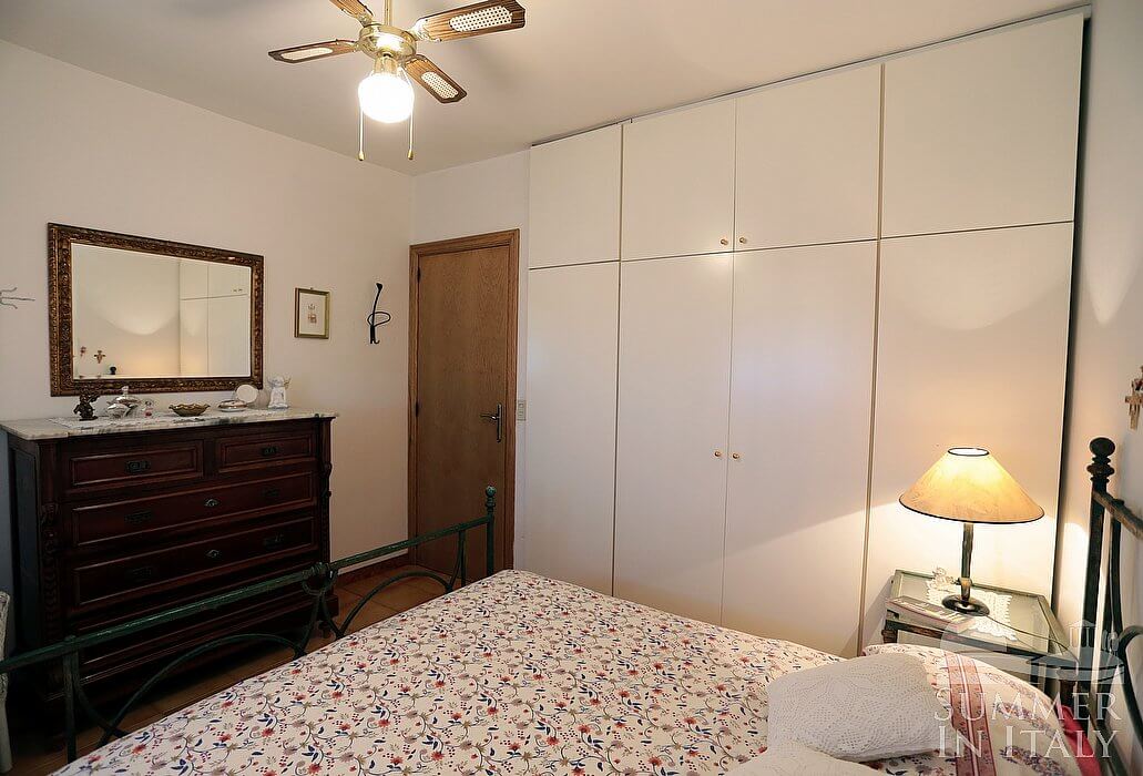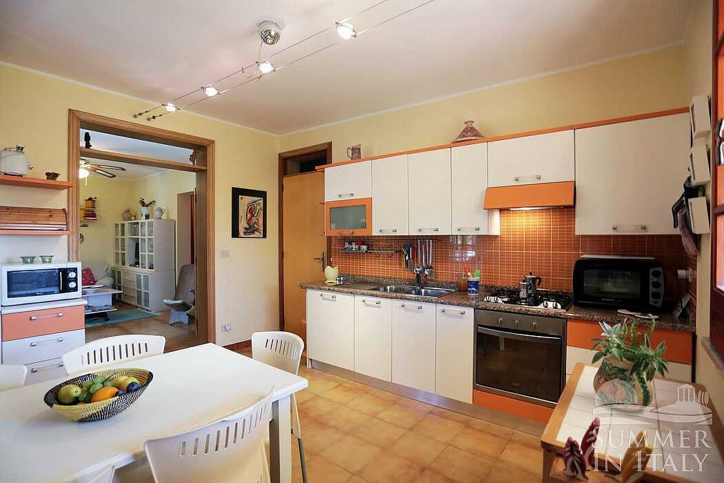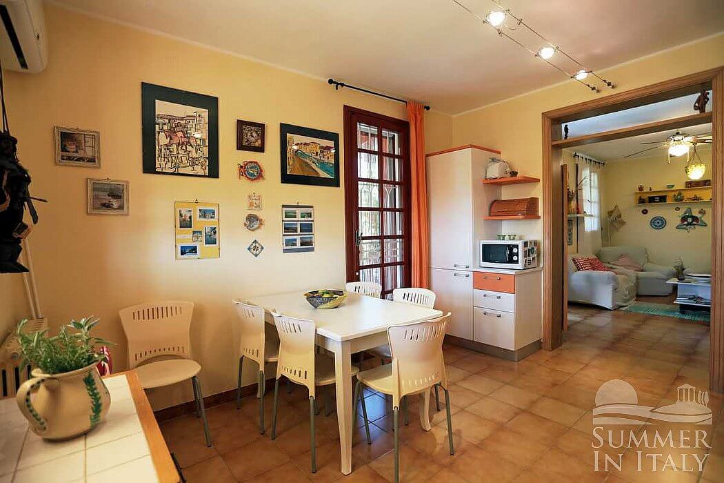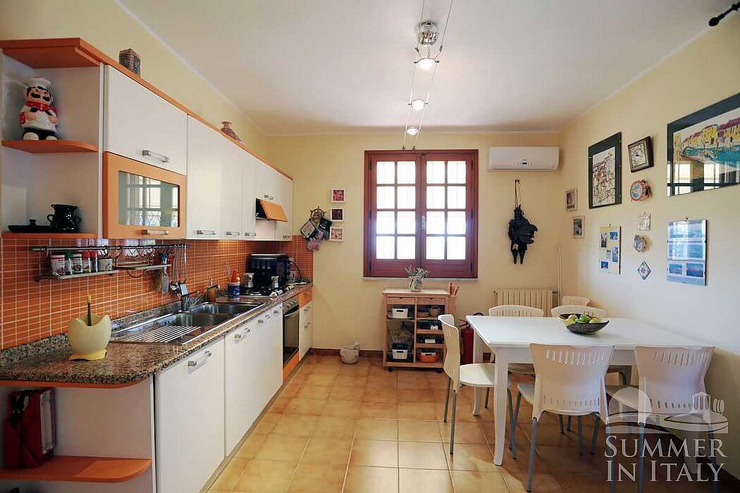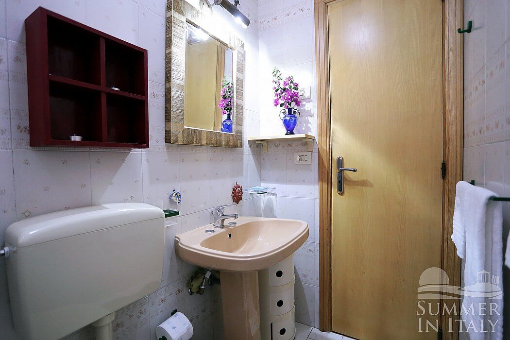 You will be able to enter the kitchen from the living room. It is equipped with a four-burner gas cooker, an electric oven, a refrigerator with freezer, a dishwasher, a microwave oven, an Italian-style coffee-maker and other small appliances. The dining table can accommodate six guests. From the kitchen a French door will take you to the patio. The room also has a window. The kitchen is equipped with an air conditioning/heating unit.