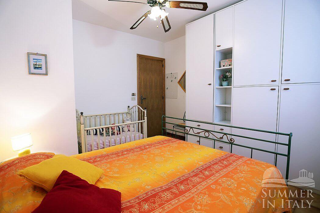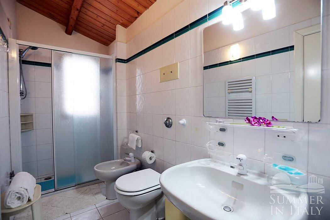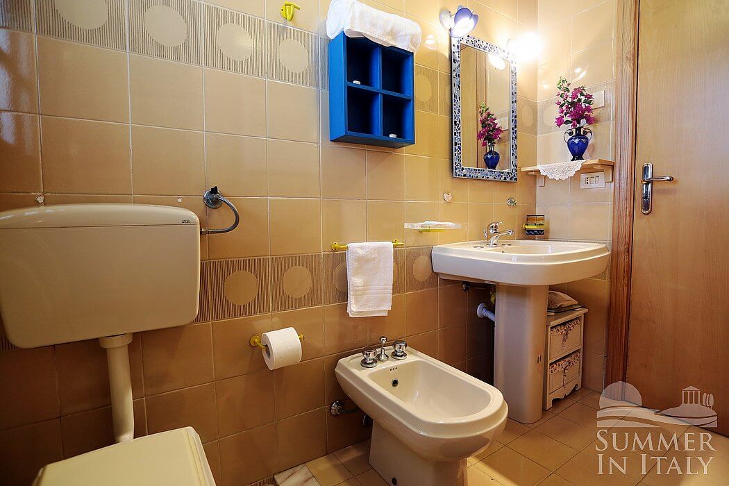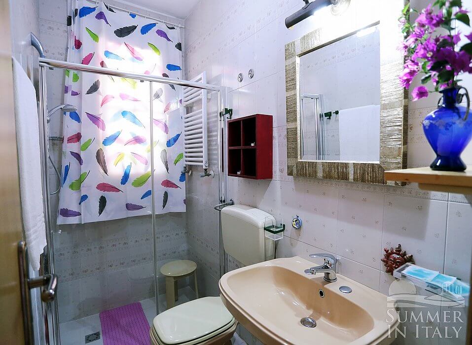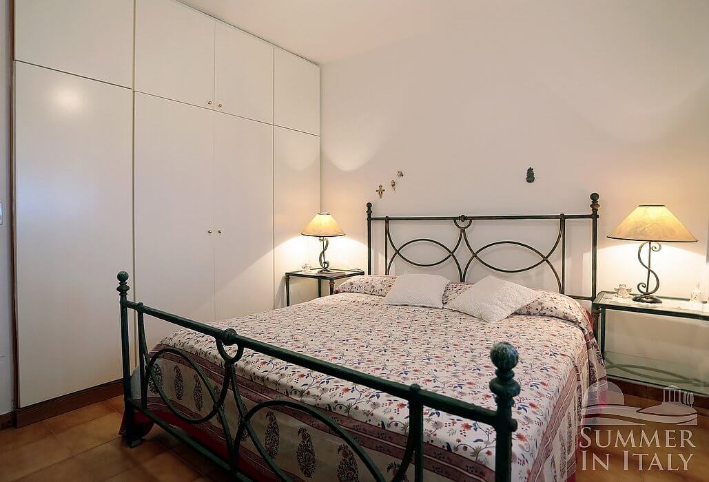 You will be able to enter the kitchen from the living room. It is equipped with a four-burner gas cooker, an electric oven, a refrigerator with freezer, a dishwasher, a microwave oven, an Italian-style coffee-maker and other small appliances. The dining table can accommodate six guests. From the kitchen a French door will take you to the patio. The room also has a window. The kitchen is equipped with an air conditioning/heating unit.