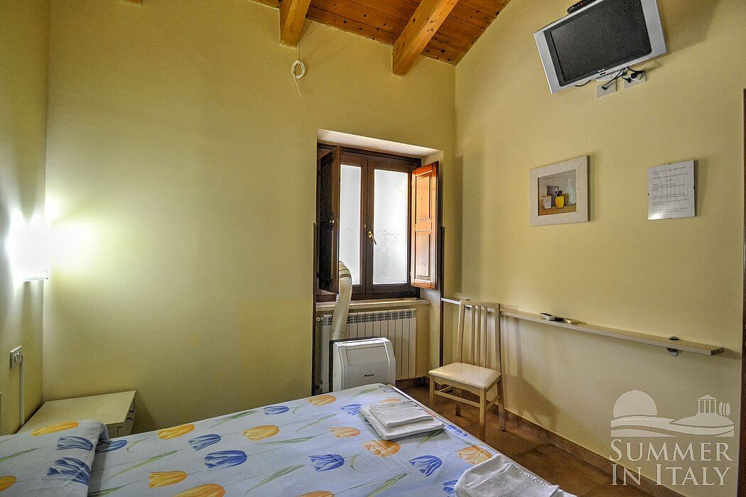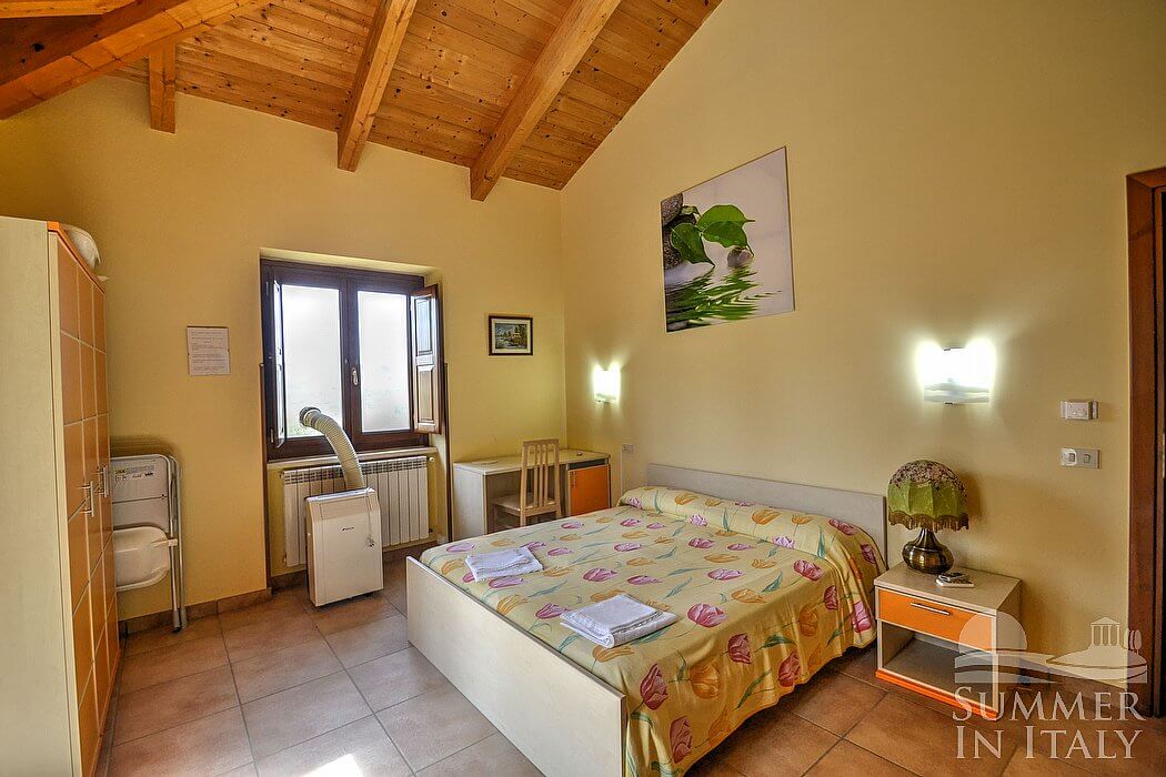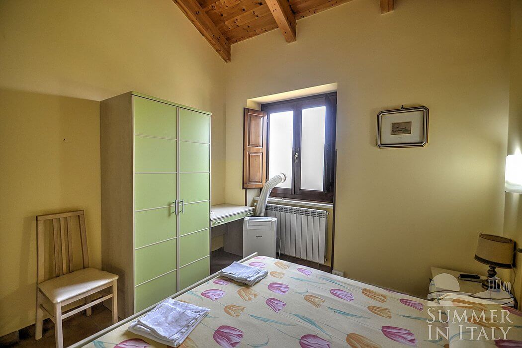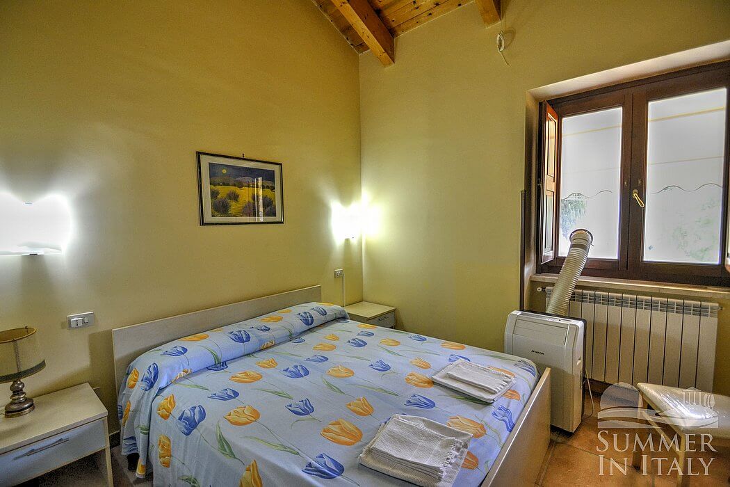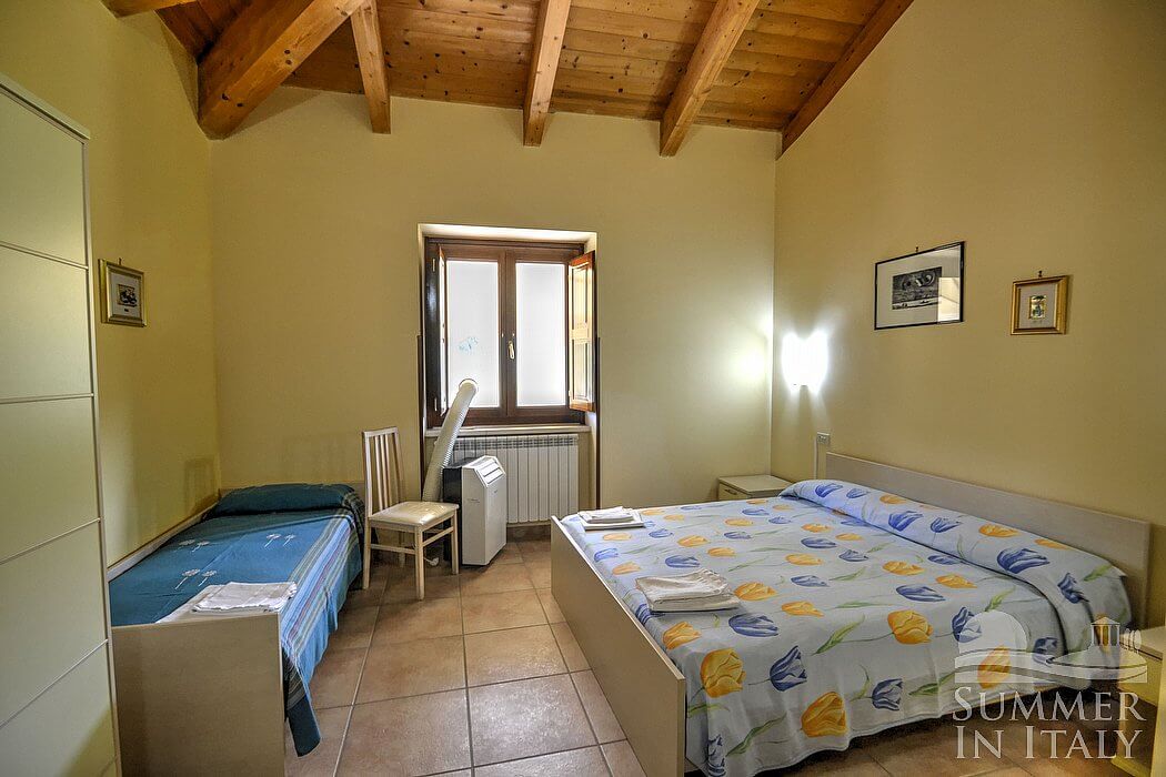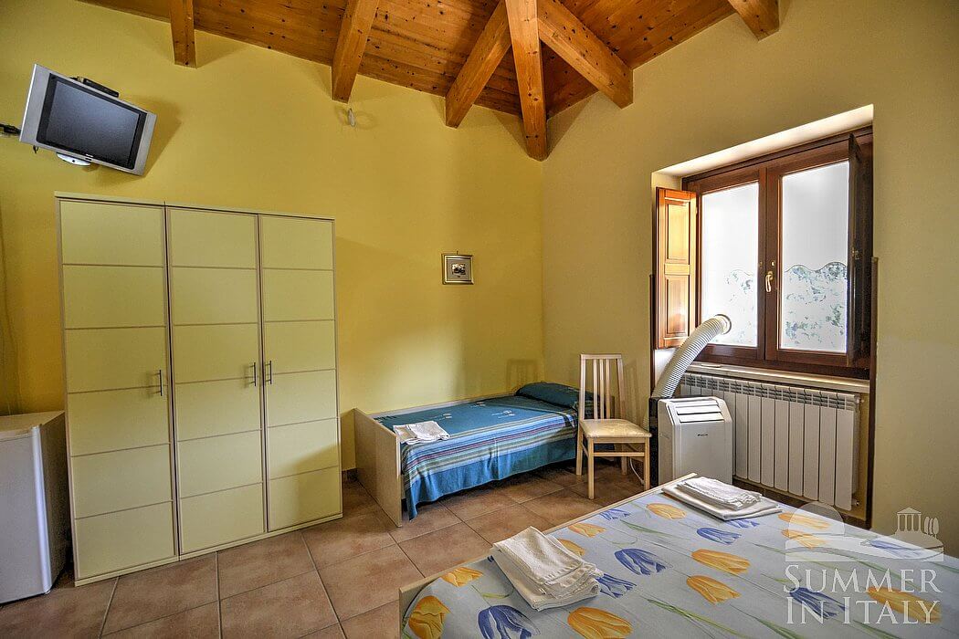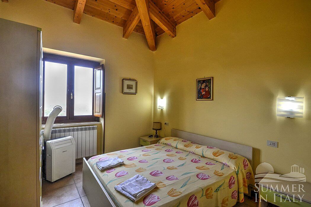 The ceiling of the first bedroom has characteristic exposed wood beams. The furnishings are modern and welcoming. The room has a matrimonial bed (160 cm/62 inches, wider than a queen-size bed) and a single bed (80 cm/32 inches). In this room you will find a satellite television (local channels). The room has a window with a view of the garden and of the hills. The bedroom is equipped with an air conditioning/heating unit.