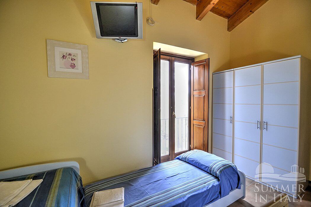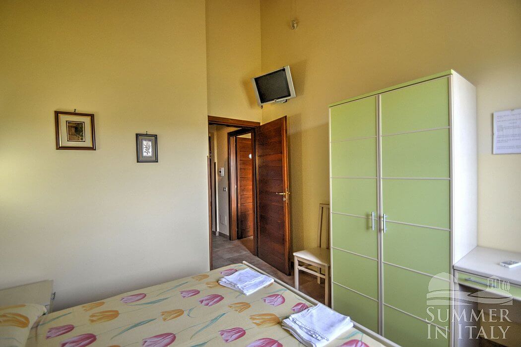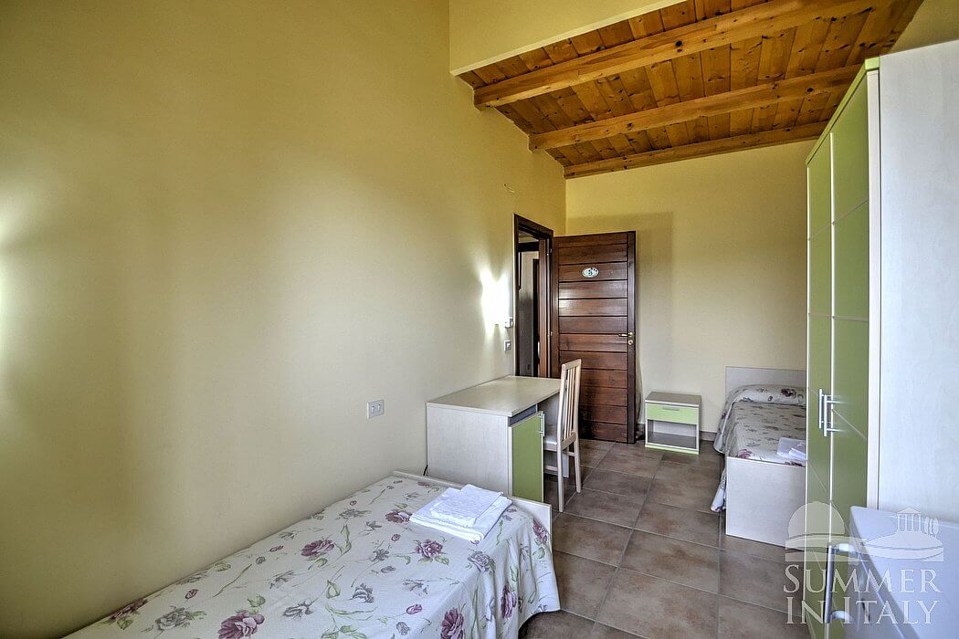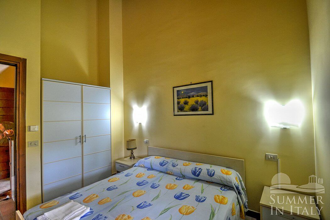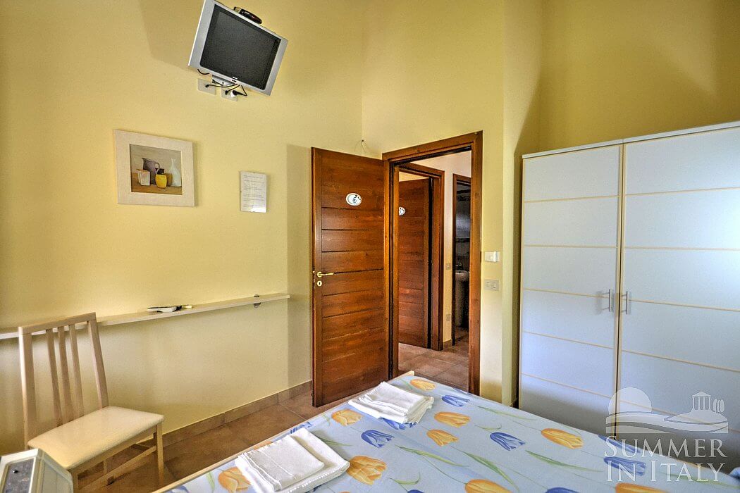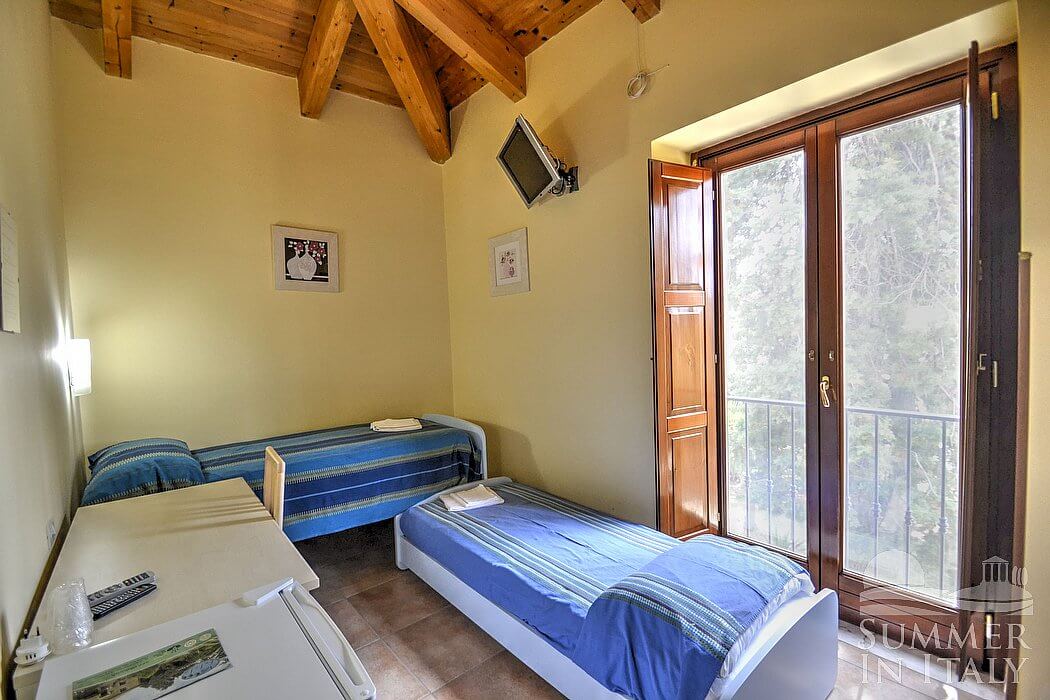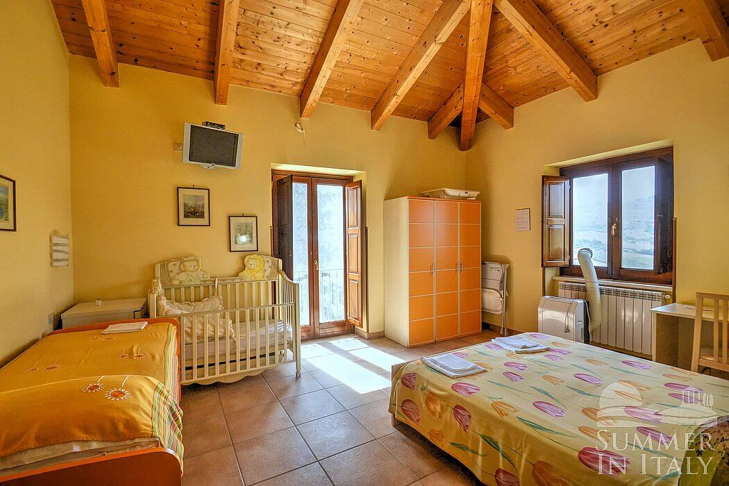 The ceiling of the first bedroom has characteristic exposed wood beams. The furnishings are modern and welcoming. The room has a matrimonial bed (160 cm/62 inches, wider than a queen-size bed) and a single bed (80 cm/32 inches). In this room you will find a satellite television (local channels). The room has a window with a view of the garden and of the hills. The bedroom is equipped with an air conditioning/heating unit.