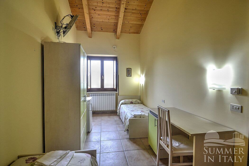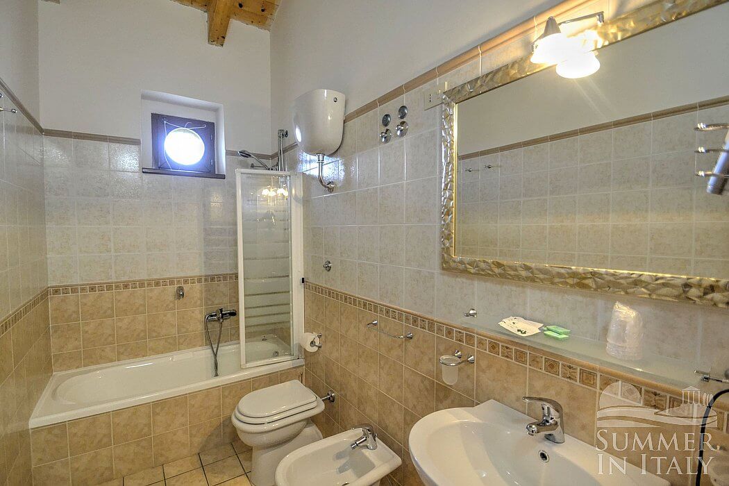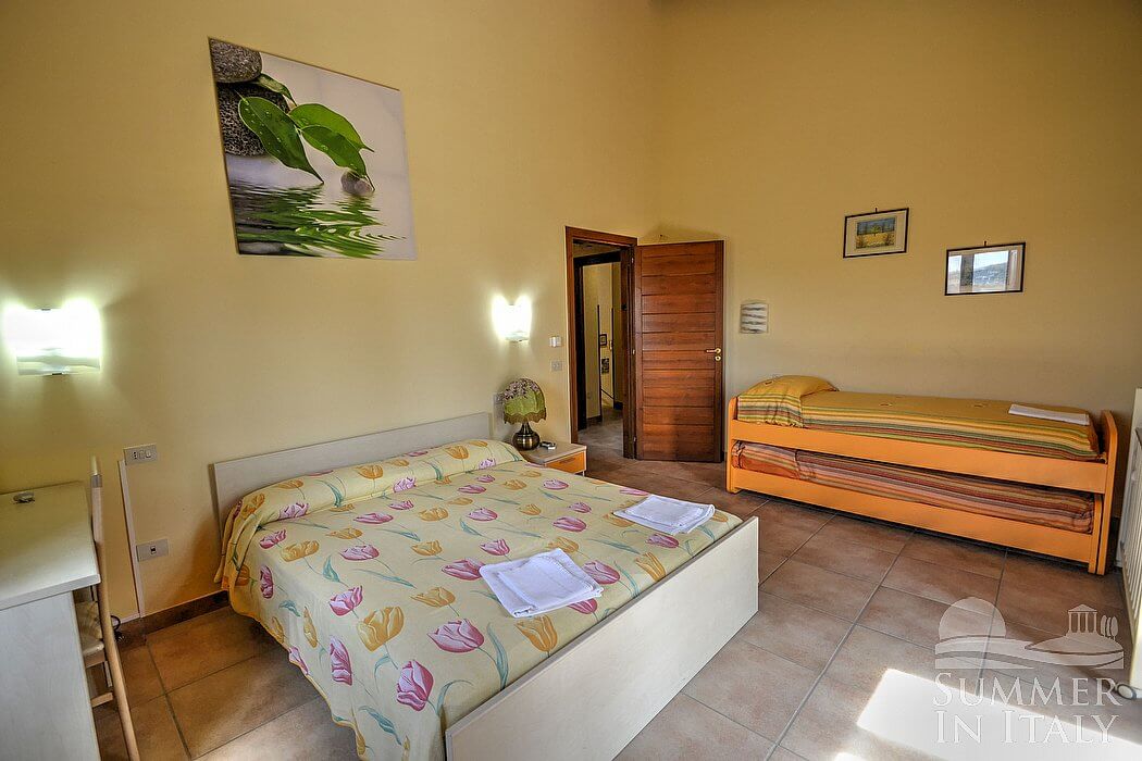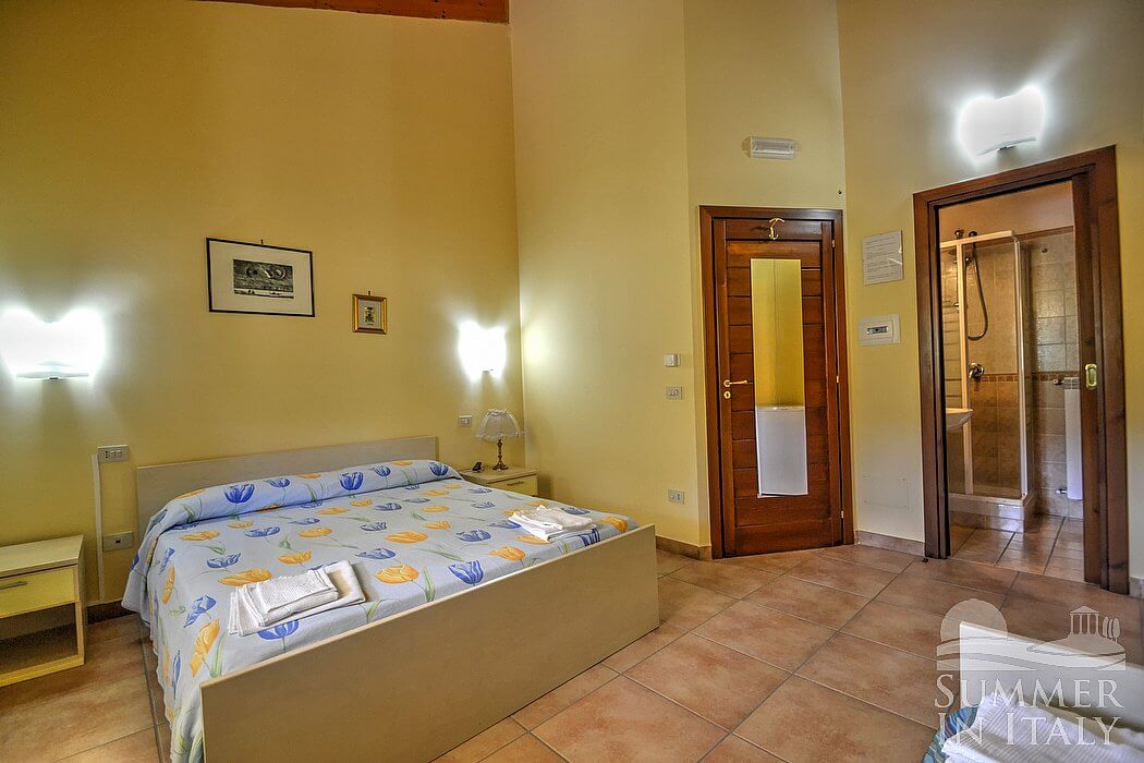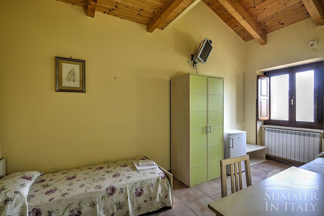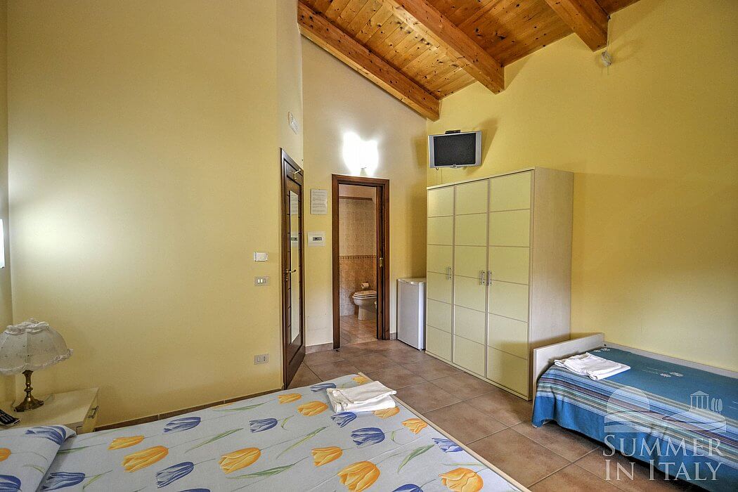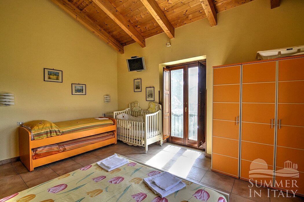 The ceiling of the first bedroom has characteristic exposed wood beams. The furnishings are modern and welcoming. The room has a matrimonial bed (160 cm/62 inches, wider than a queen-size bed) and a single bed (80 cm/32 inches). In this room you will find a satellite television (local channels). The room has a window with a view of the garden and of the hills. The bedroom is equipped with an air conditioning/heating unit.