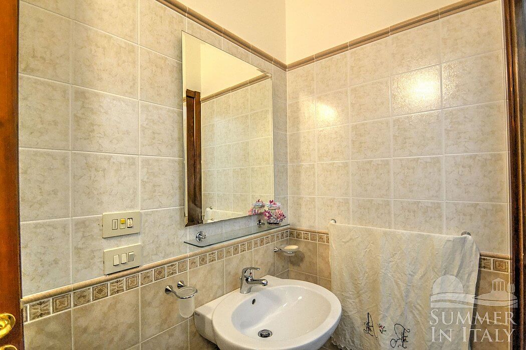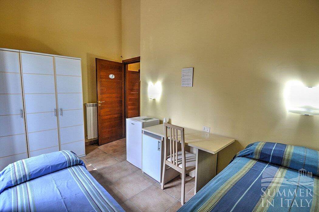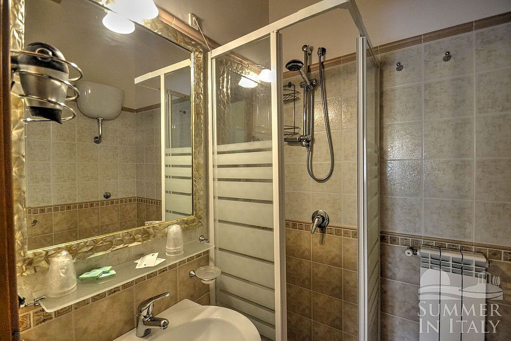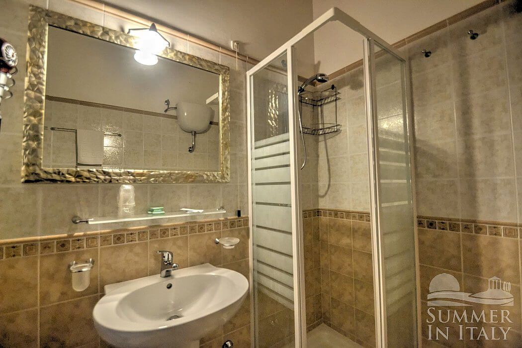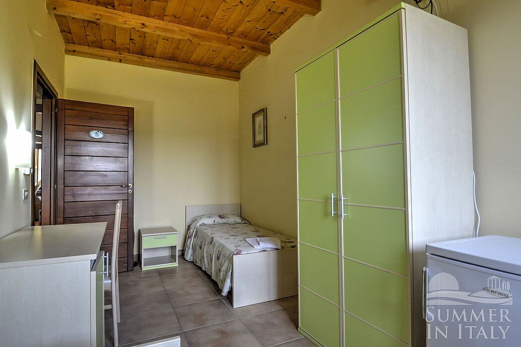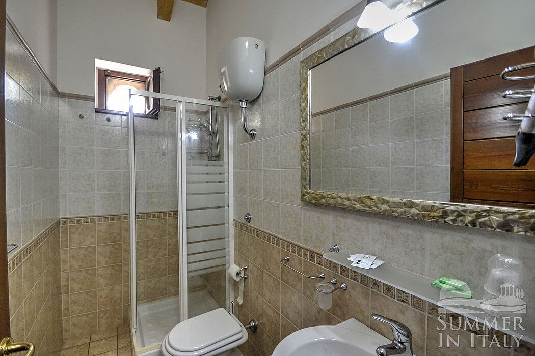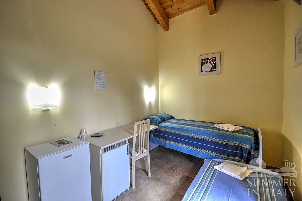 The ceiling of the first bedroom has characteristic exposed wood beams. The furnishings are modern and welcoming. The room has a matrimonial bed (160 cm/62 inches, wider than a queen-size bed) and a single bed (80 cm/32 inches). In this room you will find a satellite television (local channels). The room has a window with a view of the garden and of the hills. The bedroom is equipped with an air conditioning/heating unit.