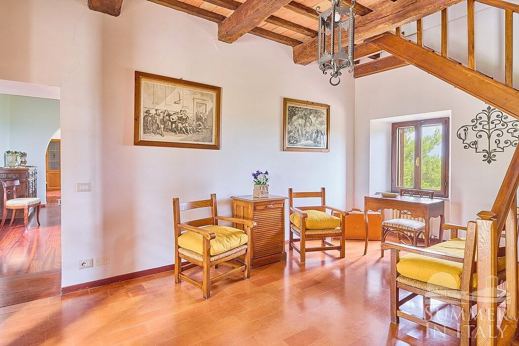 The first living room is paved with terracotta tiles. The ceiling has characteristic exposed wood beams and terracotta tiles. The furnishings are warm and welcoming, and include a sofa, three armchairs and a desk. In this room you will find a television (local channels). From the living room you will be able to enter the garden through a French door. The room also has a window, as well as a small high window. Here you will also find a safe.