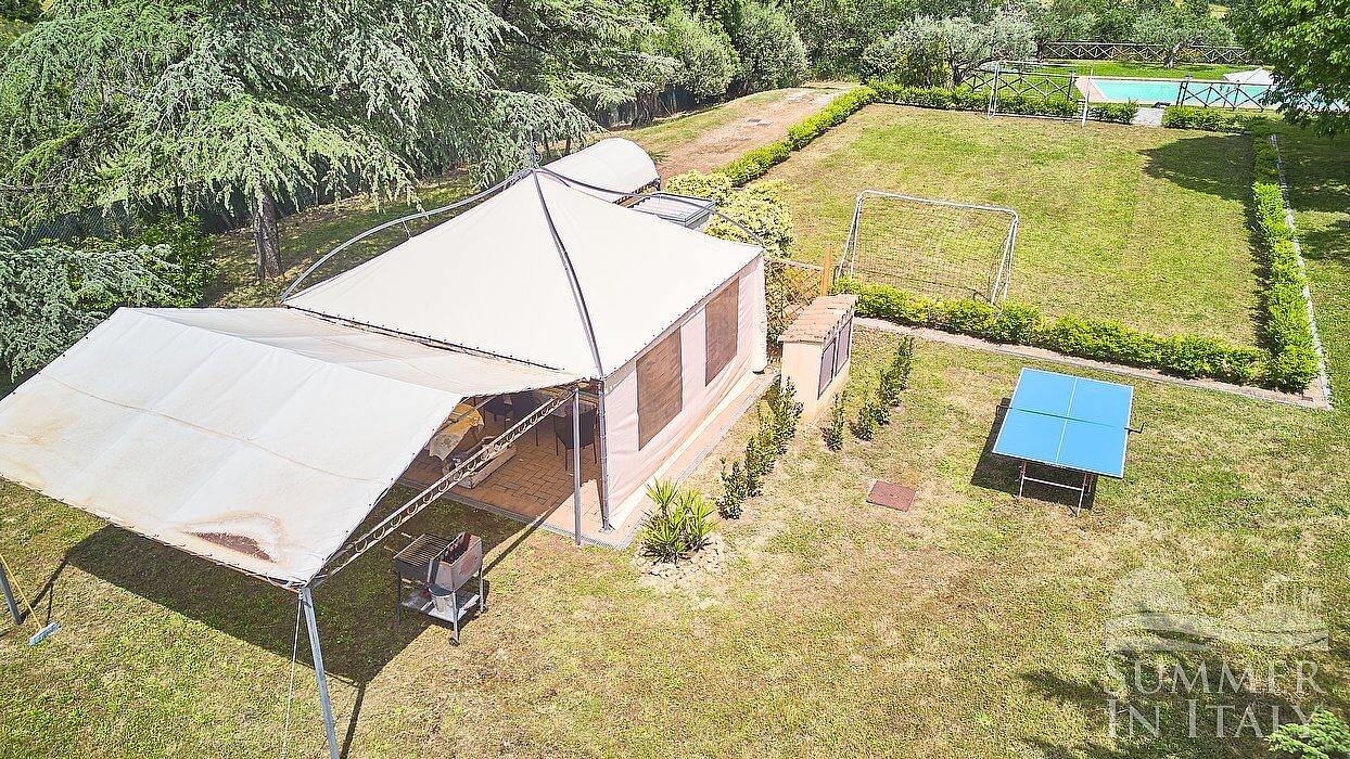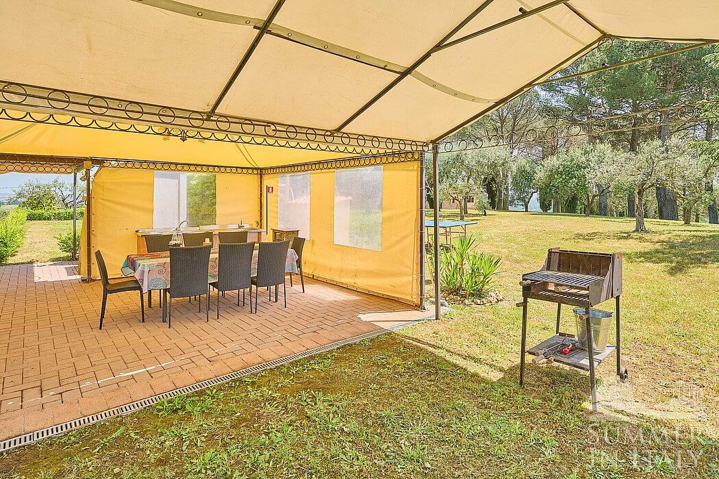 The garden is 2000 square meters (21500 square feet). It is partly shaded by tall trees. It is equipped with a table, chairs and a gazebo. In the garden you will find a children's playground and you will be able to have fun with a ping pong table, and you will also find a barbecue. From the garden you will enjoy a pleasant view of the greenery and of the hills.