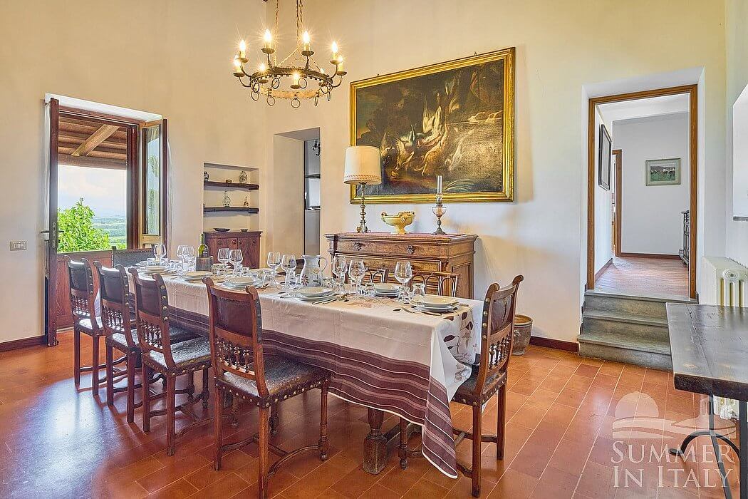 You will be able to enter the dining room from the living room through an access area, climbing two steps. The furnishings are classic and welcoming, and include a suspended chandelier. The dining table can accommodate ten guests. From the dining room you will be able to enter the first patio going down approximately 15 steps, through a French door. The room also has a window.
