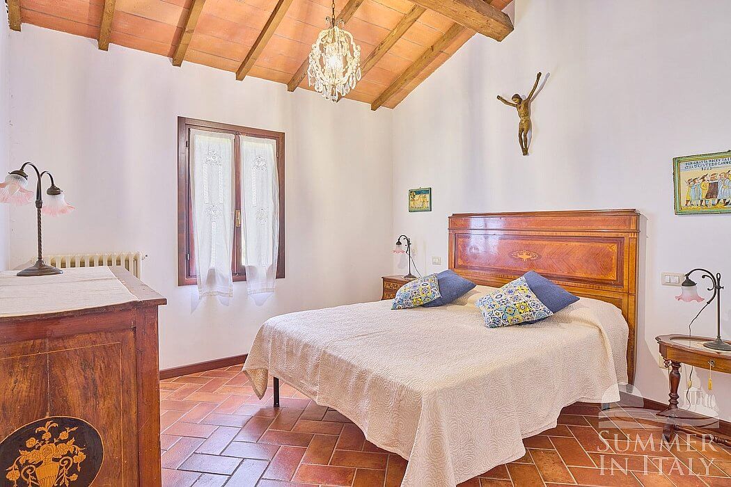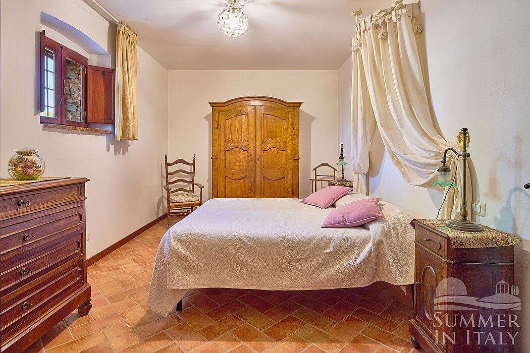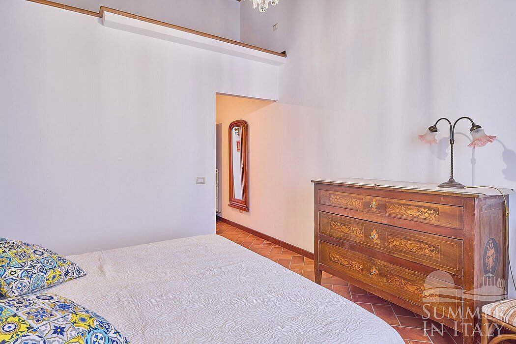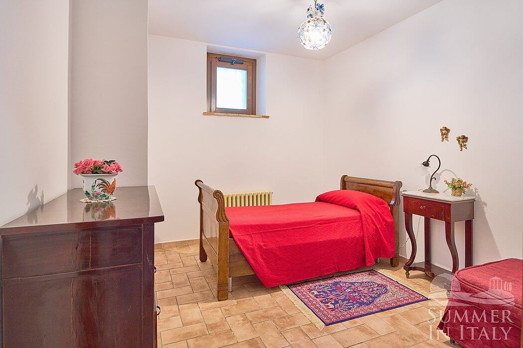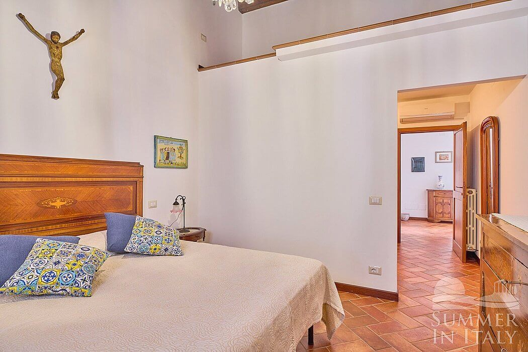 You will be able to enter the fourth bedroom from the dining room through a corridor, climbing four steps. The floor is paved with terracotta tiles. The ceiling is sloped and has characteristic exposed wood beams and terracotta tiles. The room has a matrimonial bed (160 cm/63 inches, wider than a queen-size bed). The room has a window, and it's equipped with an air conditioning/heating unit.
