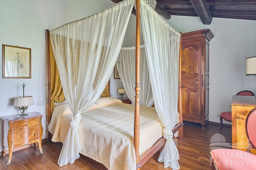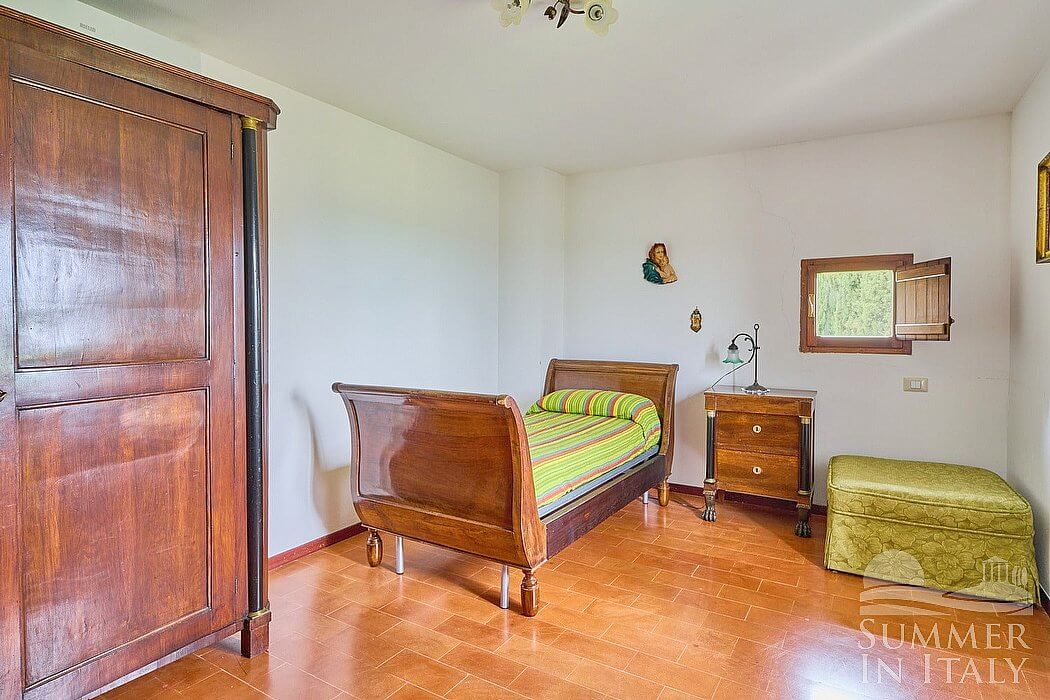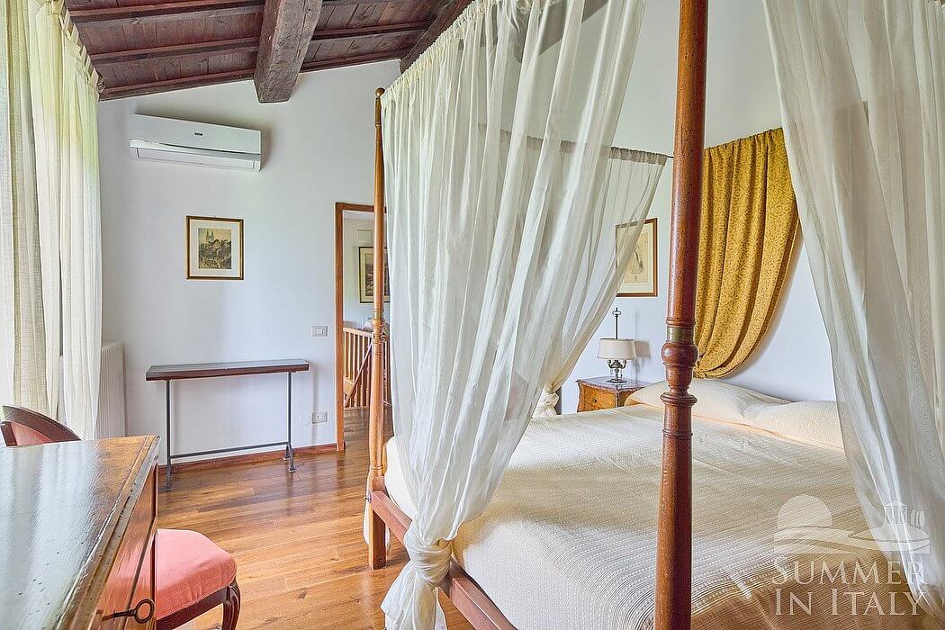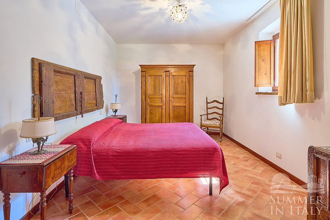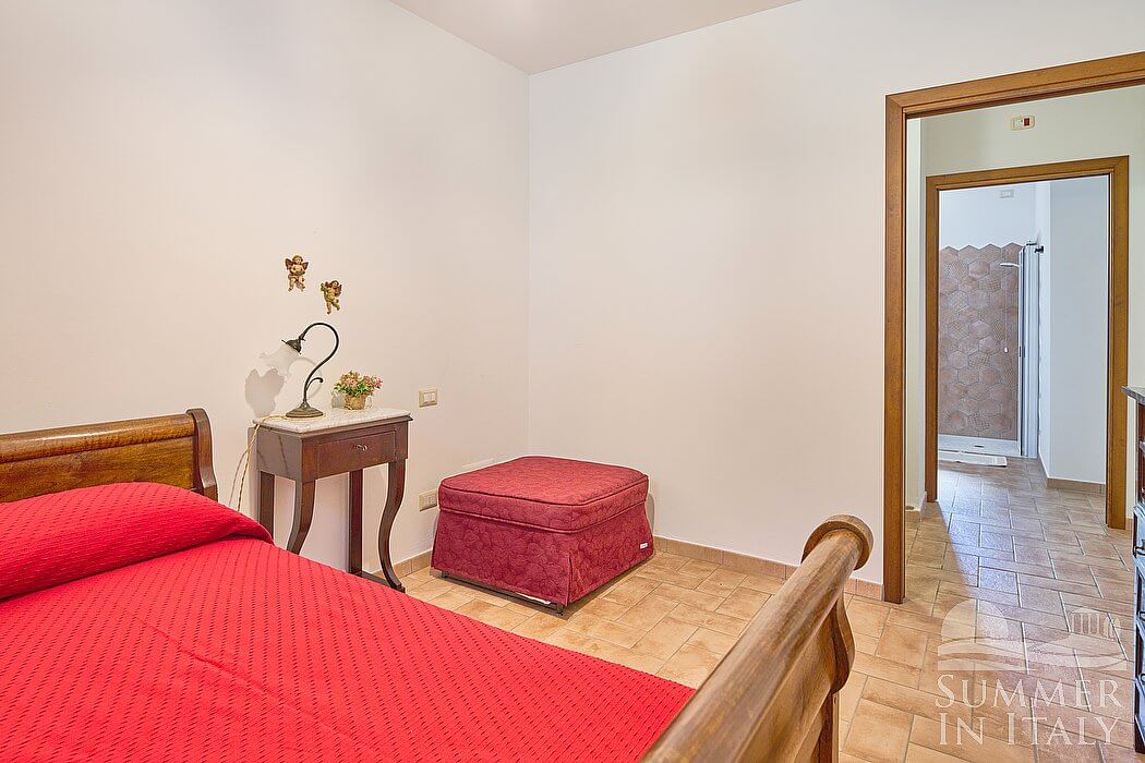 You will be able to enter the fourth bedroom from the dining room through a corridor, climbing four steps. The floor is paved with terracotta tiles. The ceiling is sloped and has characteristic exposed wood beams and terracotta tiles. The room has a matrimonial bed (160 cm/63 inches, wider than a queen-size bed). The room has a window, and it's equipped with an air conditioning/heating unit.