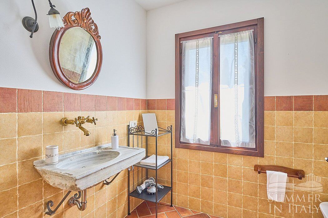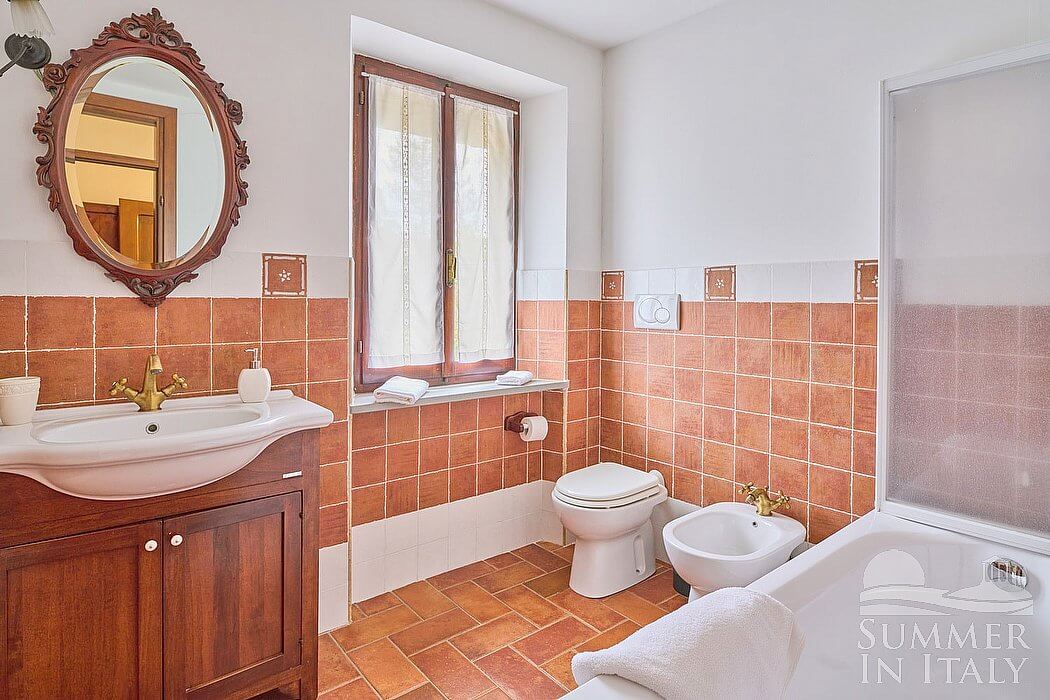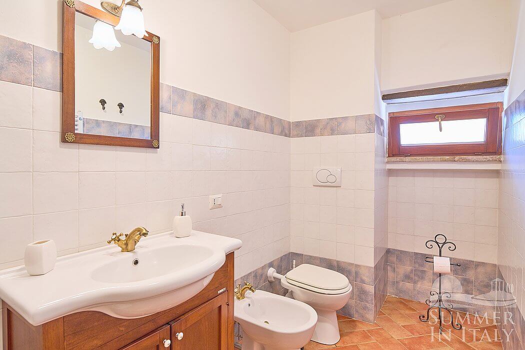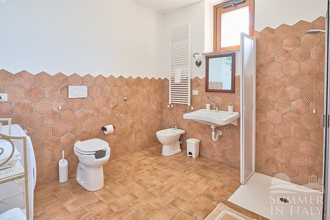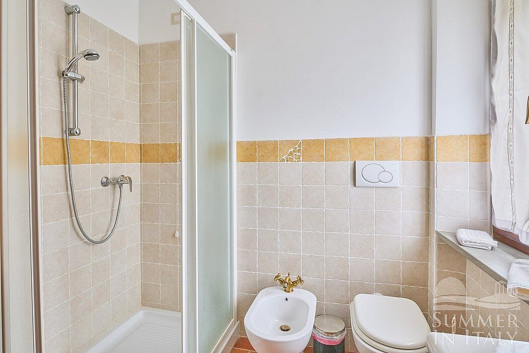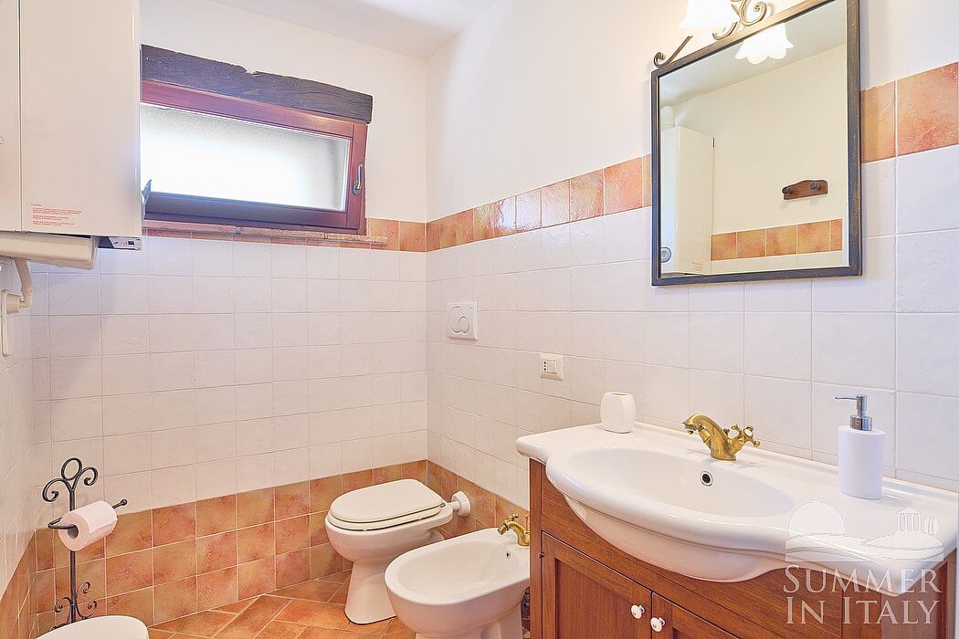 The fourth bathroom is equipped with a washbasin, a toilet, a fully enclosed shower and a hairdryer. You will be able to enter the bathroom from the dining room through a corridor, climbing four steps.