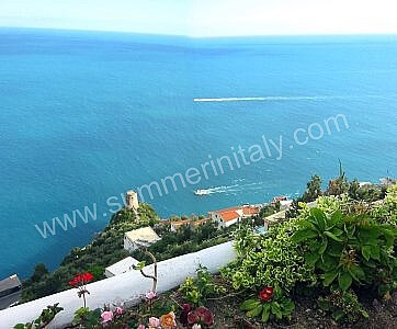 From the beach, on the bottom, if you look up at the sky, you will be able to spot the two white columns of the terrace of Villa Poesia on top of the vegetation that grows on the cliff.
