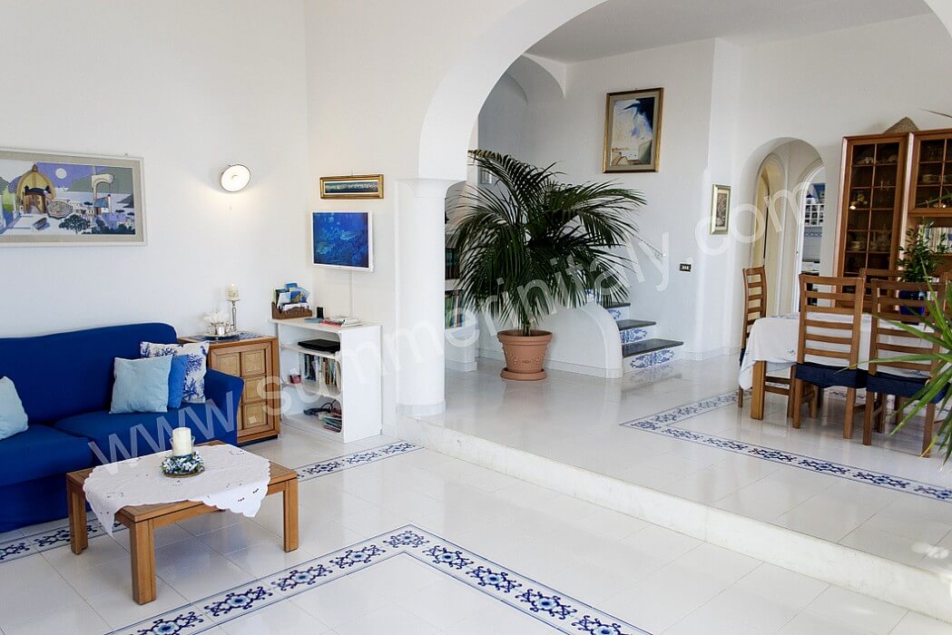 The living room is paved with handmade tiles, in the characteristic style of the Amalfi Coast. The furnishings are elegant and welcoming, and include some antique pieces. The furnishings include two sofas and an armchair. The dining table can accommodate six guests. In this room you will find a satellite television (local channels). From the living room you will be able to enter the terrace with a view of the sea and of the coast of Amalfi through a French door. The room has a large panoramic window with a view of the sea and of the coastline. It is equipped with an air conditioning/heating unit.
