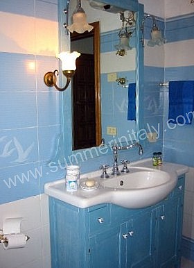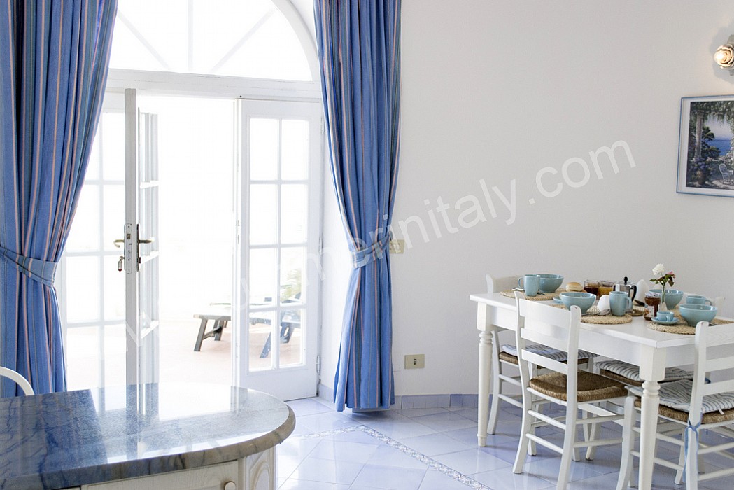 The kitchen is spacious and comfortable, equipped with a four-burner gas cooker, an electric oven, a refrigerator with freezer, a dishwasher, a microwave oven, an Italian-style coffee-maker and other small appliances. The dining table can accommodate four guests. From the kitchen a French door will take you to the terrace with a view of the sea and of the coastline. The room has an arched window with a view of the greenery and of the sea at a distance.