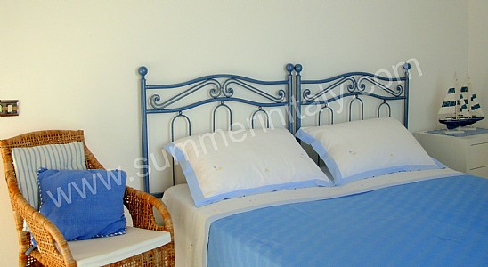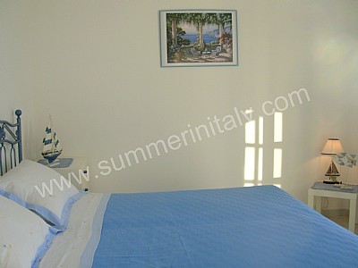 You will be able to enter the second bedroom from the corridor. The bedroom has a matrimonial bed (160 cm/62 inches, wider than a queen-size bed). From the bedroom you will be able to enter the second terrace with a view of the sea and of the coastline through a French door. The bedroom is equipped with an air conditioning/heating unit.