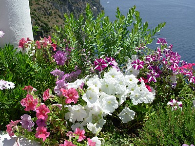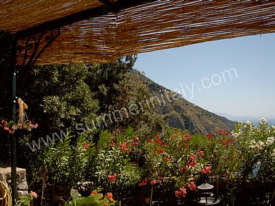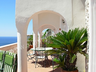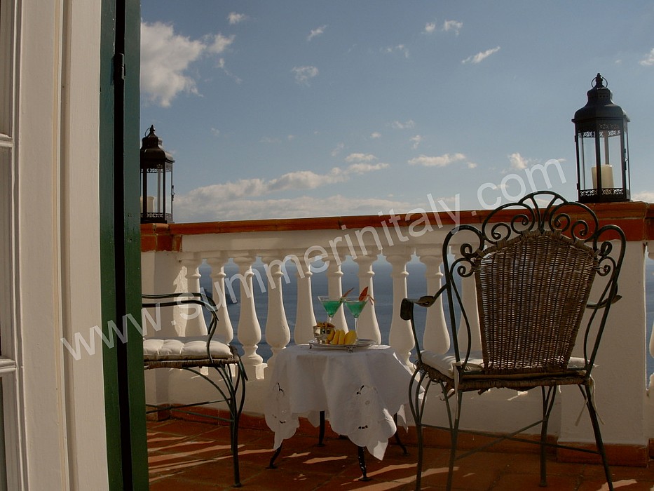 The other way around, if you stand on the terrace you will see the cliff below you like if you were on top of a skyscraper made of rock and covered by the thriving Mediterranean vegetation. It is especially charming to see, vertically below you, the small cape where the ancient circular Saracen Tower stands. The tower was built a thousand years ago as a defence for the small bay of Praia. The sea in the inlet guarded by the tower is deep blue, and it is spotted with the blob of colour of the small boats that are moored there.