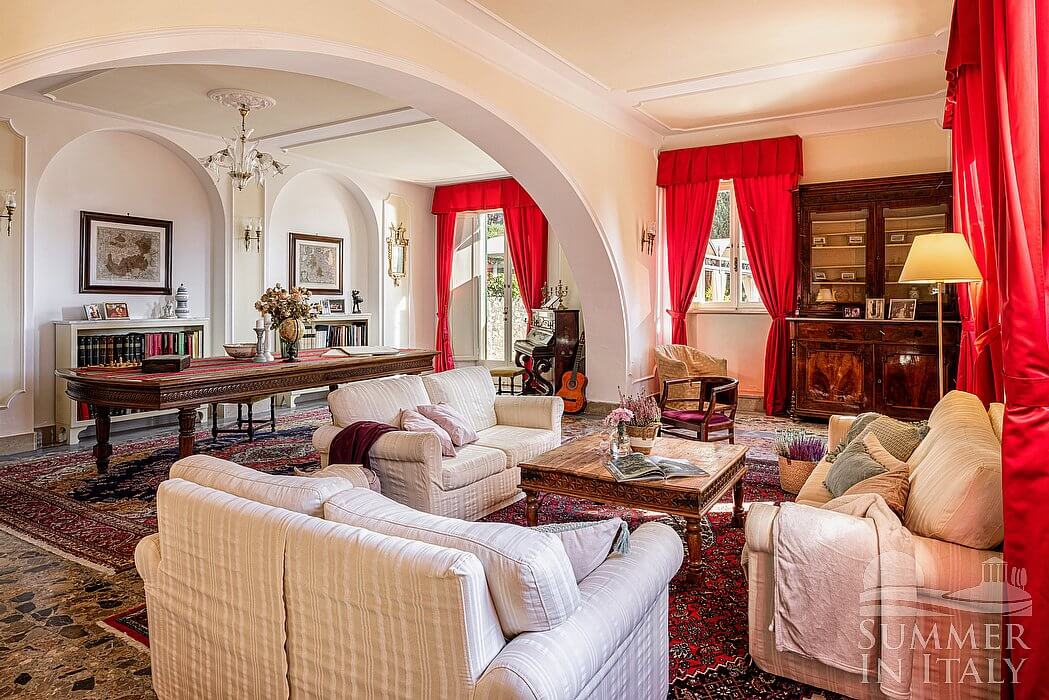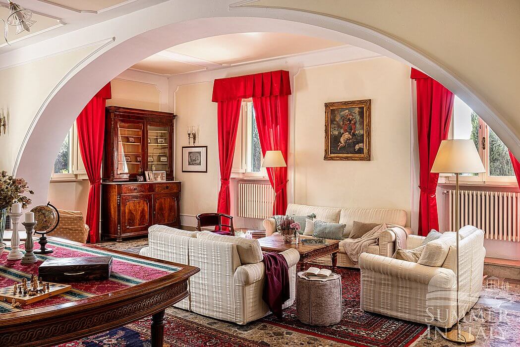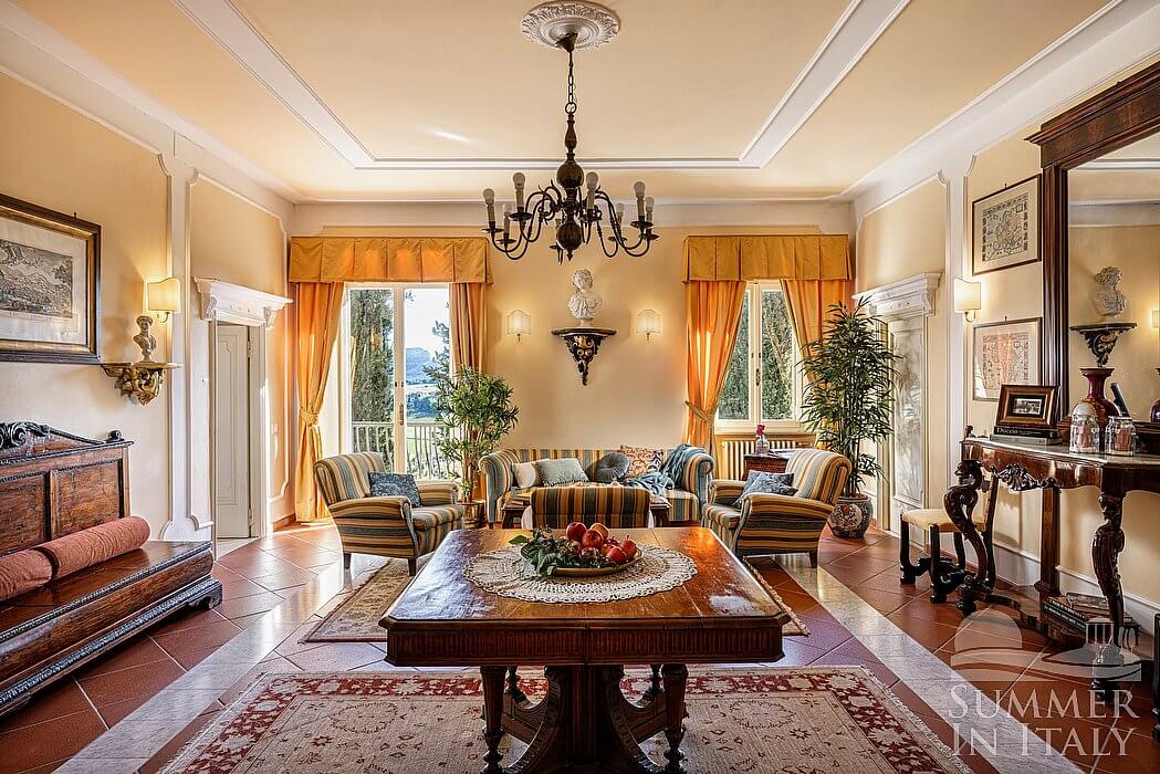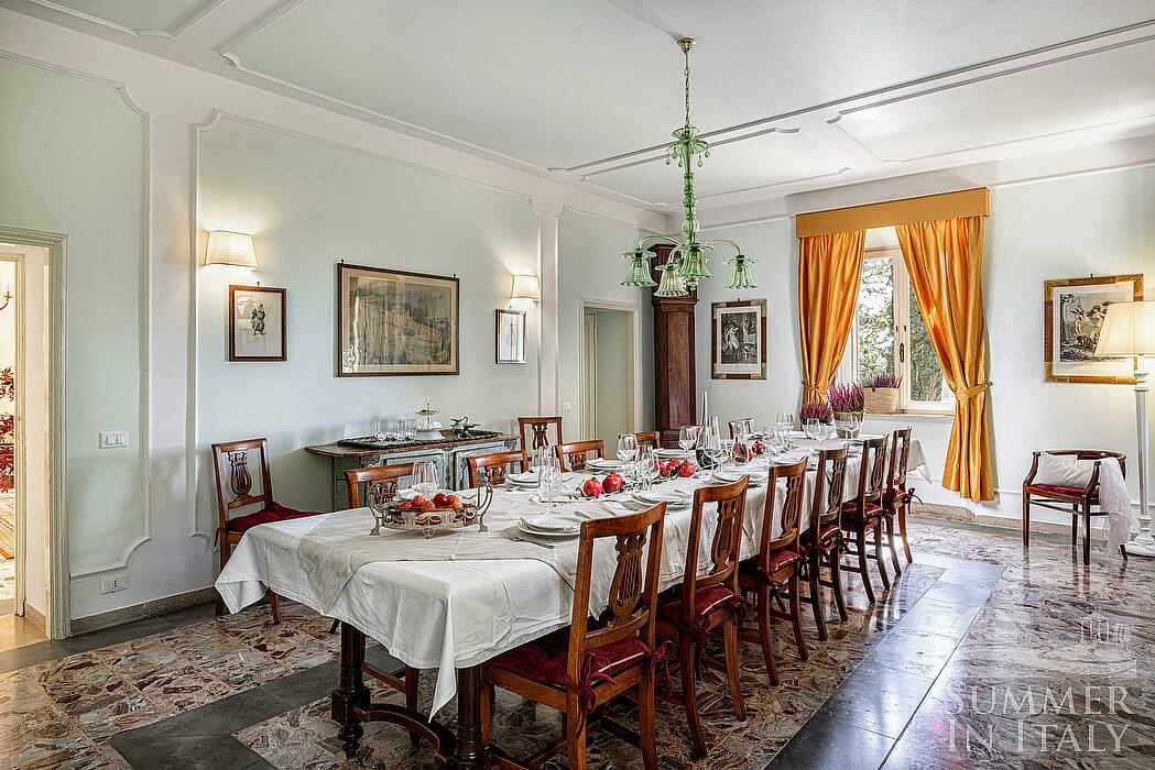 You will be able to enter the first living room from the second living room climbing two steps. The furnishings are elegant and refined, featuring some antique pieces, and include sofas and a desk. In this room you will find an upright piano, for decorative purposes only. There is an age-old and impressive fireplace decorated in marble. The dining table can accommodate 12 guests. In this room you will find a large flat-screen satellite television (local channels). From the living room you will be able to enter the patio through a French door. The room has three windows with a view of the greenery and of the hills.