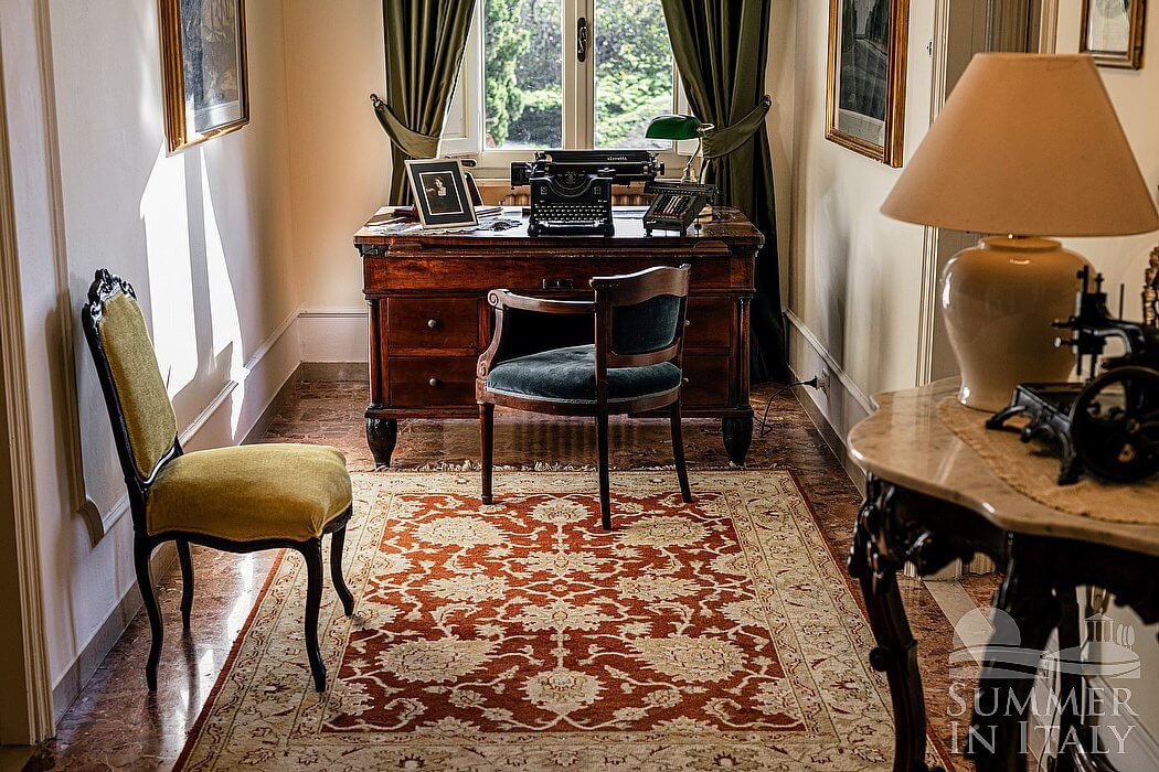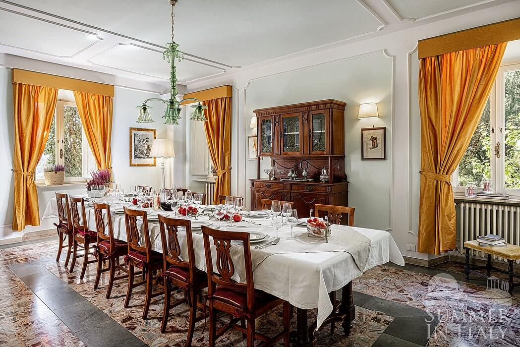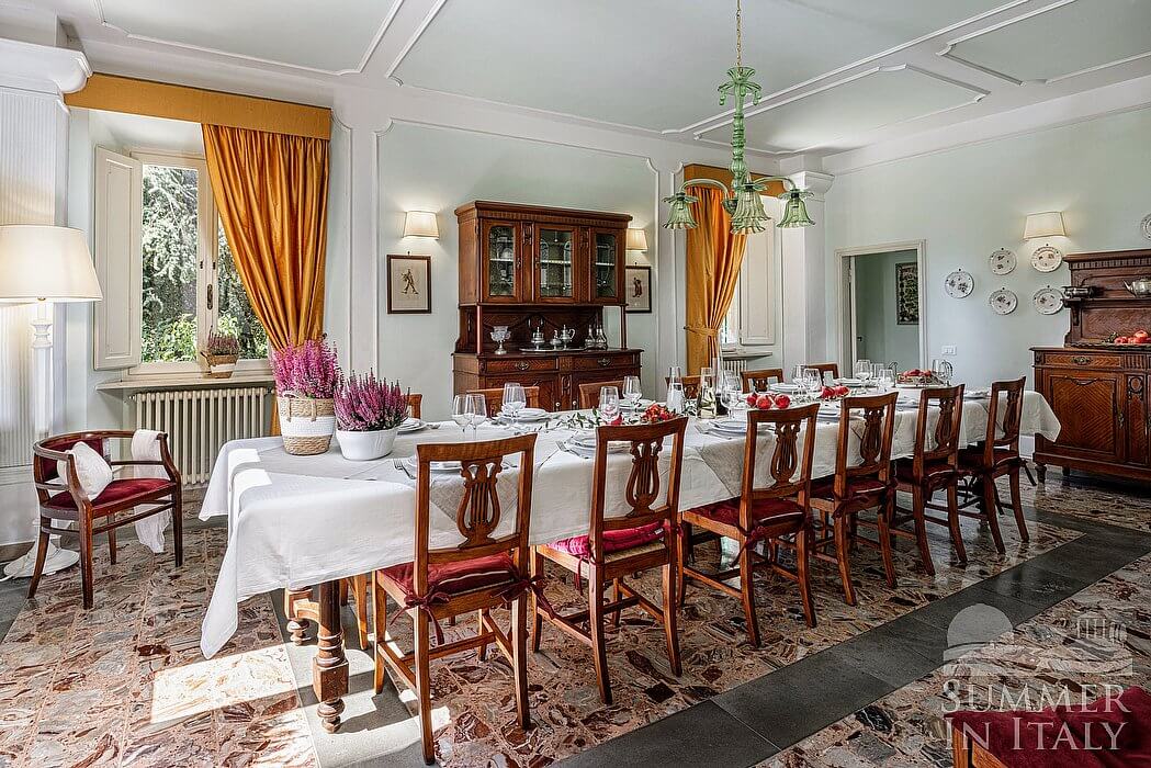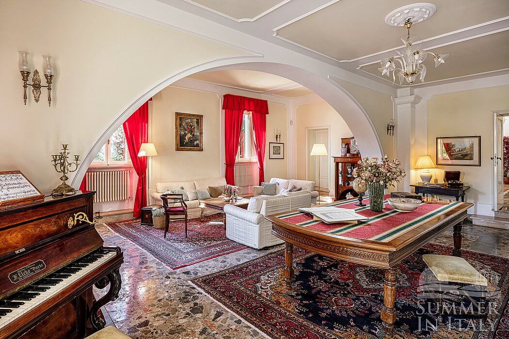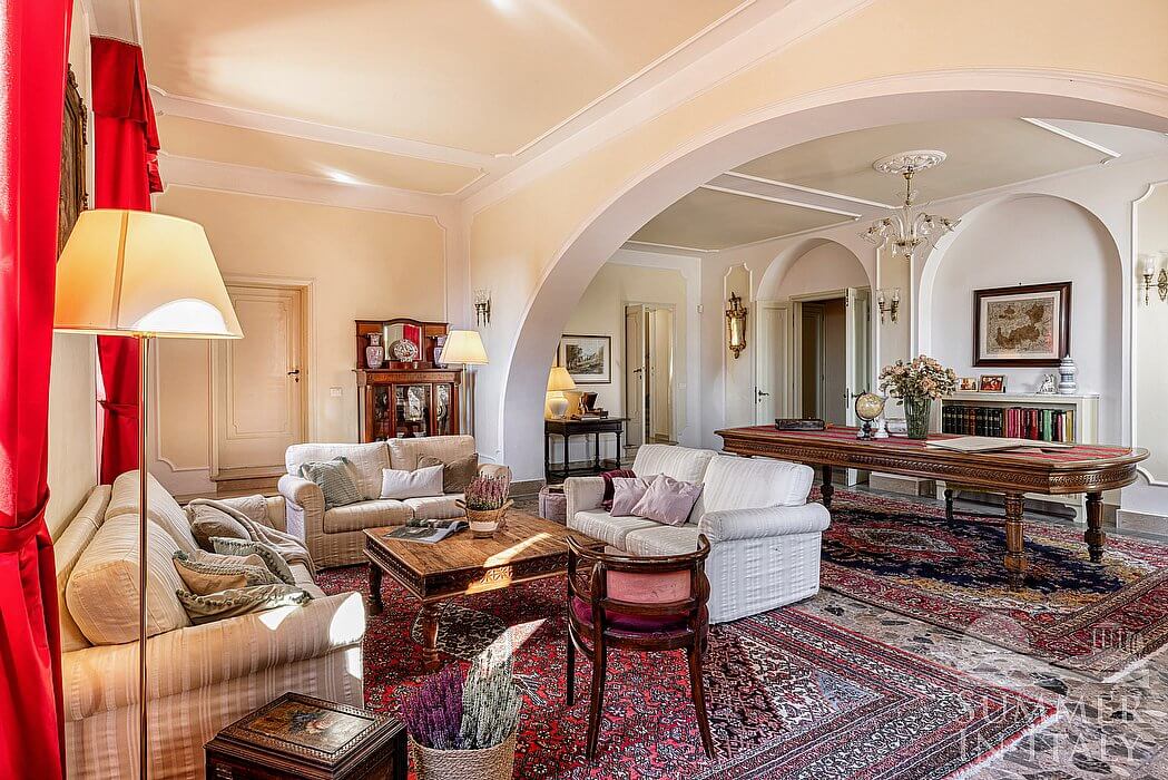 You will be able to enter the first living room from the second living room climbing two steps. The furnishings are elegant and refined, featuring some antique pieces, and include sofas and a desk. In this room you will find an upright piano, for decorative purposes only. There is an age-old and impressive fireplace decorated in marble. The dining table can accommodate 12 guests. In this room you will find a large flat-screen satellite television (local channels). From the living room you will be able to enter the patio through a French door. The room has three windows with a view of the greenery and of the hills.