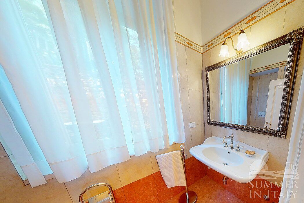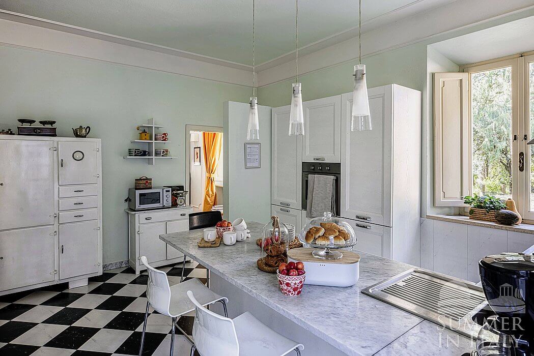 You will be able to enter the kitchen from the dining room. The floor is paved with checkered black and white tiles. It is spacious and comfortable, equipped with a five-burner gas cooker, an electric oven, a refrigerator with freezer, a dishwasher, a microwave oven, an Italian-style coffee-maker, an American-style coffee-maker, a toaster and other small appliances. The dining table is a little kitchen peninsula, and can accommodate three guests. From the kitchen a French door will take you to the garden and the swimming pool. The room has a window with a view of the garden.
