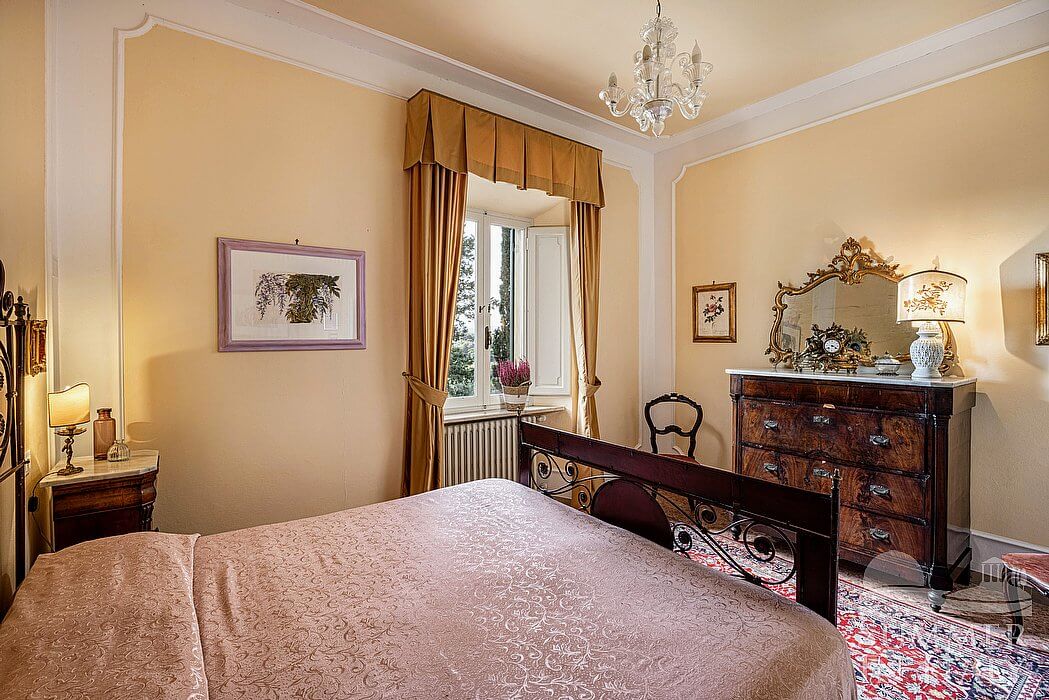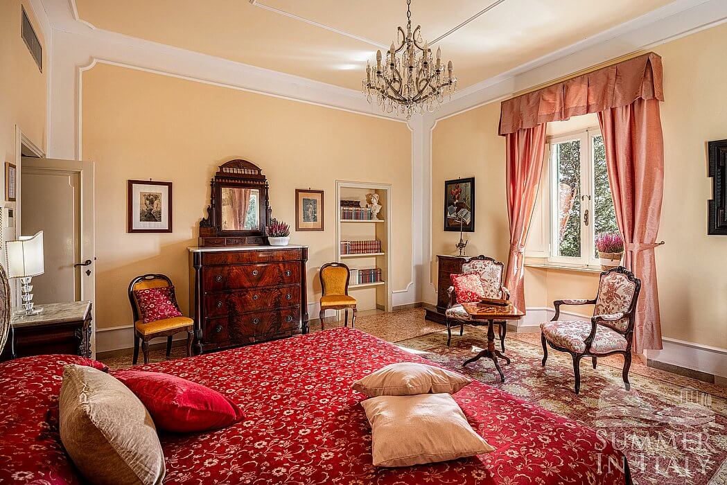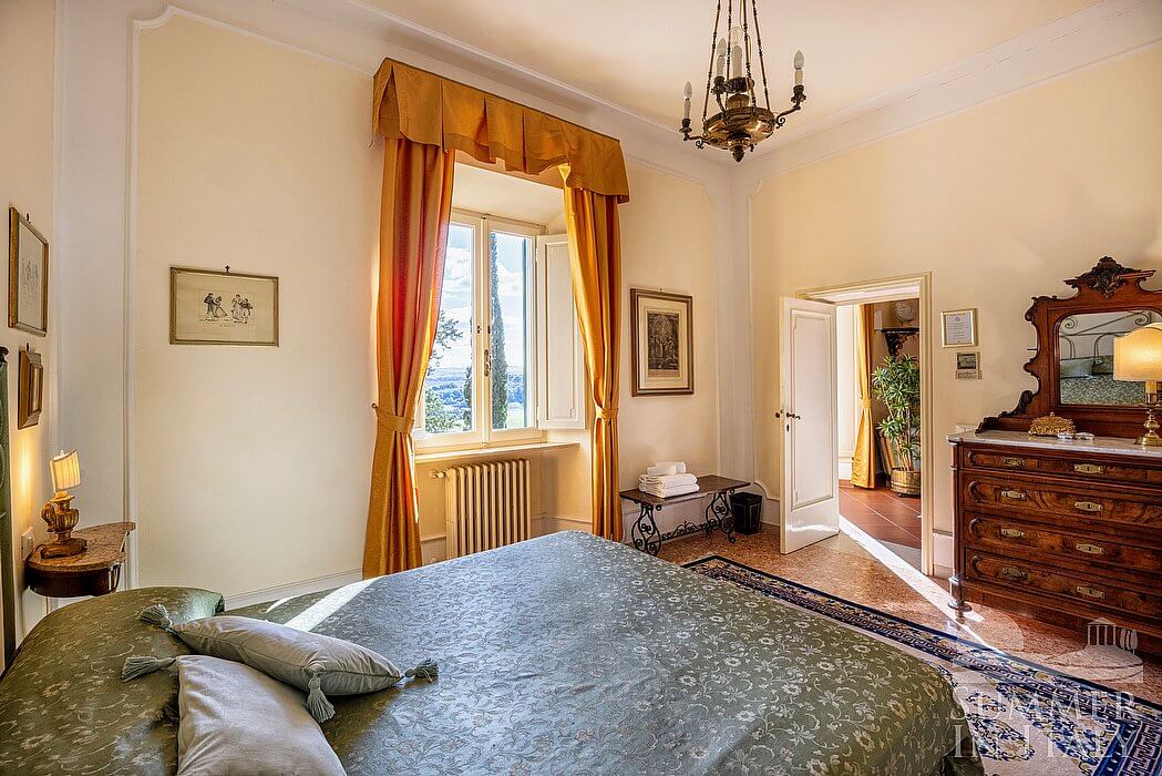 The third living room is paved with Tuscan terracotta tiles. The furnishings are elegant and welcoming, featuring some antique pieces, and include a sofa, three armchairs and a wood bench. From the living room you will be able to enter a small balcony with a view of the hills through a French door. The room has a window with a view of the greenery and of the hills.