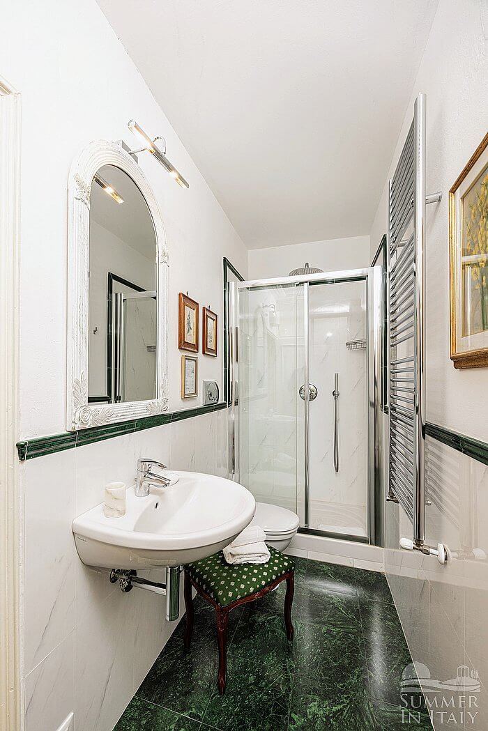 You will be able to enter the second bedroom from the corridor. The bedroom has a matrimonial bed (160 cm/63 inches, wider than a queen-size bed). The furnishings include two armchairs and a desk. The room has two windows with a view of the garden, and it's equipped with an air conditioning/heating unit. This bedroom has an en-suite bathroom, spacious and equipped with a washbasin, a toilet, a fully enclosed shower, a bathtub with shower wand and a hairdryer.