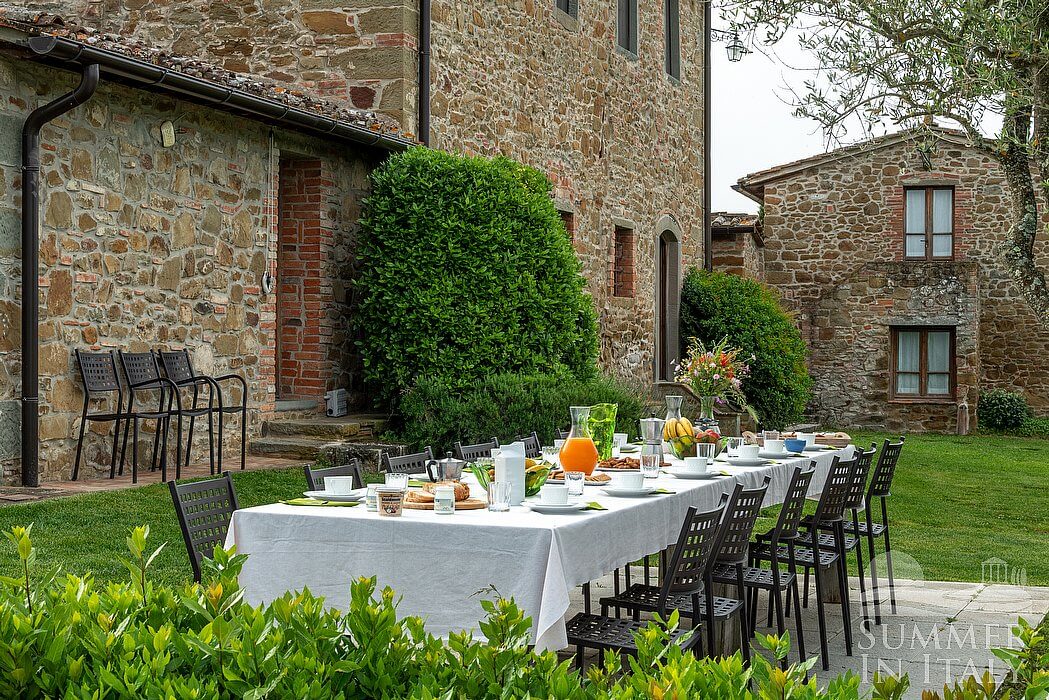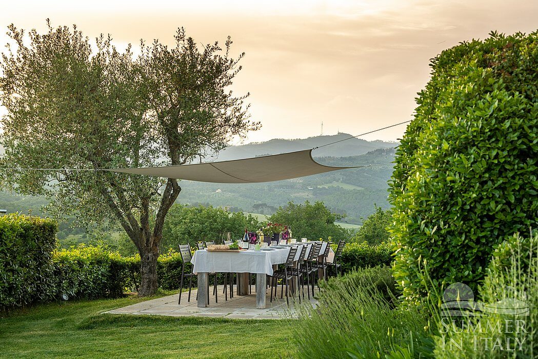 The garden is 1500 square meters (16200 square feet). It is partly shaded by a characteristic awning. It is equipped with tables and chairs. Here you will also find a barbecue and a small wood-fired pizza oven. From the garden you will enjoy a broad view of the valley, of Casal di Pari and of the Amiata Mount at a distance and of the hills.
