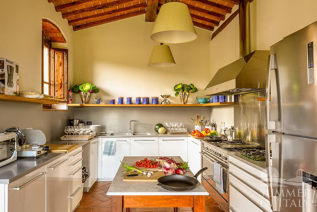 You will be able to enter the kitchen from the dining room. It is very well equipped, with a six-burner gas cooker, an electric oven, an American-style refrigerator with ice-maker, a dishwasher, a microwave oven, an Italian-style coffee-maker and a kettle. The kitchen has a window, and is equipped with underfloor cooling.
