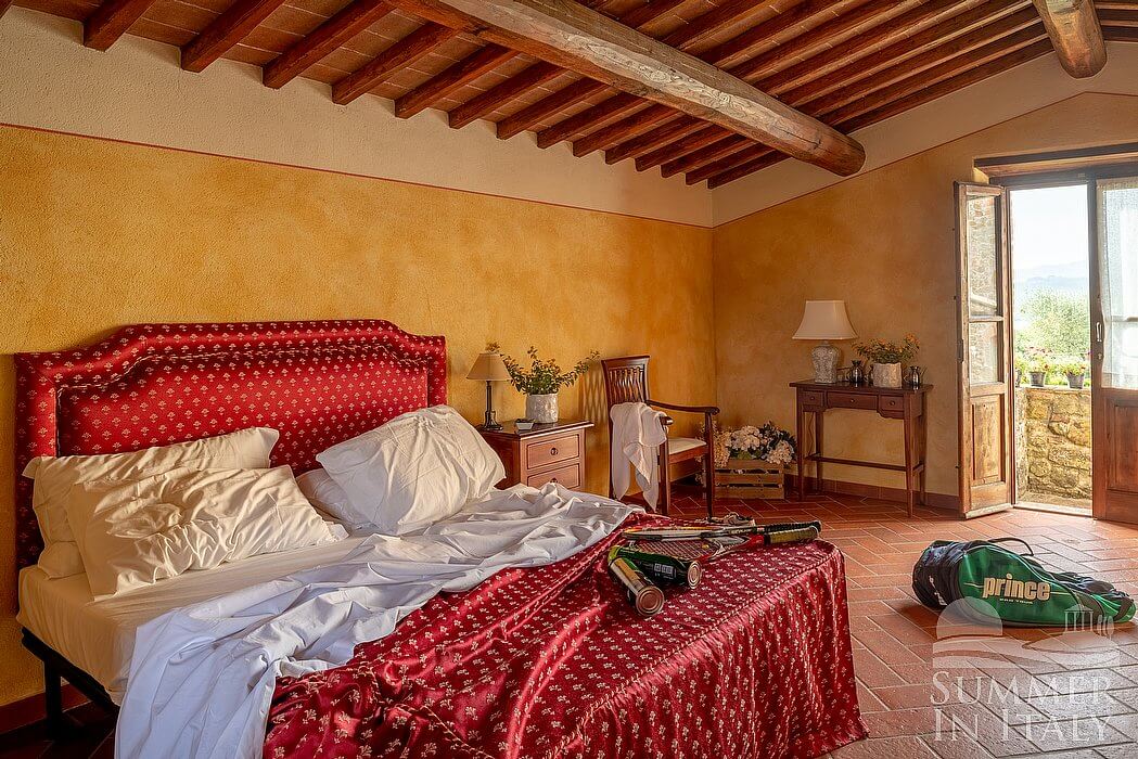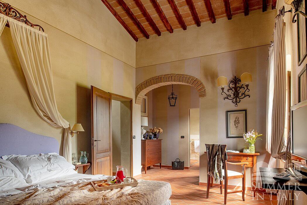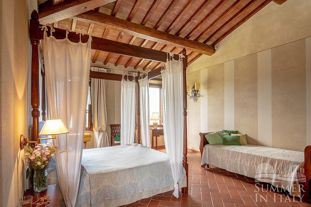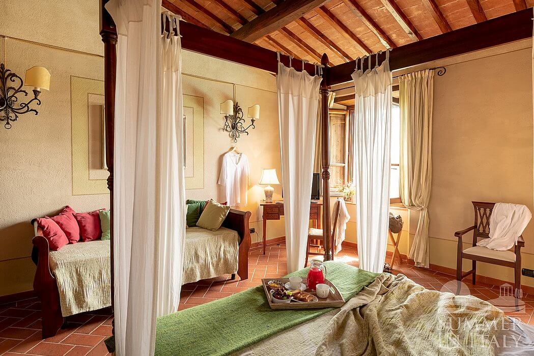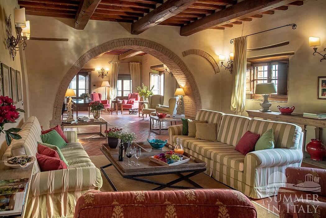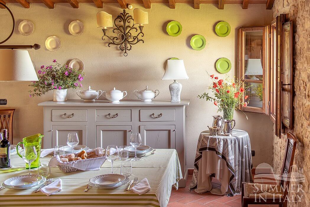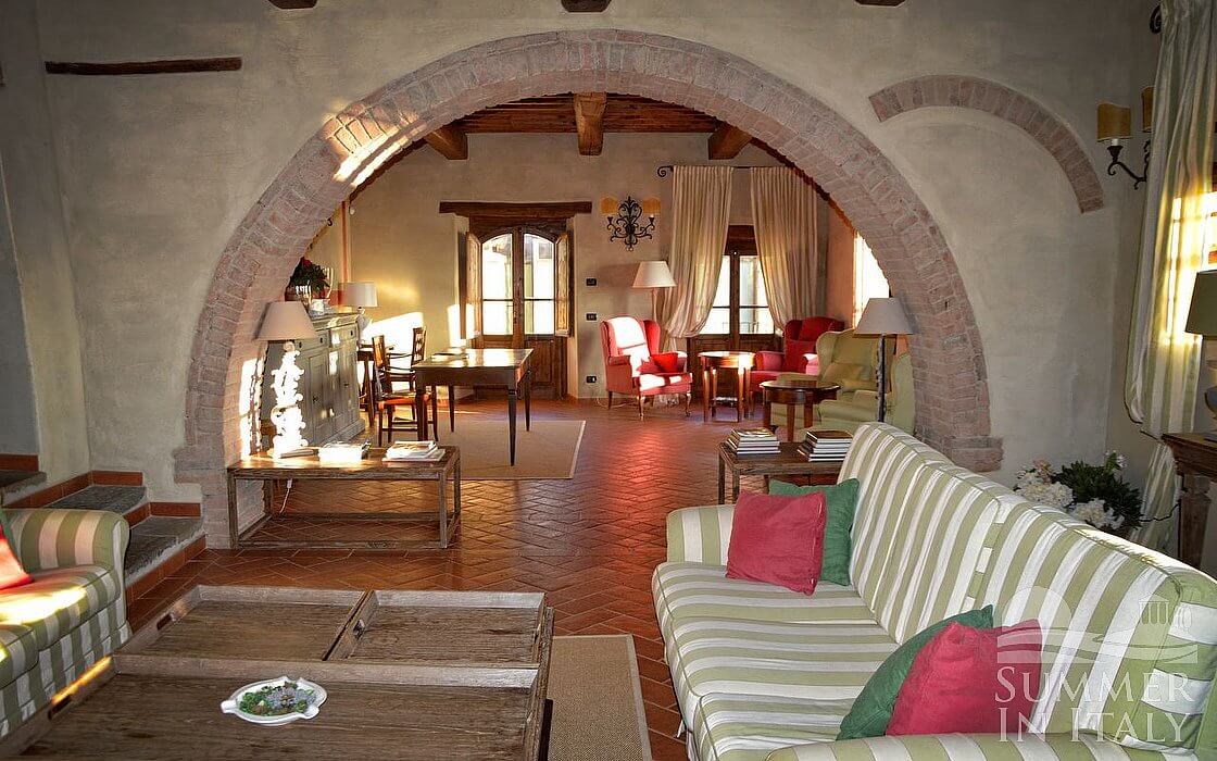 The living room is paved with Tuscan terracotta tiles. The ceiling has characteristic exposed wood beams. The furnishings are classic and welcoming, and include two sofas, armchairs and a desk. There is an age-old and impressive fireplace. From the living room you will be able to enter the garden through two French doors. The room also has four windows. It is equipped with underfloor cooling.