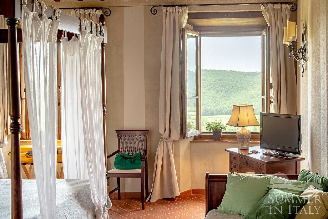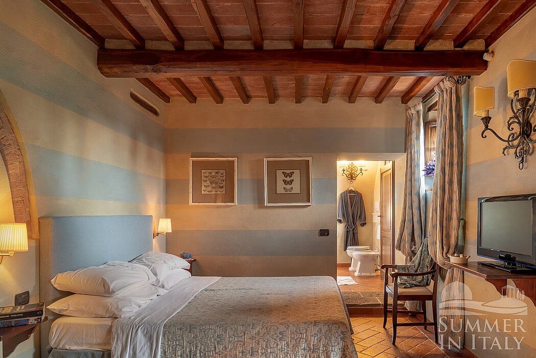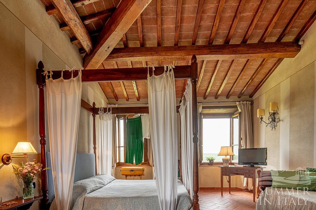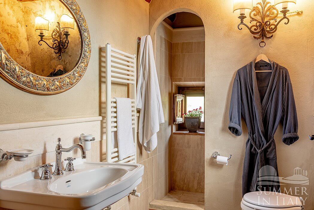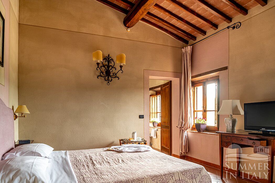 You will be able to enter the eighth bedroom through an access area. The bedroom has a matrimonial bed (160 cm/63 inches, wider than a queen-size bed), that can be split into twins if requested (please contact our staff in advance to make arrangements). In this room you will find a satellite television (local channels). The room has two windows, and it's equipped with underfloor cooling. This bedroom has an en-suite bathroom, equipped with a washbasin, a toilet, a shower and a hairdryer.
