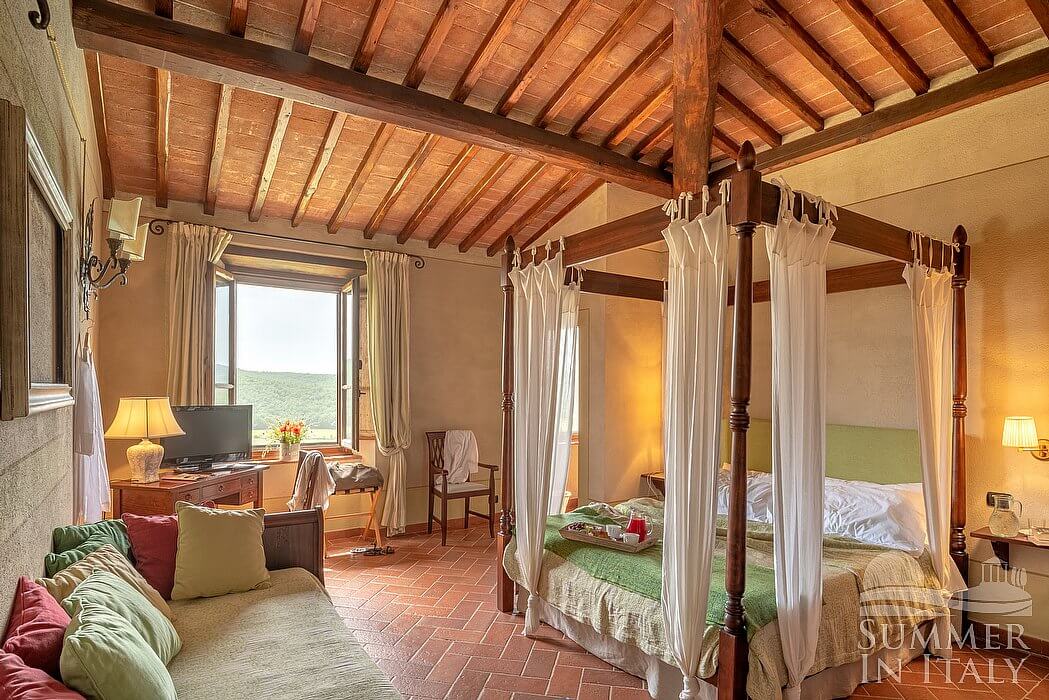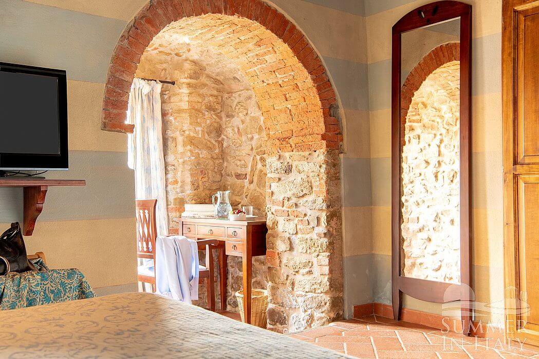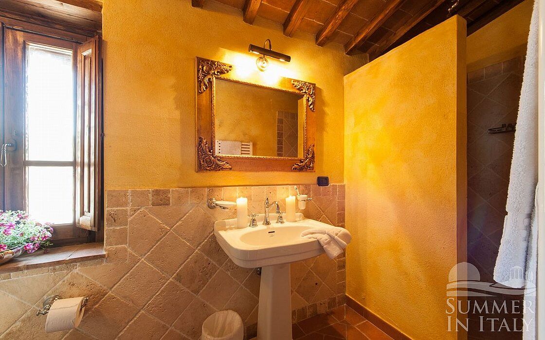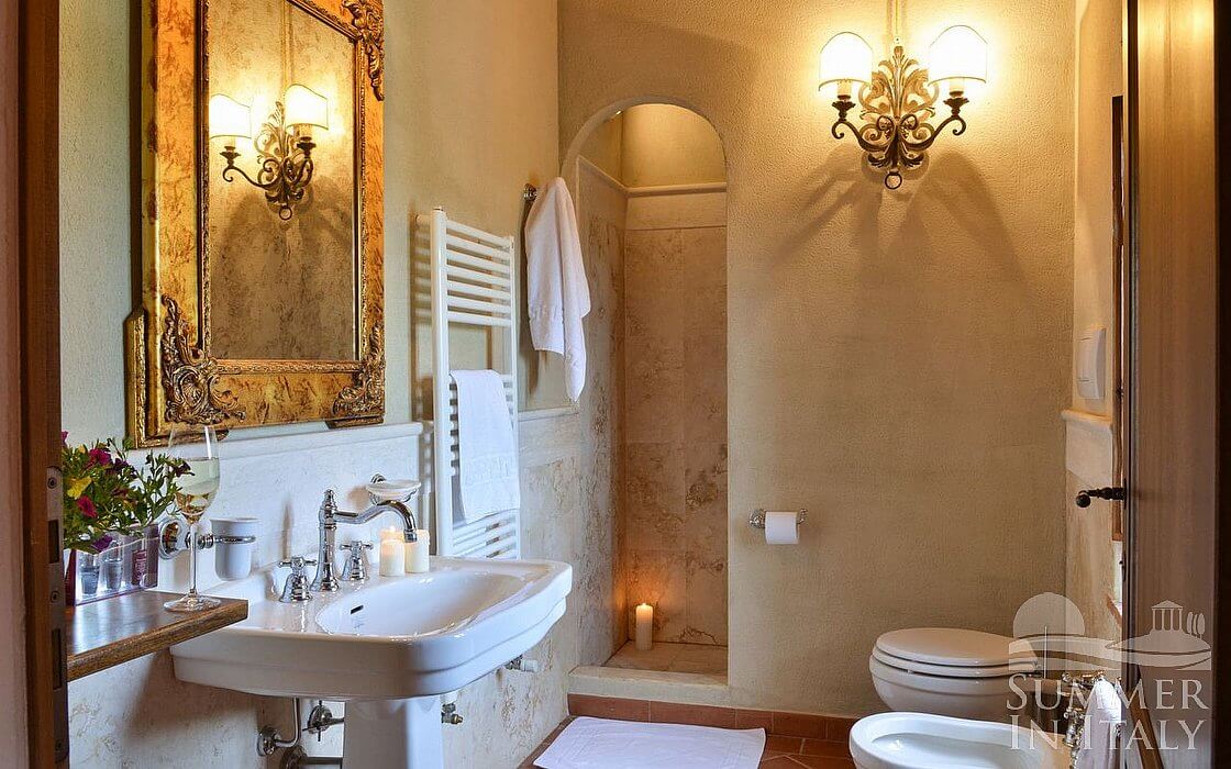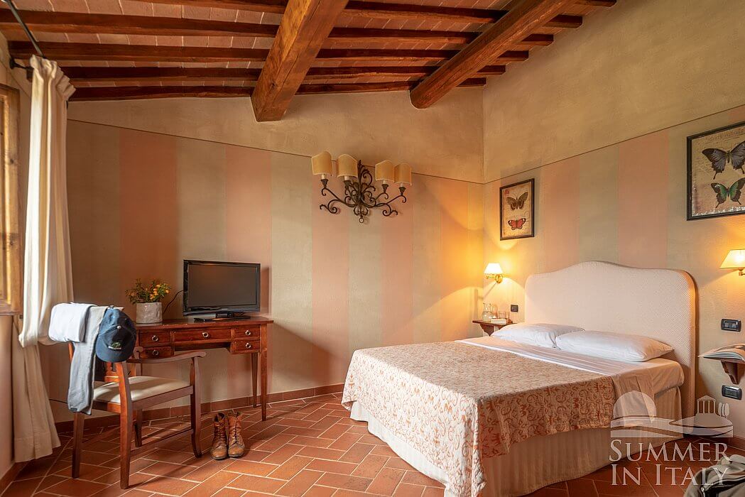 You will be able to enter the eighth bedroom through an access area. The bedroom has a matrimonial bed (160 cm/63 inches, wider than a queen-size bed), that can be split into twins if requested (please contact our staff in advance to make arrangements). In this room you will find a satellite television (local channels). The room has two windows, and it's equipped with underfloor cooling. This bedroom has an en-suite bathroom, equipped with a washbasin, a toilet, a shower and a hairdryer.