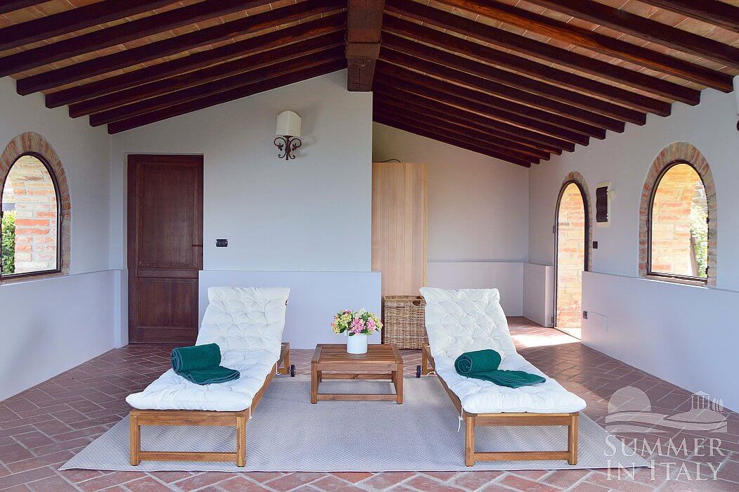 The swimming pool is 6 meters (20 feet) large by 12 meters (39 feet) long, 1.4 meters (4.6 feet) deep. The area is equipped with sun umbrellas, sun loungers, a gazebo and an external shower. This area is also equipped with small sofas and armchairs. From the swimming pool you will enjoy a fascinating view of the greenery and of the hills. The pool is open from mid-April until mid-October.