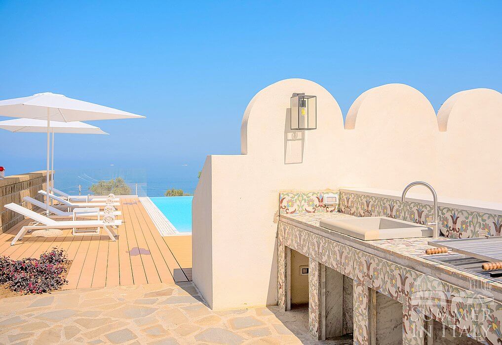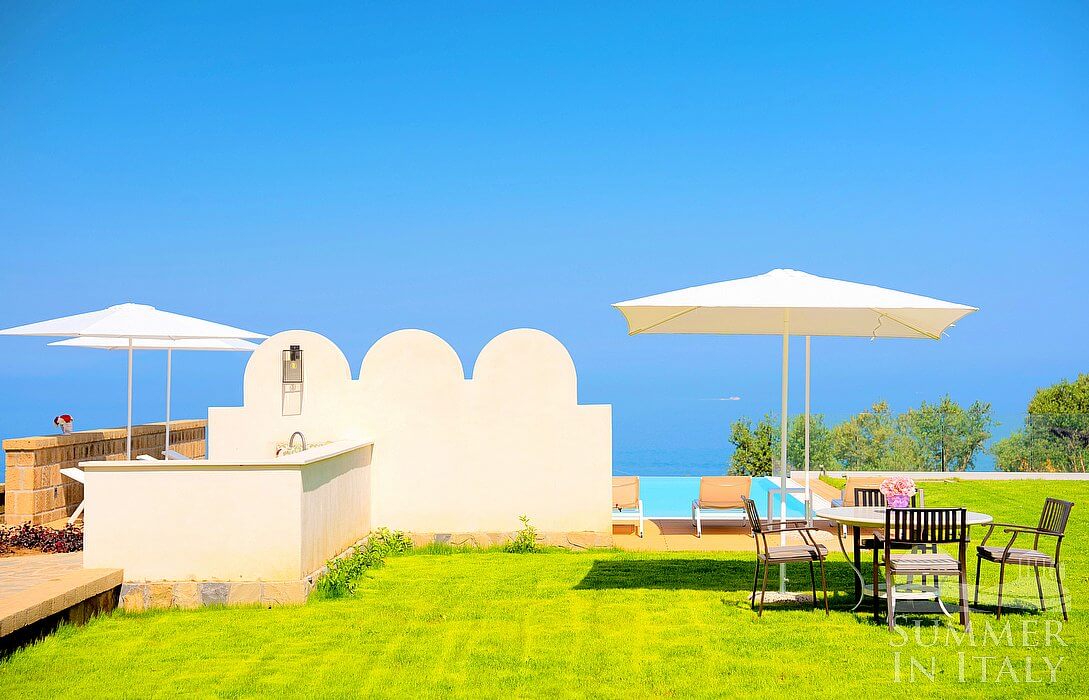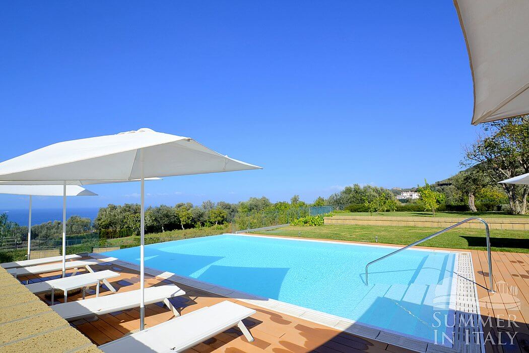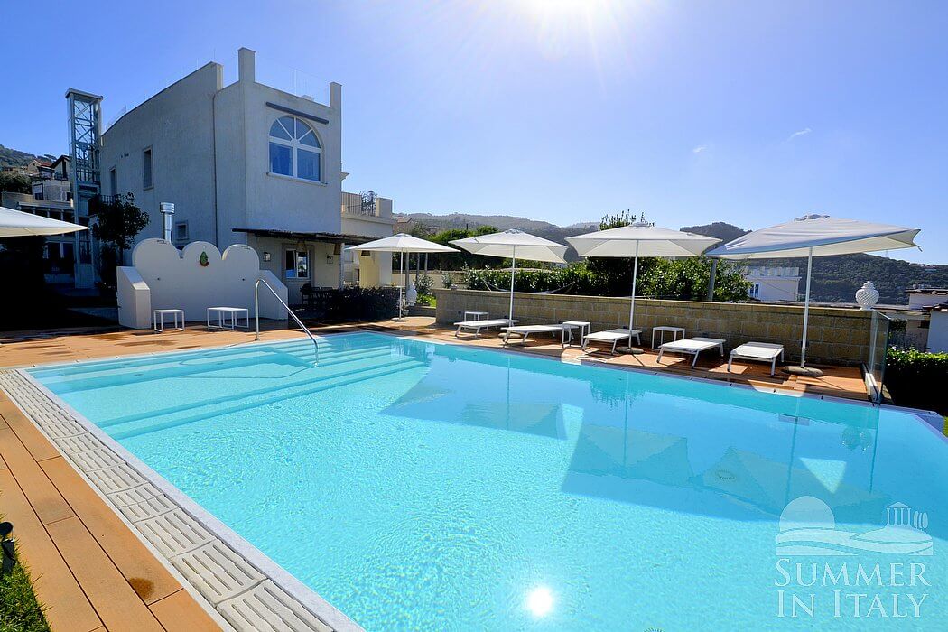 The swimming pool is 6 meters (20 feet) large by 9 meters (30 feet) long, 1.5 meters (5 feet) deep. It is an infinity pool and can be heated if requested (additional cost applies -- please enquire with our staff). The area is equipped with sun umbrellas, sun loungers and external showers. From the swimming pool you will enjoy a wonderful view of the sea. The pool is open from the beginning of April until the end of October.