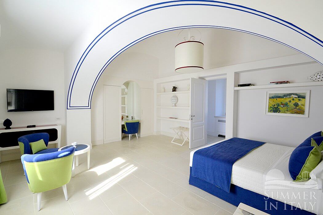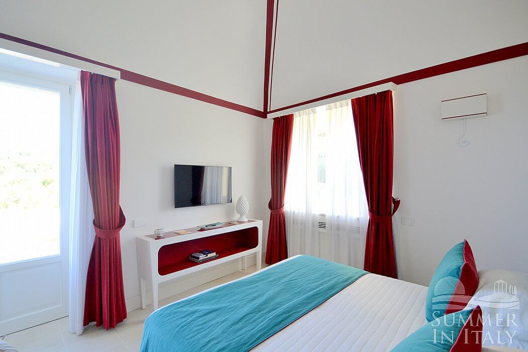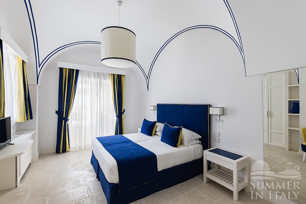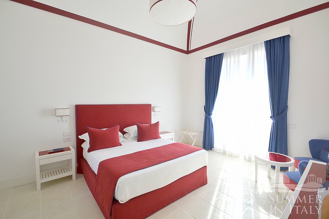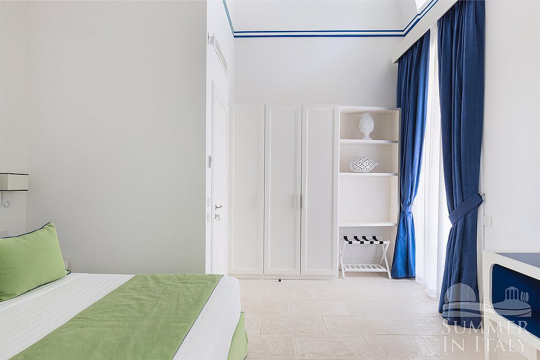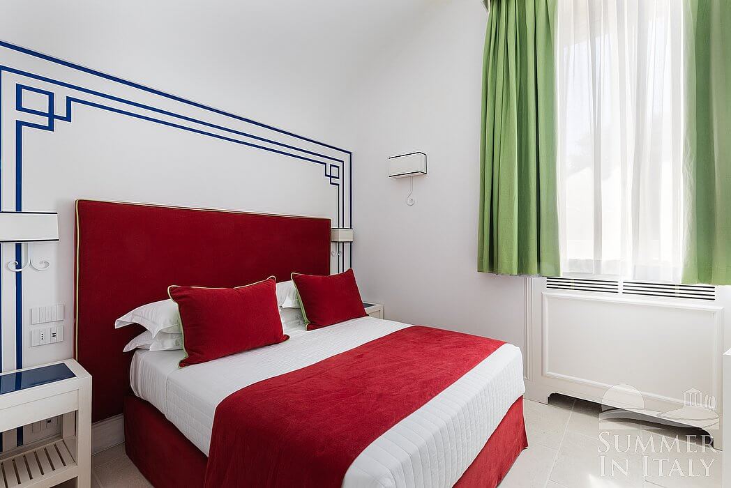 You will be able to enter the ninth bedroom from a corridor climbing 12 steps. The bedroom has a matrimonial bed (160 cm/63 inches, wider than a queen-size bed). In this room you will find a satellite smart TV. From the bedroom you will be able to enter a terrace equipped with table and chairs, going down approximately two steps, through a French door. The room also has a window, and it's equipped with an air conditioning/heating unit, and you will also find a safe and a mini refrigerator. This bedroom has an en-suite bathroom, equipped with a washbasin, a toilet, a fully enclosed shower and a hairdryer.