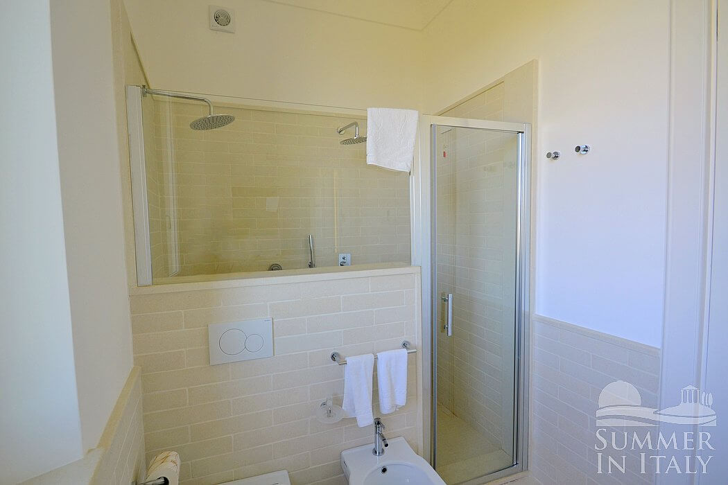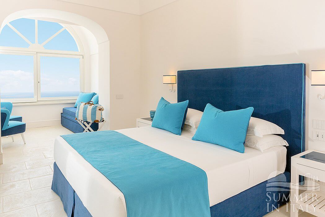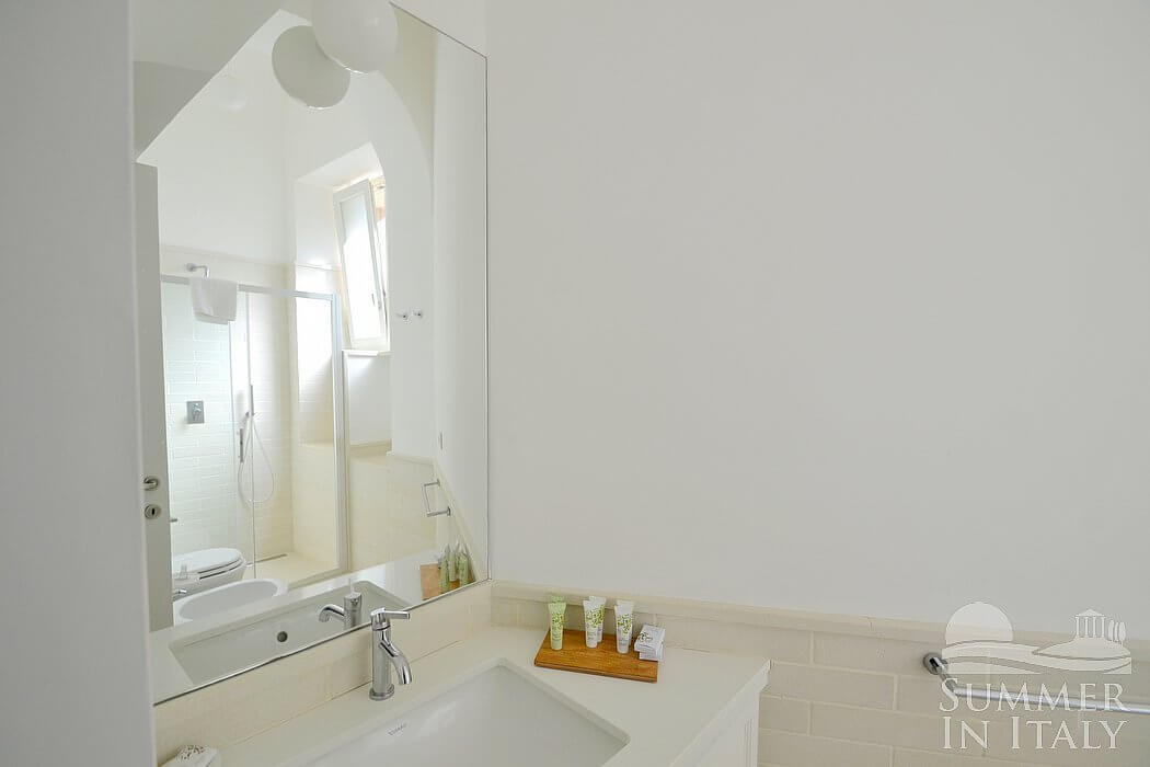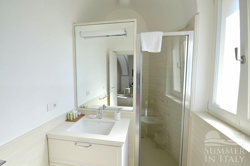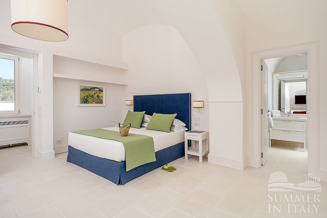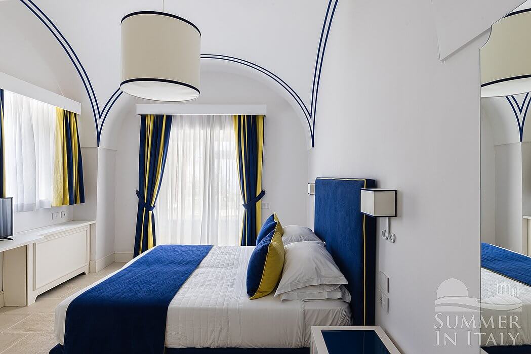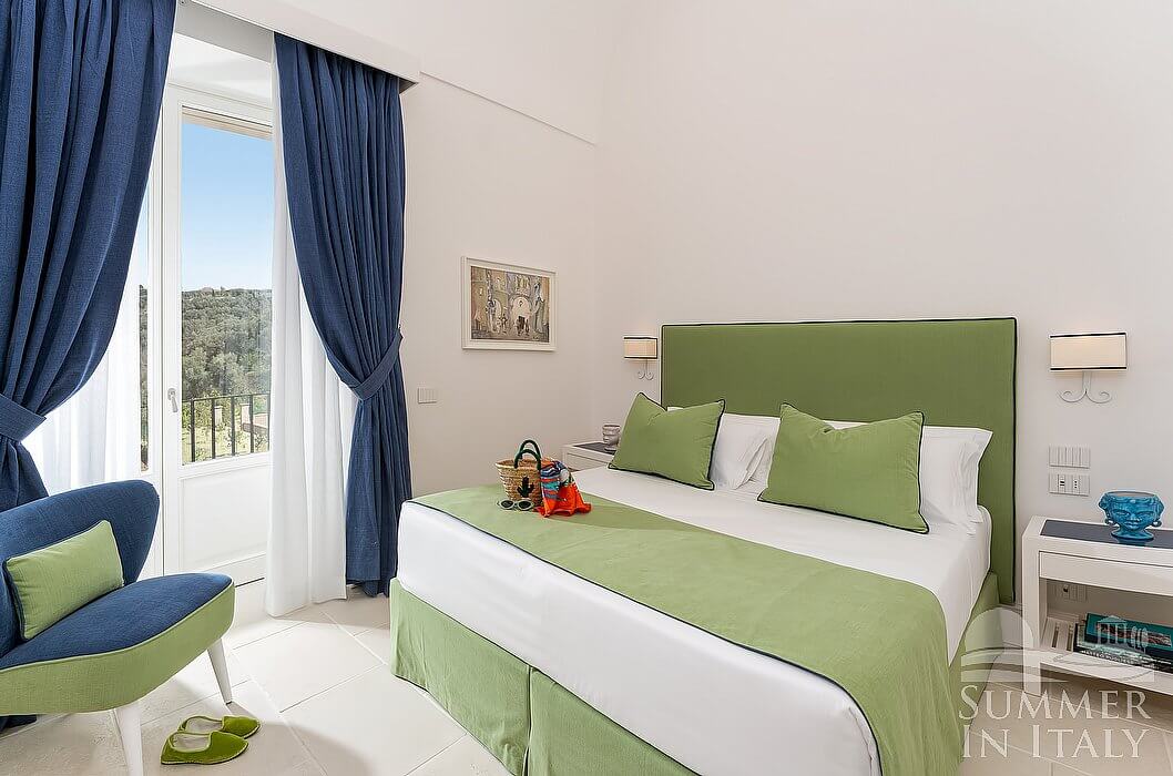 You will be able to enter the ninth bedroom from a corridor climbing 12 steps. The bedroom has a matrimonial bed (160 cm/63 inches, wider than a queen-size bed). In this room you will find a satellite smart TV. From the bedroom you will be able to enter a terrace equipped with table and chairs, going down approximately two steps, through a French door. The room also has a window, and it's equipped with an air conditioning/heating unit, and you will also find a safe and a mini refrigerator. This bedroom has an en-suite bathroom, equipped with a washbasin, a toilet, a fully enclosed shower and a hairdryer.