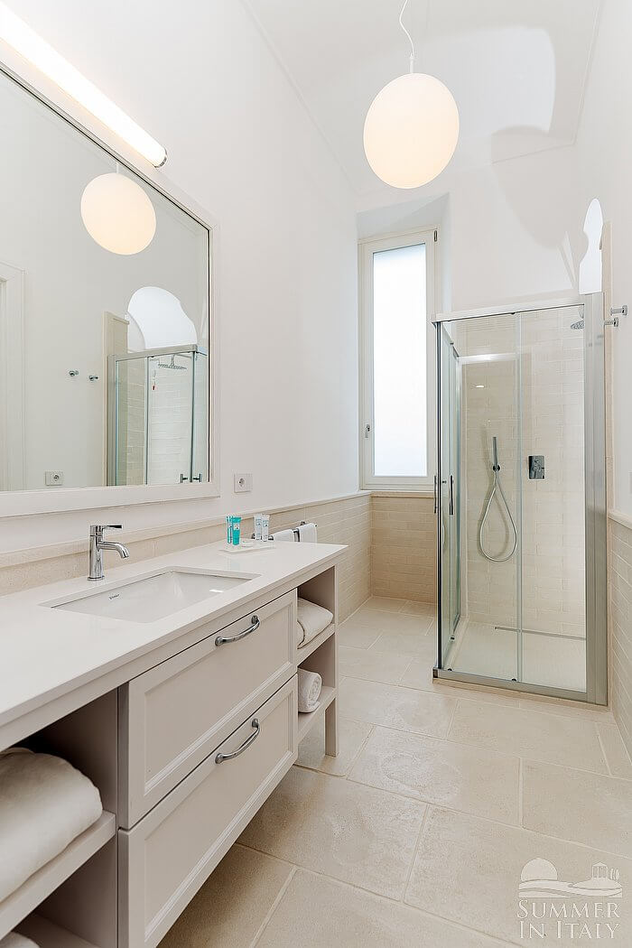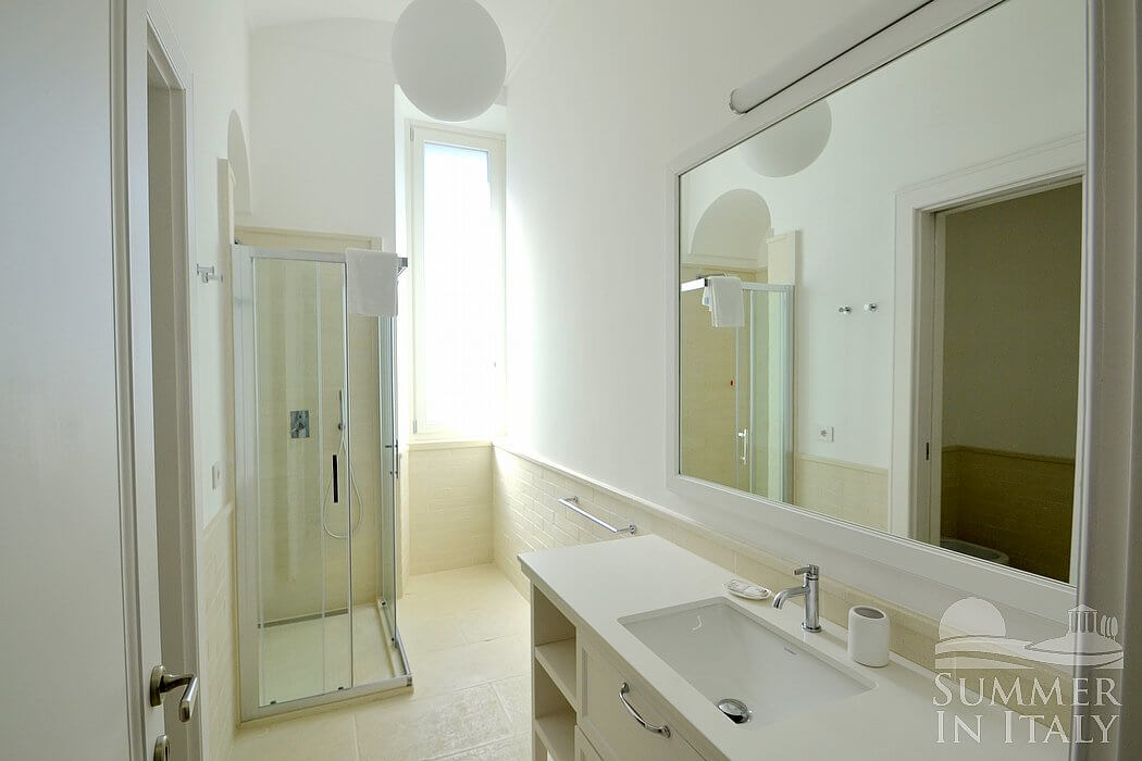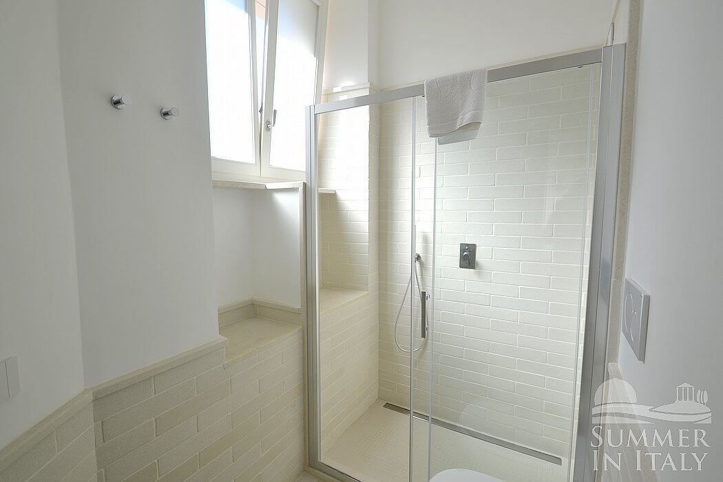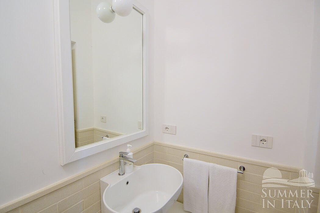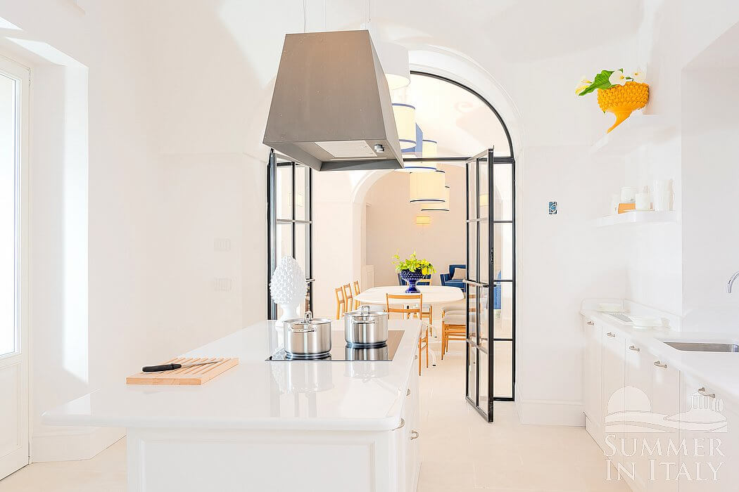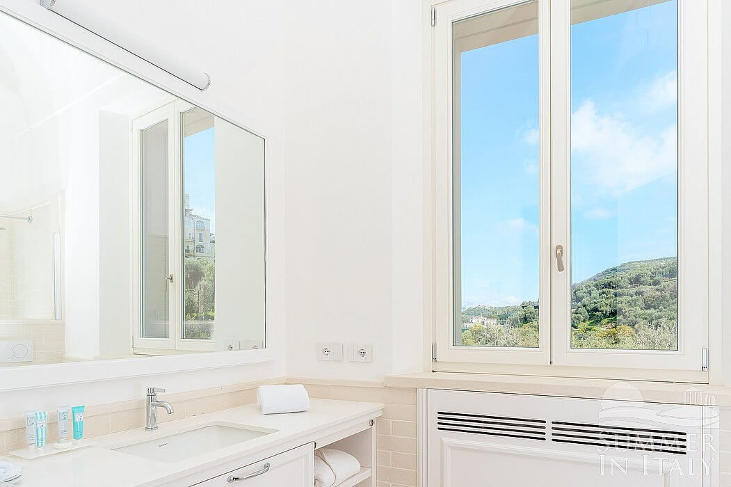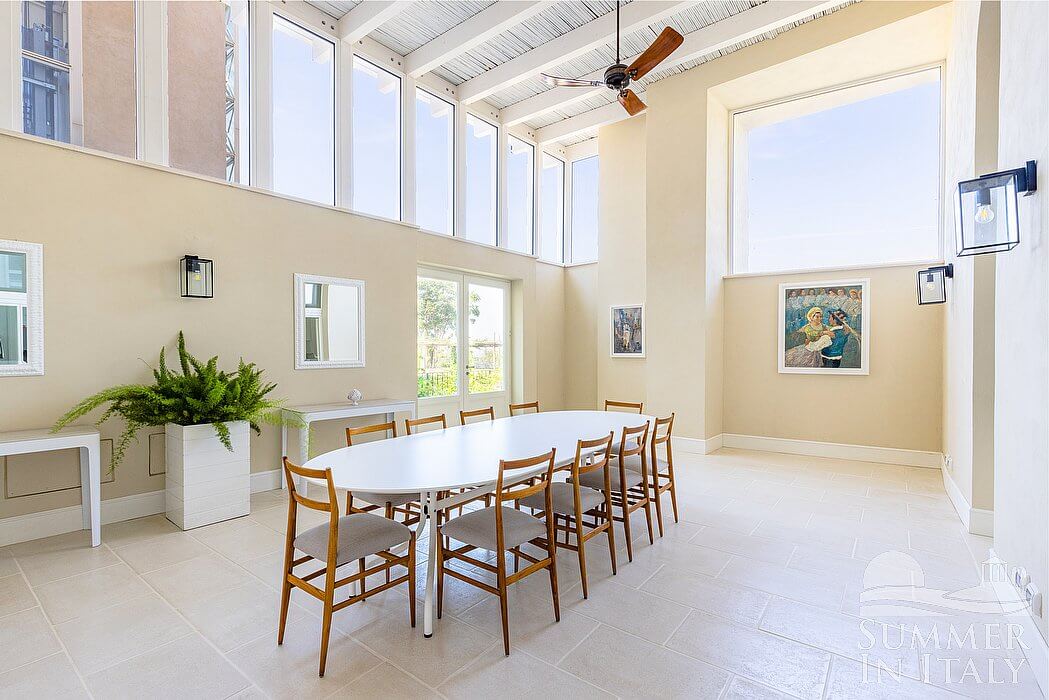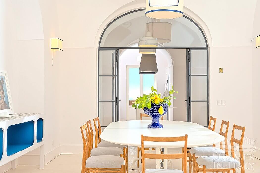 You will be able to enter the second living room from the entrance hall climbing five steps. The ceiling is vaulted. The furnishings are elegant and bright, and include two sofas. The dining table can accommodate 12 guests. In this room you will find a satellite smart TV. The room has a window. It is equipped with an air conditioning/heating unit. In the living room of Villa Siri you will find an elevator that will take you to the first floor.