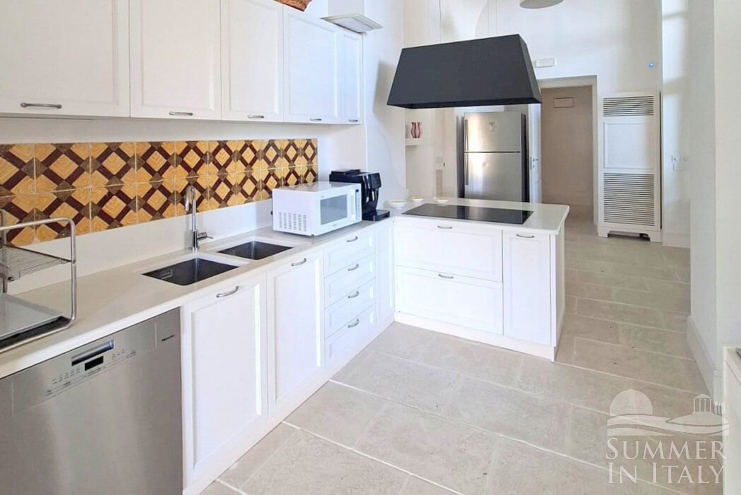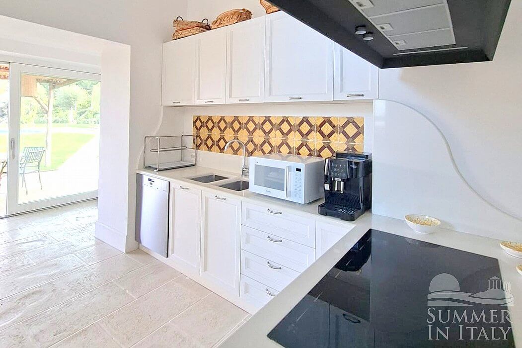 You will be able to enter the second kitchen from the second living room through an access area. It is equipped with a six-burner induction cooker, an electric oven, a refrigerator with freezer, a dishwasher, a microwave oven, an Italian-style coffee-maker, an American-style coffee-maker and a kettle. From the kitchen a French door will take you to the second patio. The kitchen is equipped with an air conditioning/heating unit.