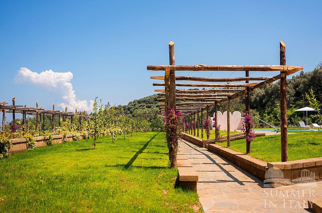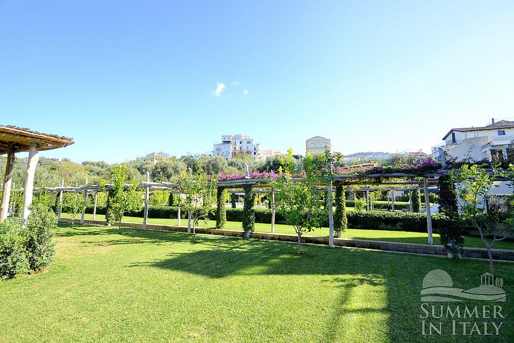 The garden is 3000 square meters (32300 square feet). It is partly shaded by a characteristic bougainvillea pergola and by a pergola with a bamboo roof. The garden is equipped with a small sofa, as well as with tables and chairs. In the garden you will find a fitness area equipped with an exercise bike, a treadmill and a fitness bench. From the garden you will enjoy a lovely view of the sea and of the island of Capri. In the garden you will also find an area where vegetables are grown and you will be able to pick up available vegetables according to the season.