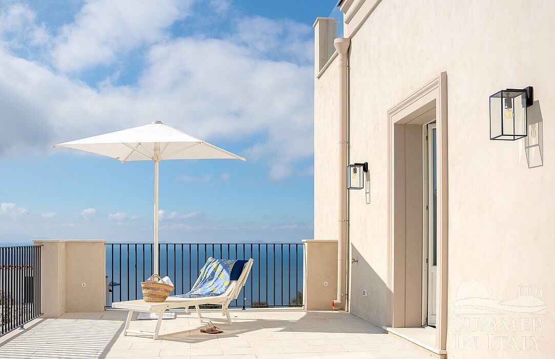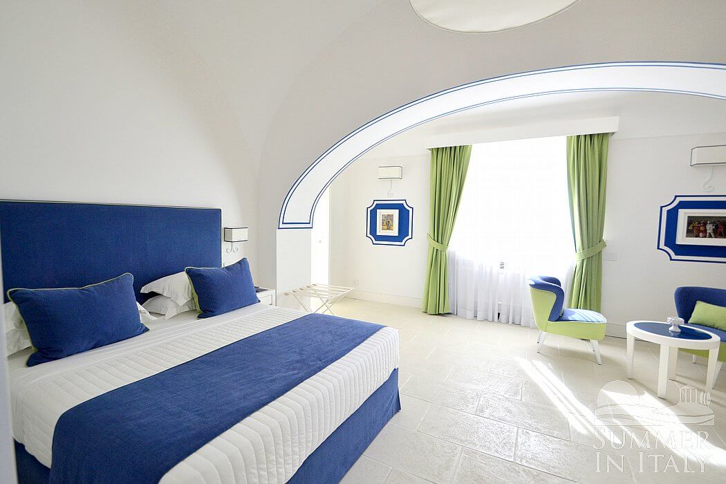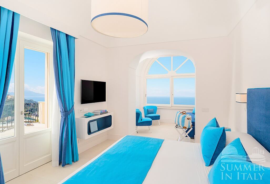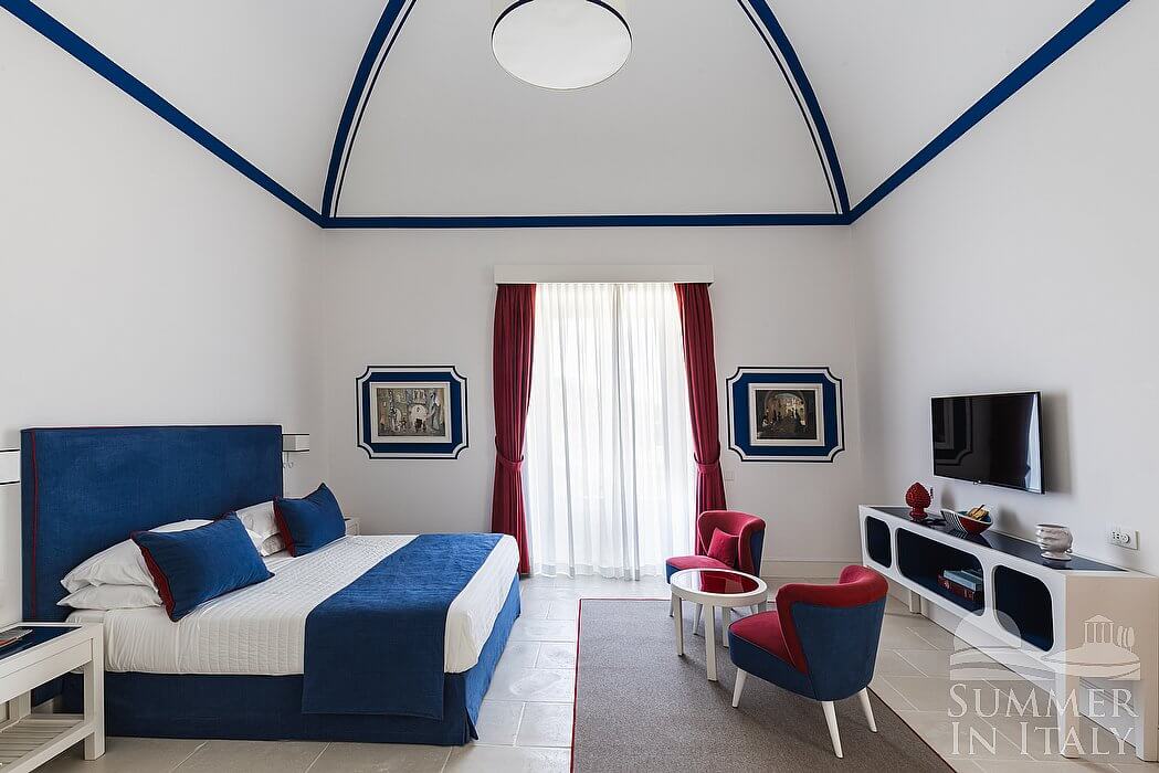 This suite is made up by three interconnected rooms: a sleeping area, a sitting area and a bathroom. You will be able to enter the fourth bedroom through a corridor. The bedroom has a matrimonial bed (160 cm/63 inches, wider than a queen-size bed). The furnishings include two bedroom chairs and a divan that unfolds into a double bed (available upon request with an additional cost -- please contact our staff in advance). In this room you will find a satellite smart TV. From the bedroom you will be able to enter a terrace, which is equipped with sun loungers and a sun umbrella, with a view of the sea through a French door. The room also has a large panoramic arched window, and it's equipped with an air conditioning/heating unit, and you will also find a safe and a mini refrigerator. This bedroom has an en-suite bathroom, equipped with a washbasin, a toilet, a large shower and a hairdryer.
