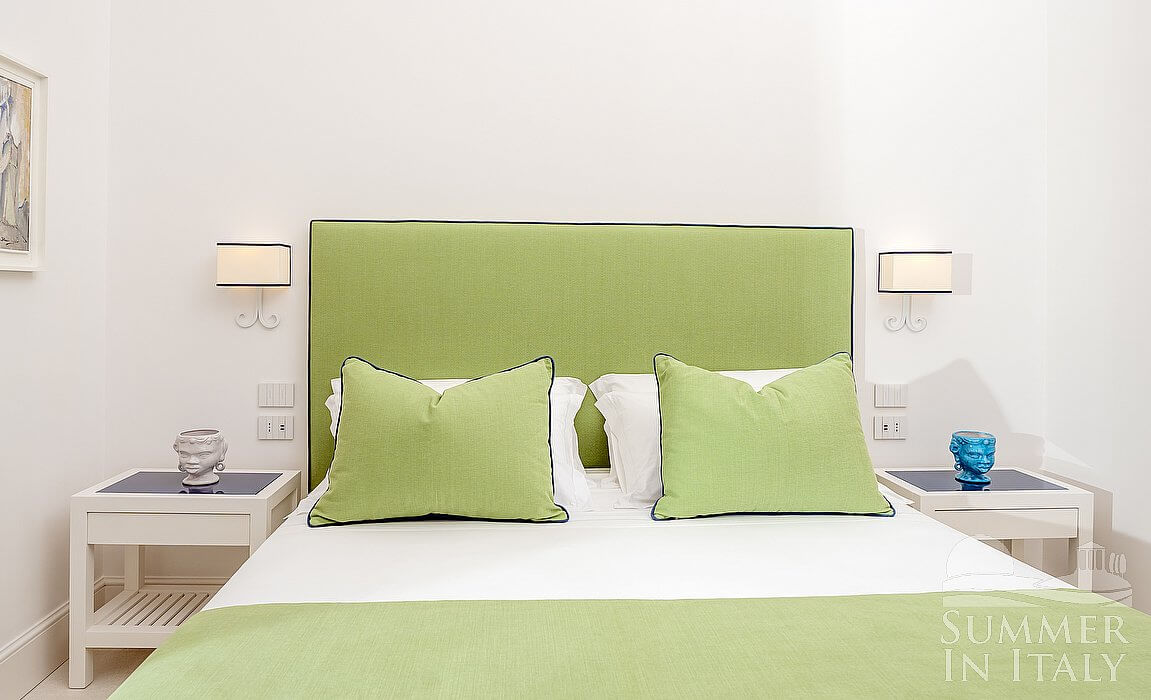 You will be able to enter the fifth bedroom through a corridor. The bedroom has a matrimonial bed (160 cm/63 inches, wider than a queen-size bed), that can be split into twins if requested (please contact our staff in advance to make arrangements). The furnishings include a bedroom chair. In this room you will find a satellite smart TV. From the bedroom you will be able to enter a small balcony through a French door. The bedroom is equipped with an air conditioning/heating unit, and you will also find a safe and a mini refrigerator. This bedroom has an en-suite bathroom, equipped with a washbasin, a toilet, a fully enclosed shower and a hairdryer.