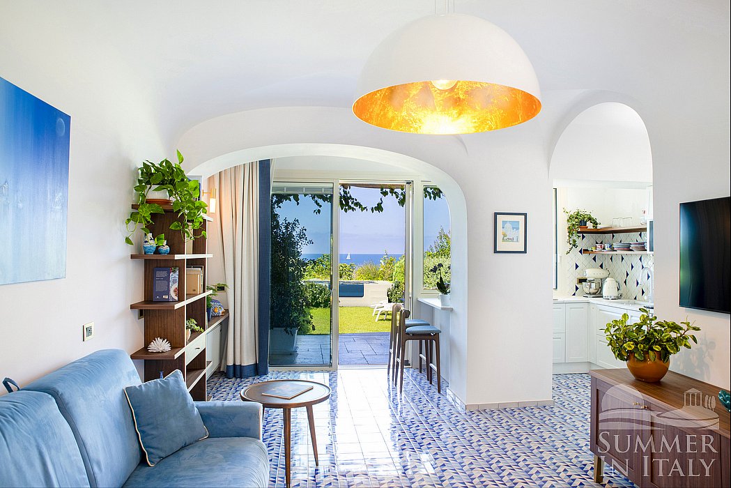 The living room is paved with tiles with inlaid designs. The ceiling is vaulted. The furnishings are elegant and bright, and include a divan that unfolds into a double bed. In the living room you will also find a cooking area. The kitchenette is equipped with a four-burner electric cooker, an electric oven, a refrigerator with freezer, a dishwasher, a microwave oven, an Italian-style coffee-maker, a toaster and a kettle. There is also a washing machine (hidden in a cabinet), an iron and an ironing board. The dining table is a little kitchen peninsula, and can accommodate two guests. In this room you will find a satellite smart TV. From the living room you will be able to enter the garden through a French door. The room also has two windows. It is equipped with an air conditioning/heating unit.