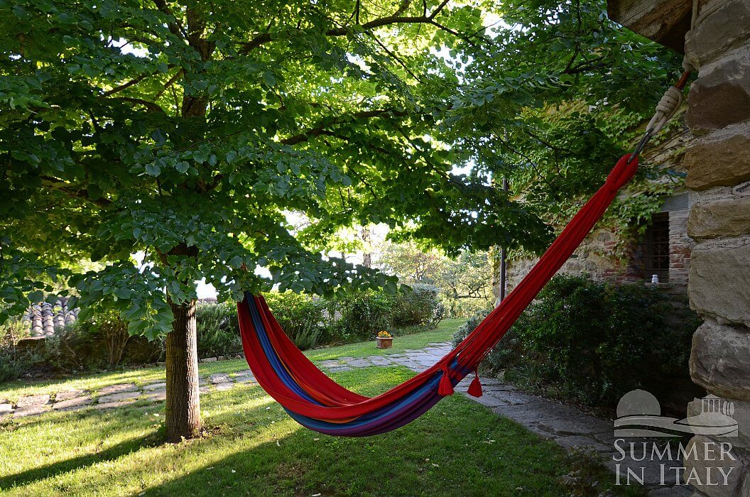 The garden is 90 square meters (970 square feet). It is partly shaded by tall trees. The garden is equipped with wood benches, as well as with tables, chairs, a sun umbrella and an hammock. Here you will also find a brickwork barbecue. From the garden you will enjoy a spellbinding view of the lake and of the greenery.