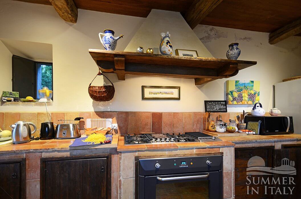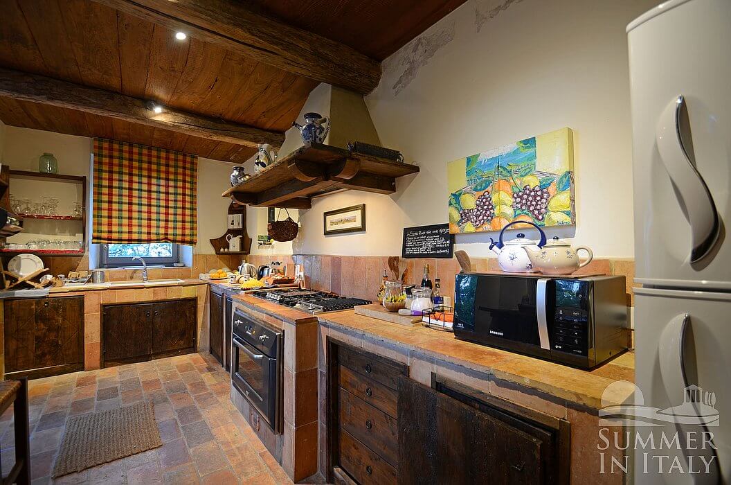 You will be able to enter the kitchen from the living room. It is equipped with a five-burner gas cooker, an electric oven, a refrigerator with freezer, a dishwasher, a microwave oven, an Italian-style coffee-maker, an American-style coffee-maker and a kettle. From the kitchen a French door will take you to the garden. The room has a window, as well as two small high windows.