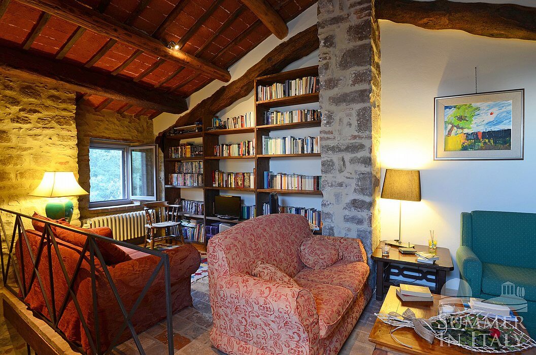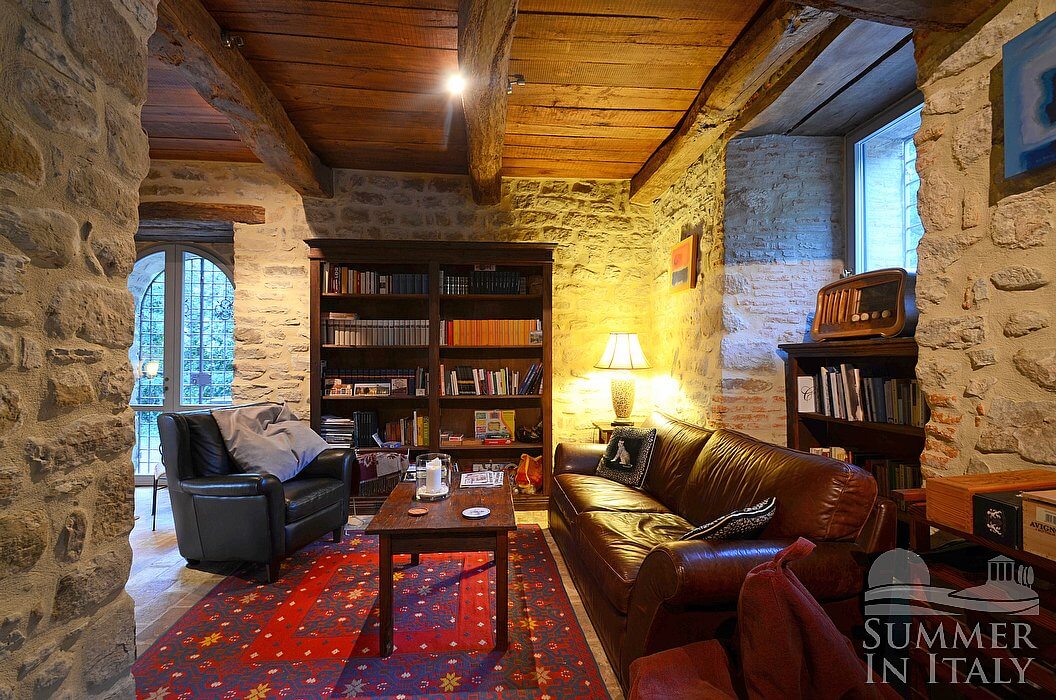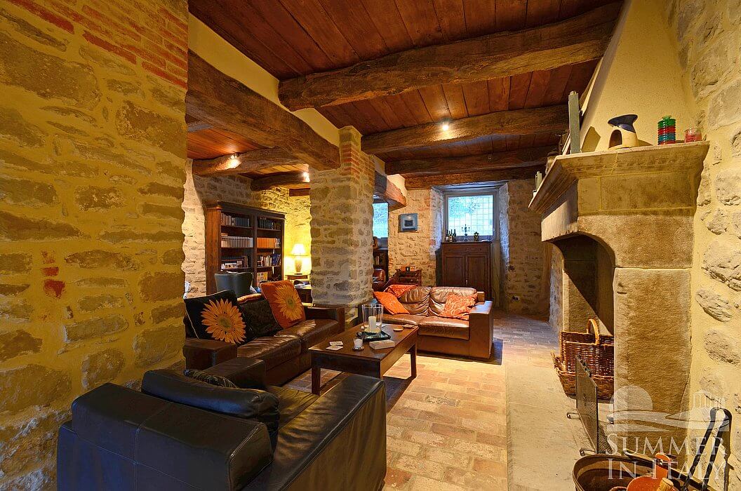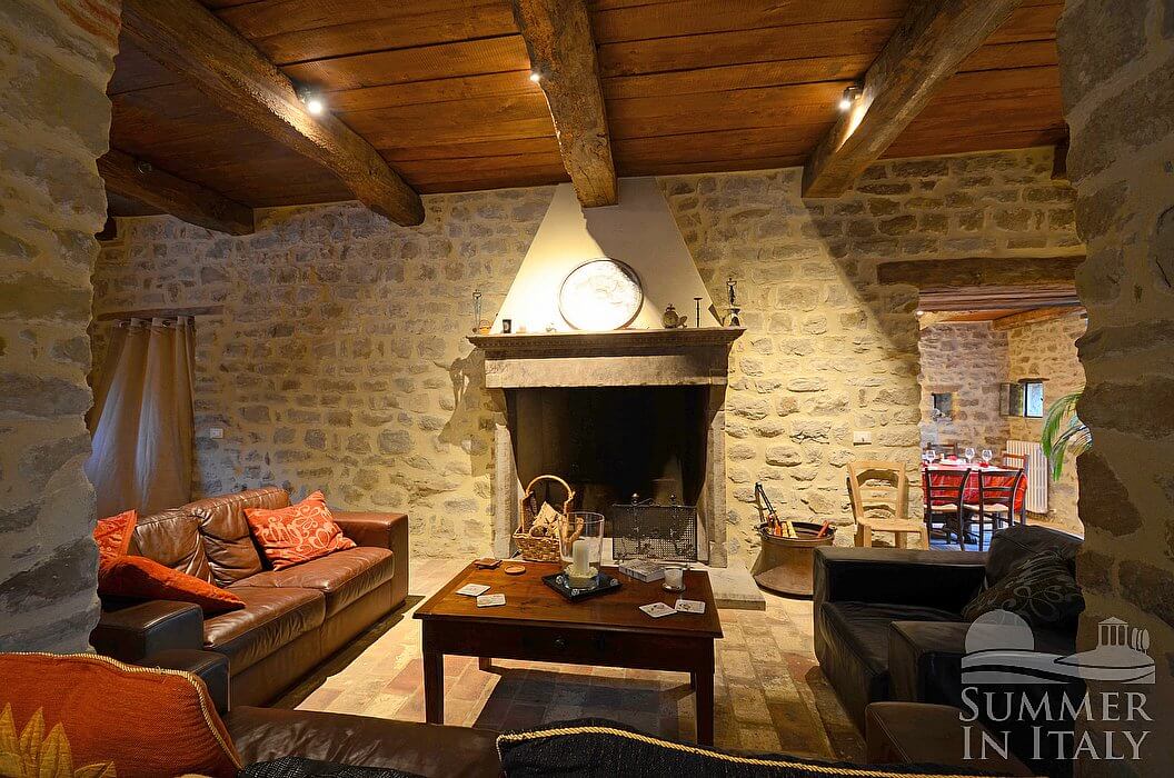 The first living room is paved with terracotta tiles. The ceiling is made of wood. The furnishings are warm and welcoming, and include three leather sofas and two armchairs. There is a big and age-old fireplace made of stone. From the living room you will be able to enter the garden through a French door. The room also has two windows.