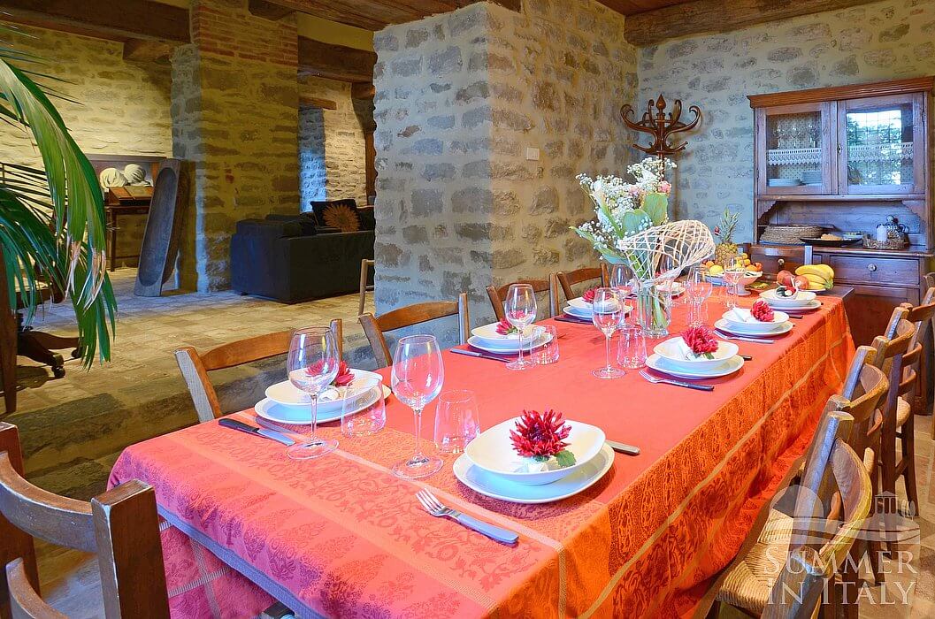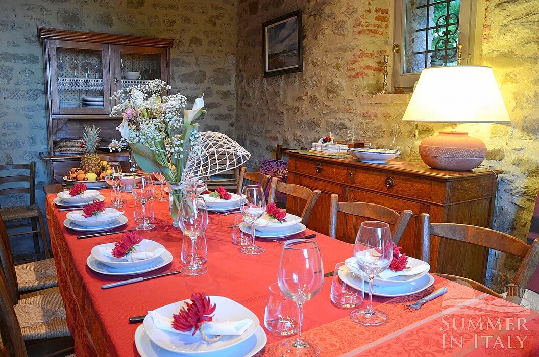 You will be able to enter the dining room from the living room through a cased opening, going down two steps. The furnishings are warm and welcoming. The dining table can accommodate ten guests. From the dining room you will be able to enter the garden, climbing two steps, through a French door. The room also has two small windows.