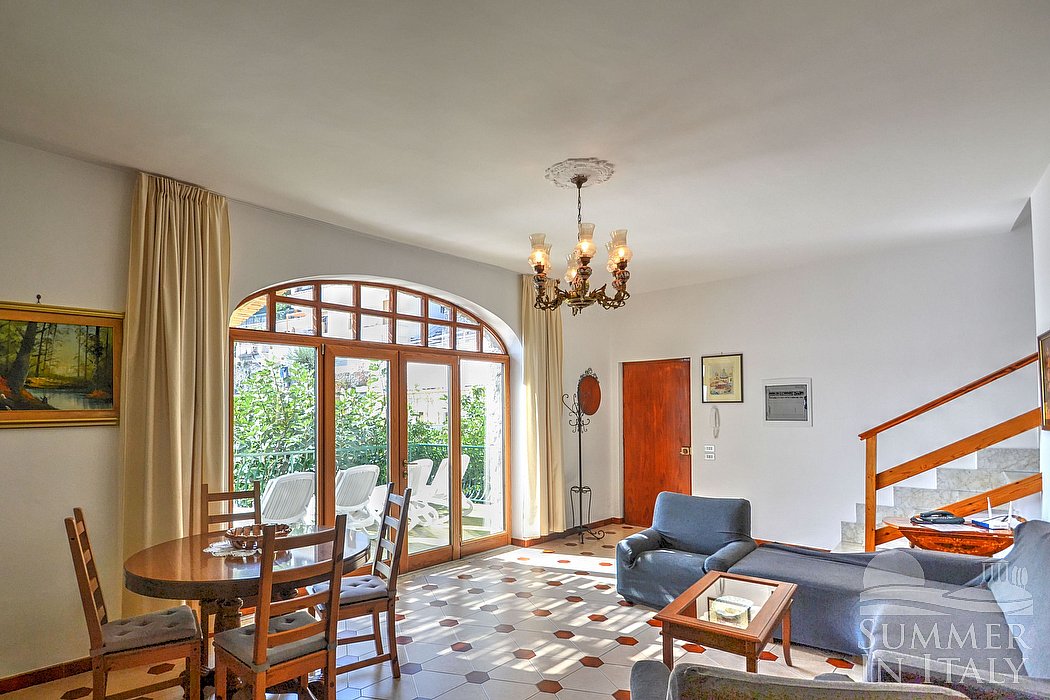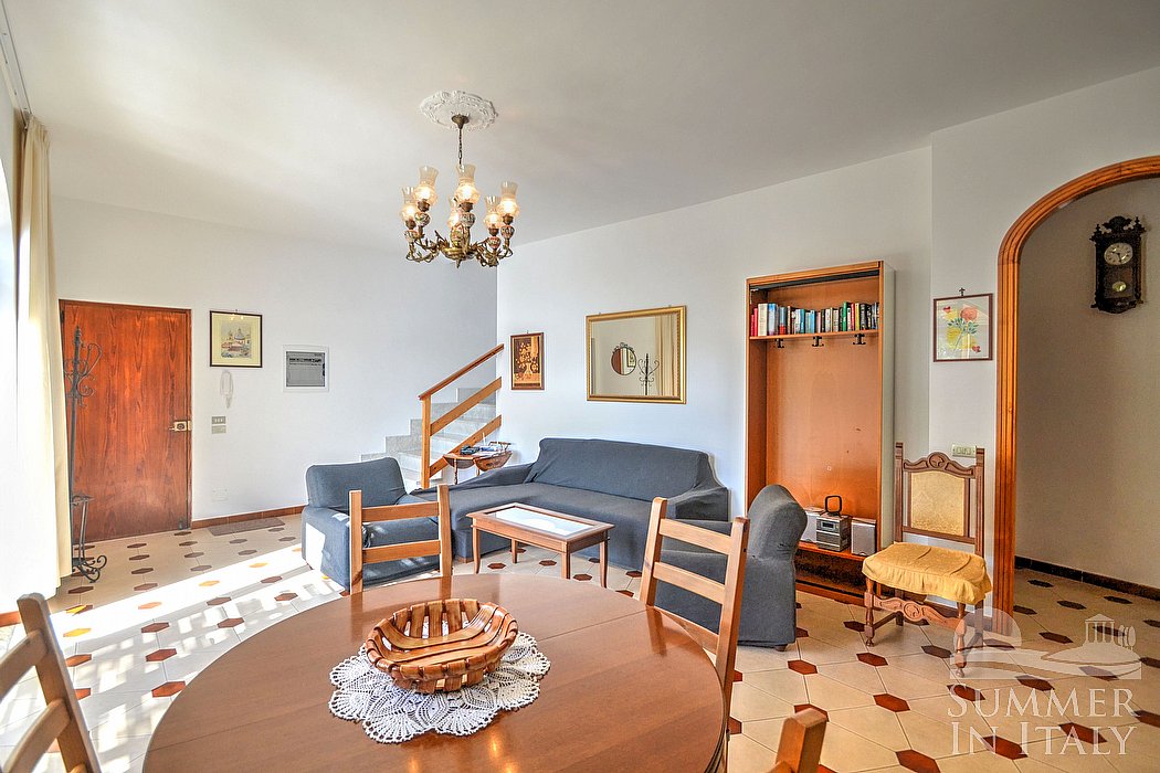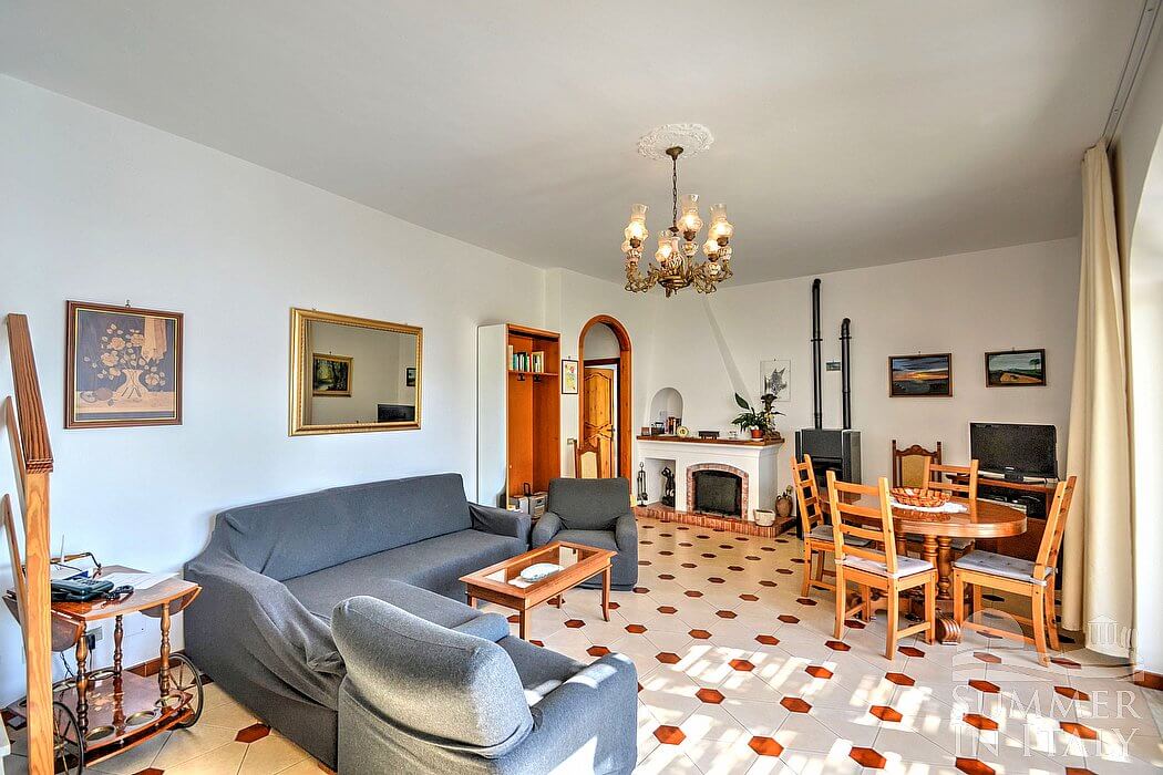 The furnishings of the living room are classic and welcoming. The furnishings include a sofa and two armchairs. There is a nice fireplace. The dining table can accommodate six guests. In this room you will find a television (local channels). From the living room you will be able to enter the terrace with a marvelous view of the sea through a French door.