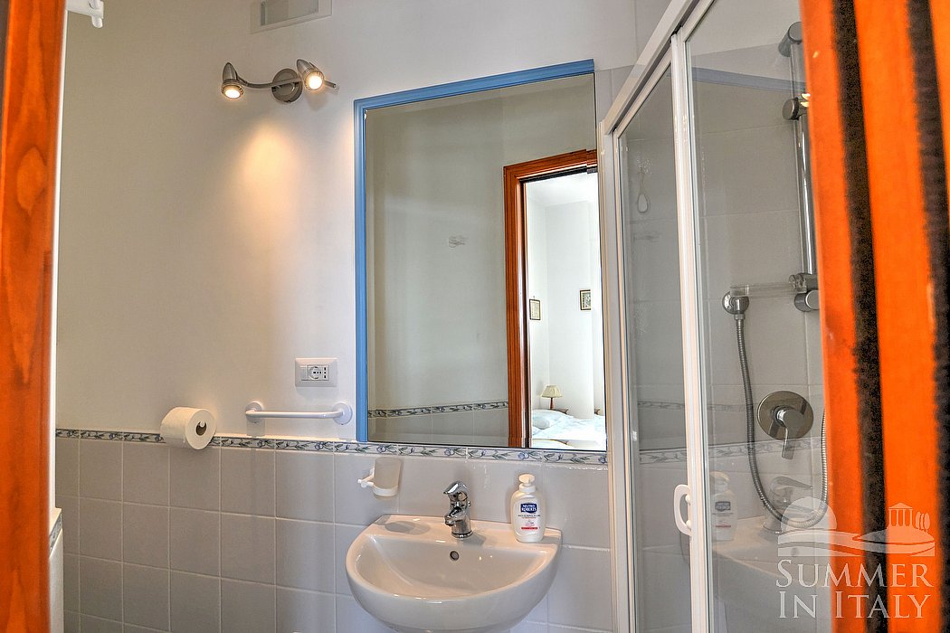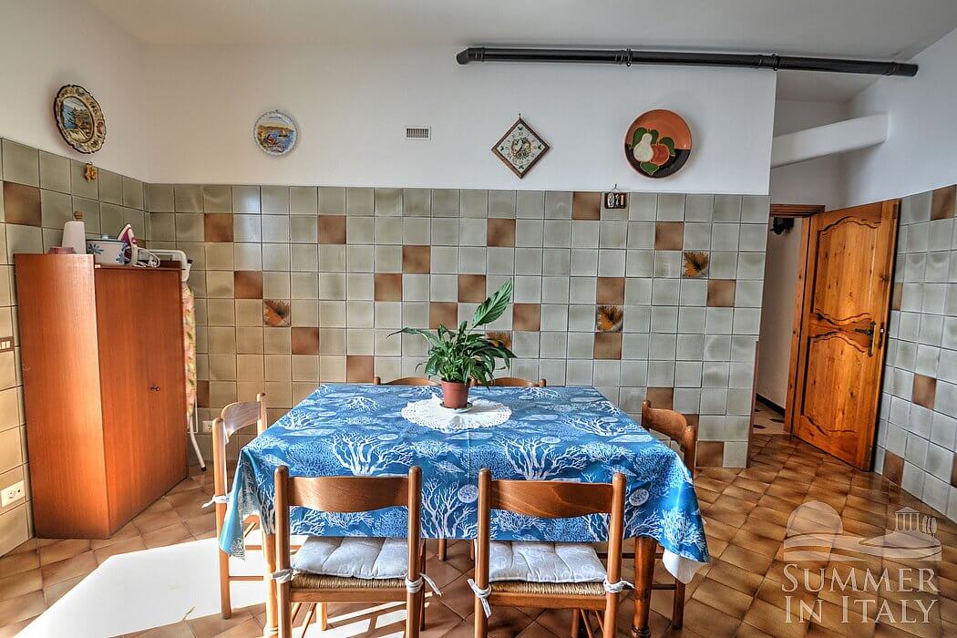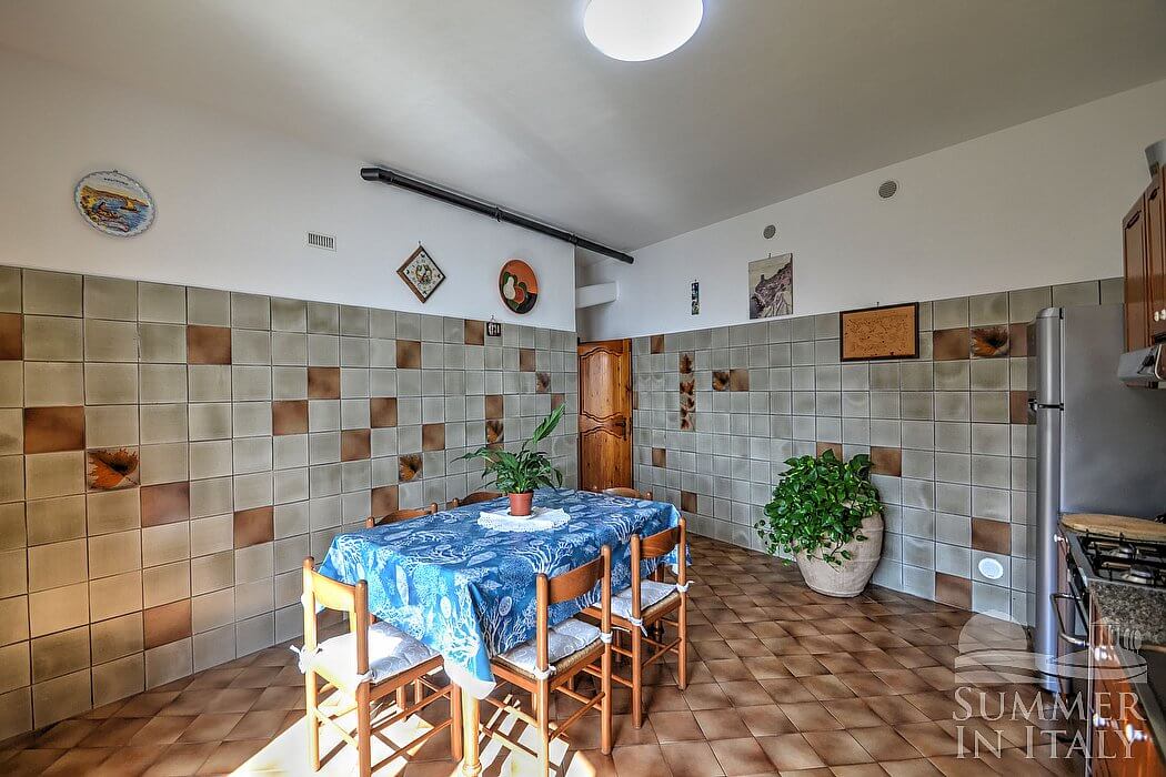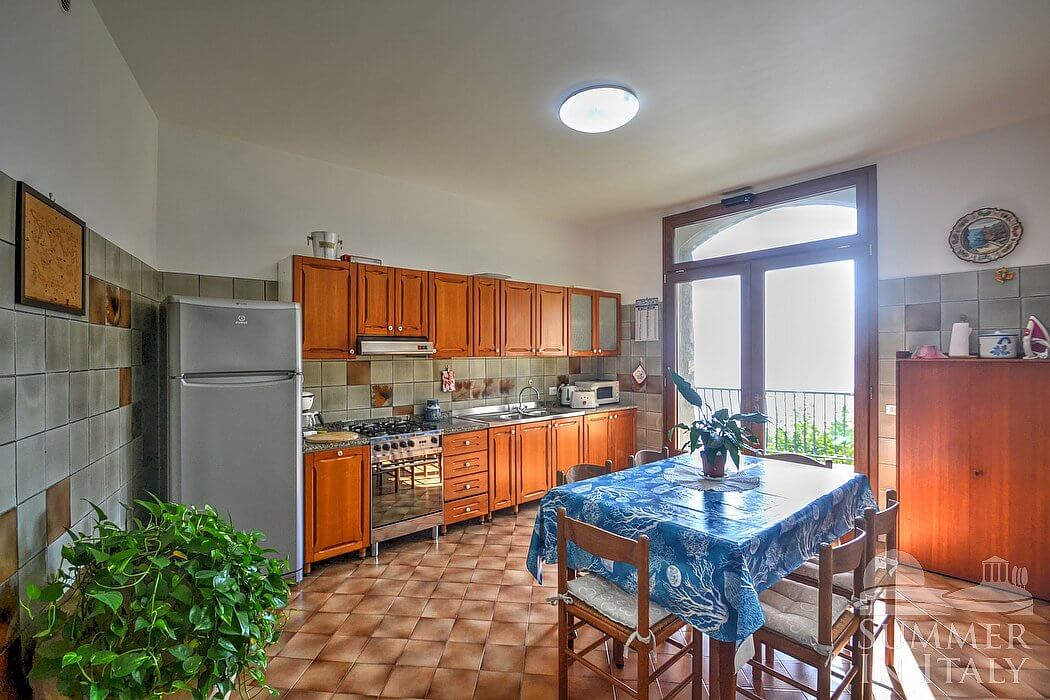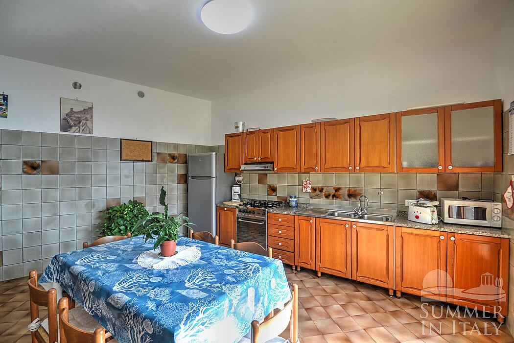 You will be able to enter the kitchen from the living room through a corridor. It is equipped with a four-burner gas cooker, an electric oven, a refrigerator with freezer, an Italian-style coffee-maker and other small appliances. The dining table can accommodate six guests. From the kitchen a French door will take you to the terrace.