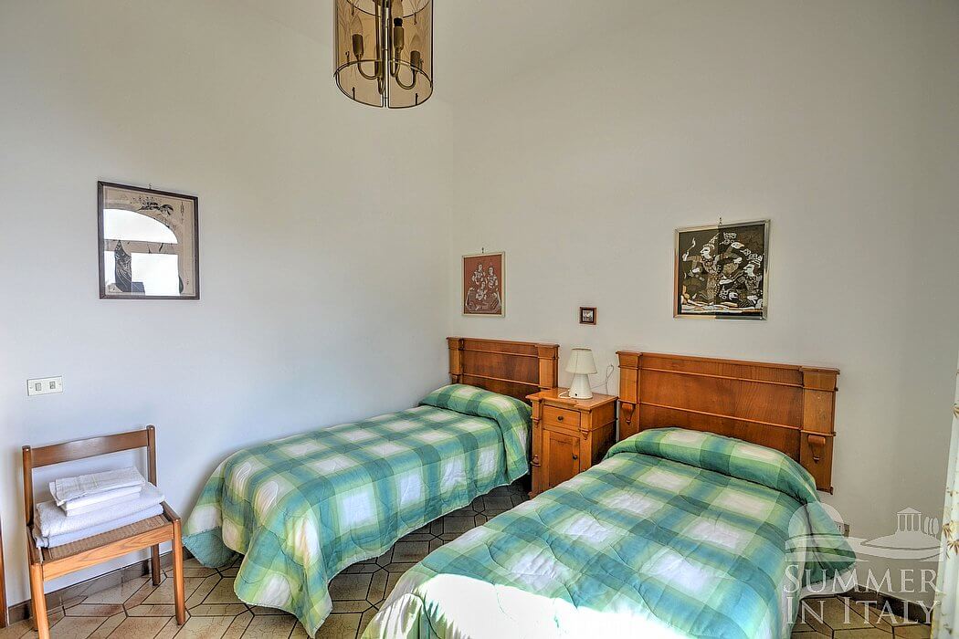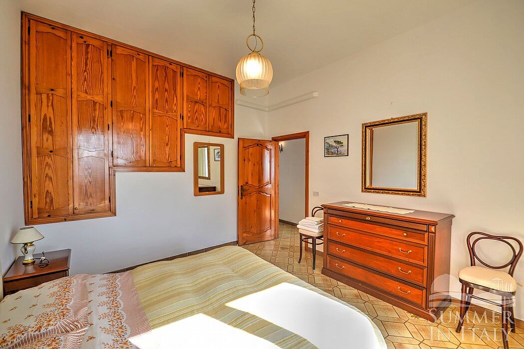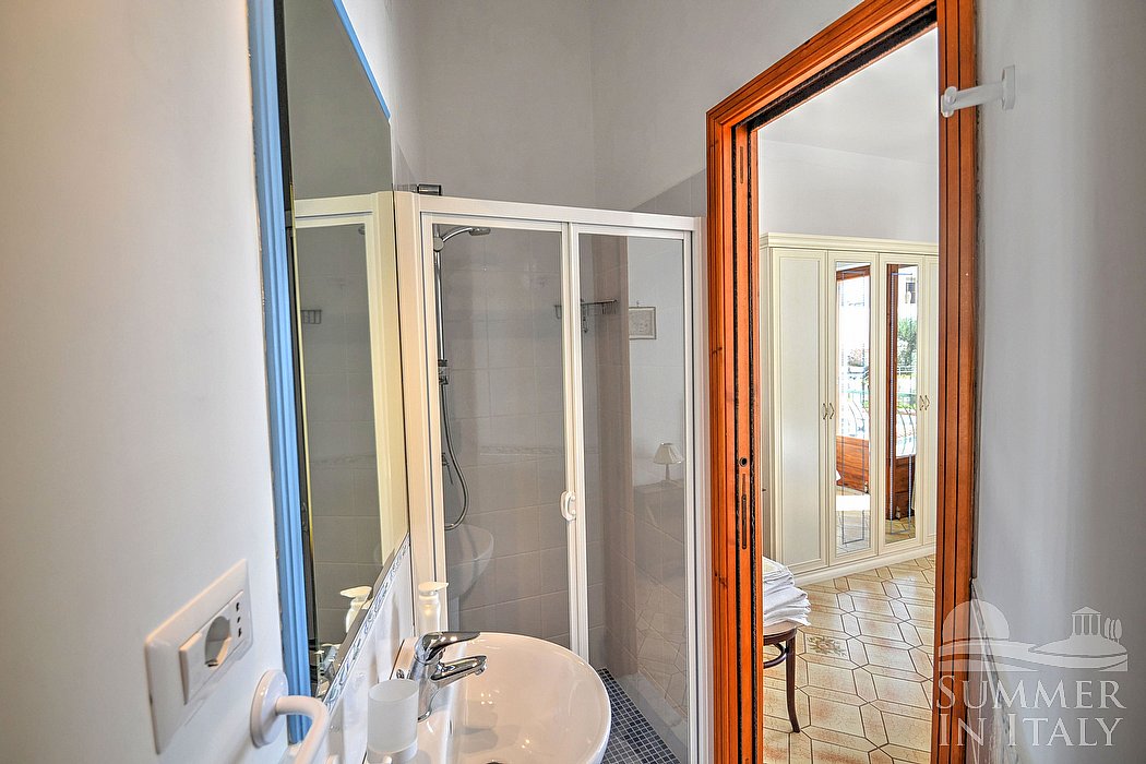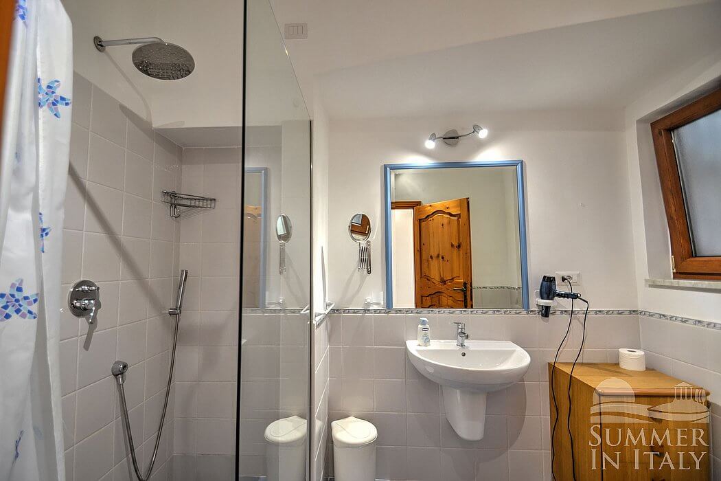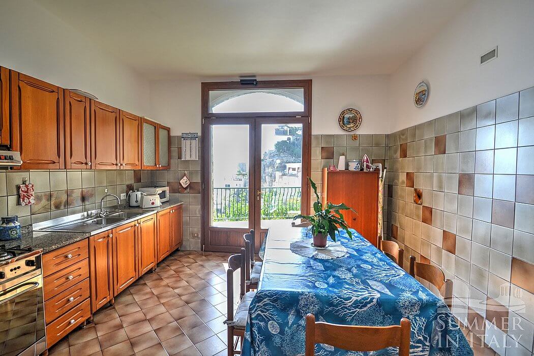 You will be able to enter the kitchen from the living room through a corridor. It is equipped with a four-burner gas cooker, an electric oven, a refrigerator with freezer, an Italian-style coffee-maker and other small appliances. The dining table can accommodate six guests. From the kitchen a French door will take you to the terrace.