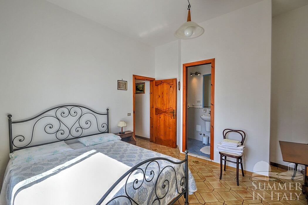 You will be able to enter the first bedroom from the corridor. The bedroom has a matrimonial bed (160 cm/62 inches, wider than a queen-size bed). From the bedroom you will be able to enter the small balcony with a view of the sea and of the coastline through a French door. The bedroom is equipped with an air conditioning/heating unit. This bedroom has an en-suite bathroom, equipped with a washbasin, a toilet, a fully enclosed shower and a hairdryer.
