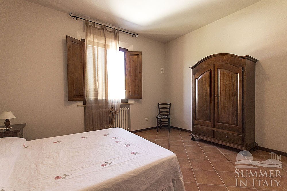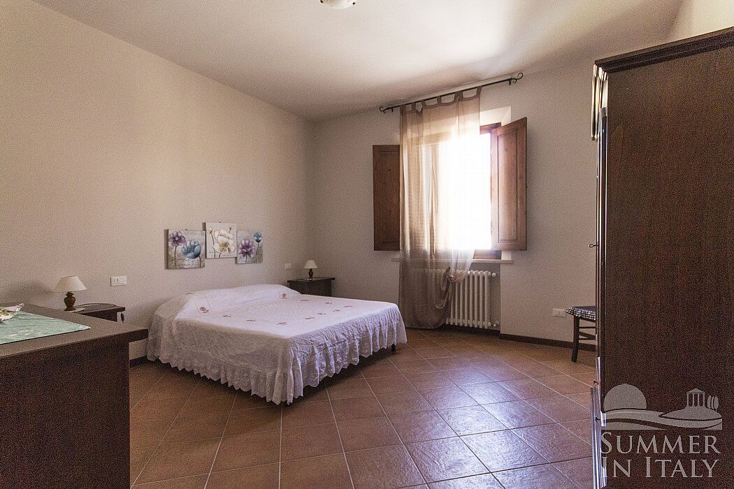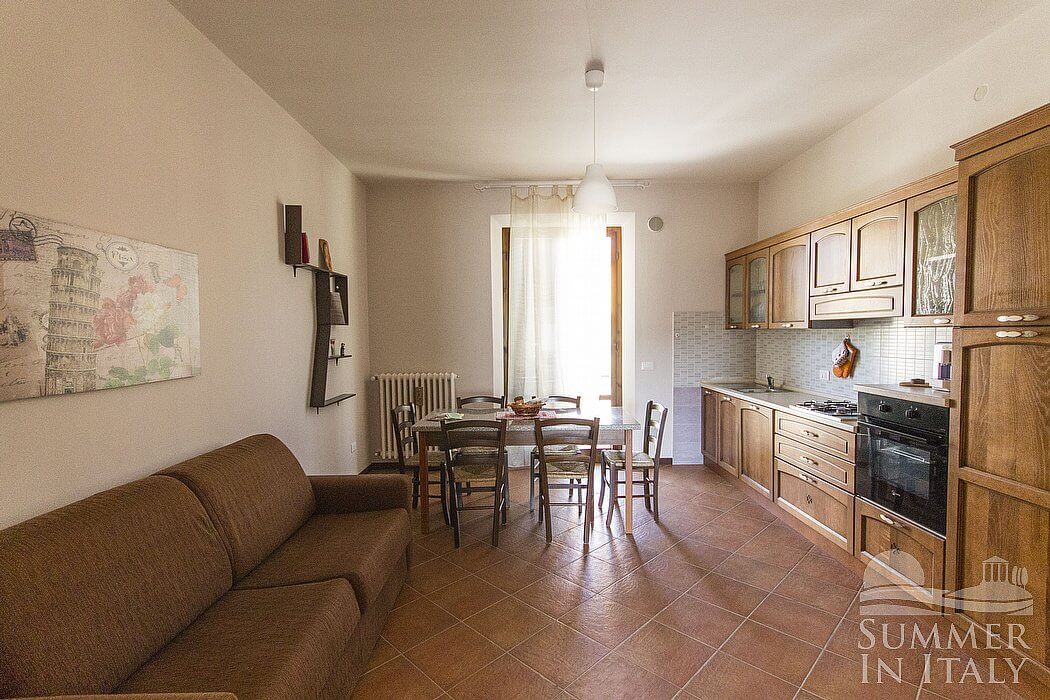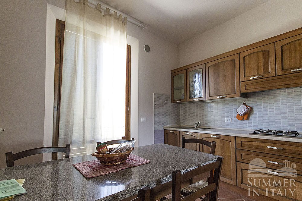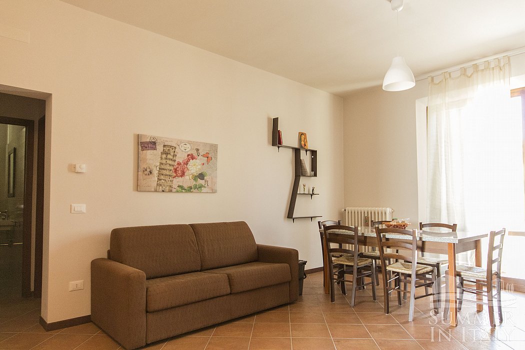 The living room is paved with terracotta tiles. The furnishings are simple and comfortable. The furnishings include a divan that unfolds into a double bed. In the living room you will also find a cooking area. The kitchenette is equipped with a four-burner gas cooker, an electric oven, a refrigerator with freezer and an Italian-style coffee-maker. The dining table can accommodate six guests. The room has a Juliet balcony with a view of the greenery.