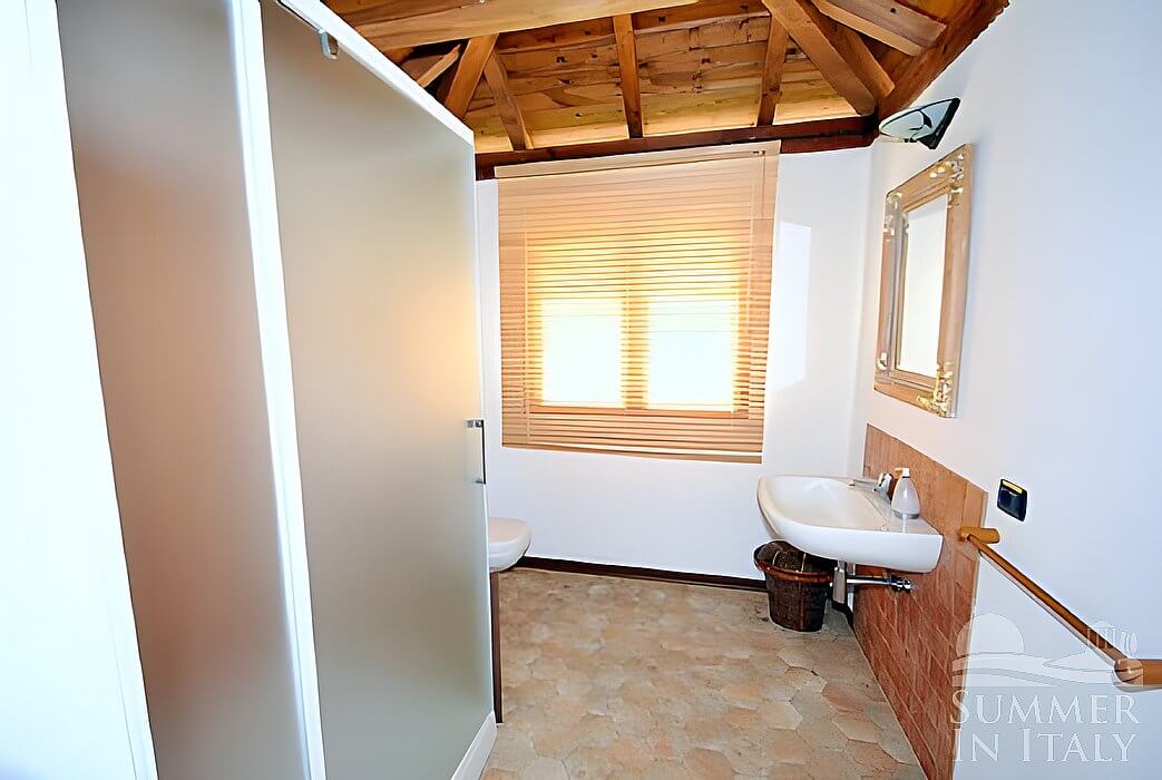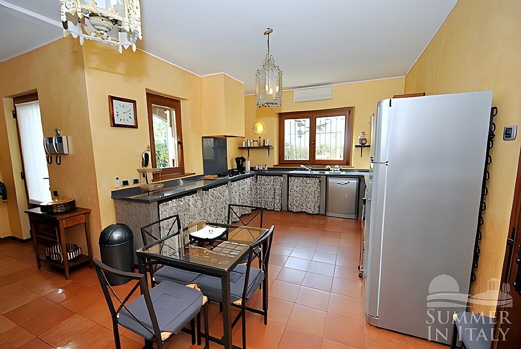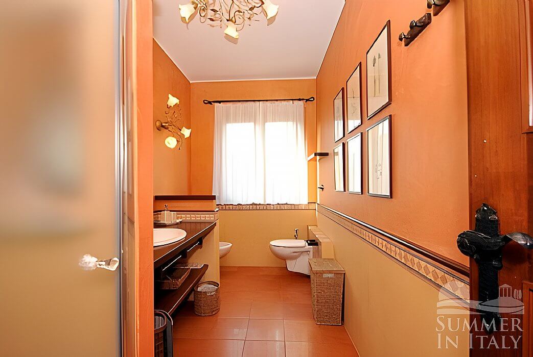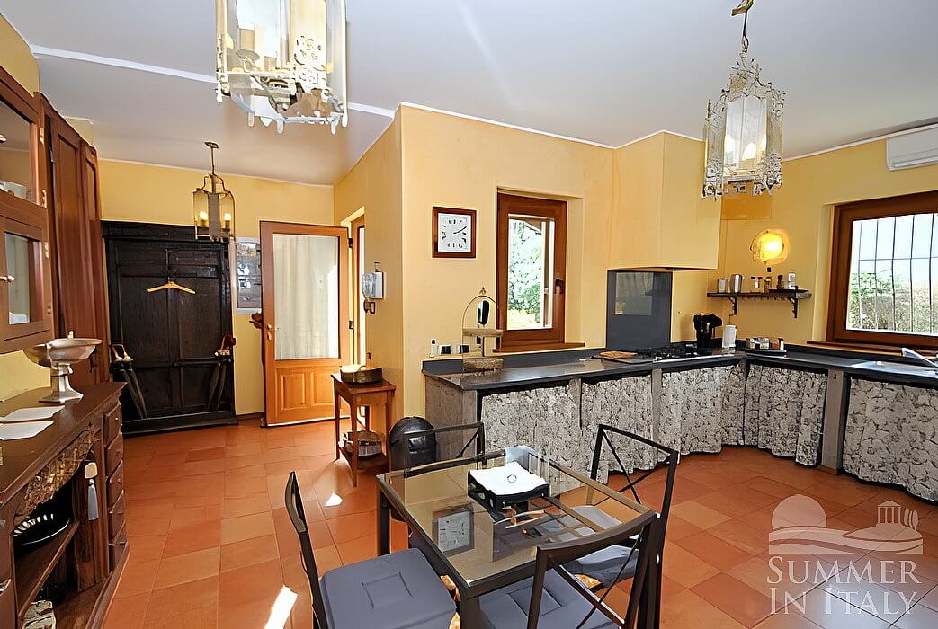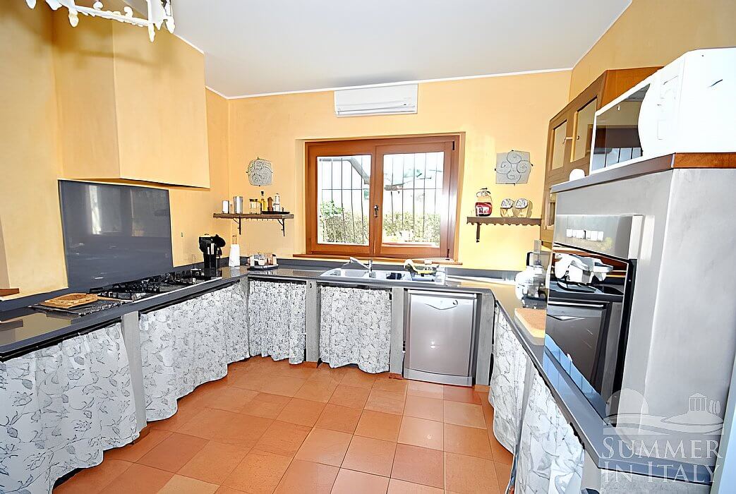 You will be able to enter the kitchen from the living room. It is spacious and comfortable, equipped with a five-burner gas cooker, an electric oven, a refrigerator with freezer, a dishwasher, a microwave oven, an Italian-style coffee-maker, an American-style coffee-maker, a toaster and a kettle. Here you will also find a washing machine (hidden by a curtain), an iron and an ironing board. The dining table can accommodate four guests. From the kitchen a French door will take you to the garden. The room also has two windows, and is equipped with an air conditioning/heating unit.
