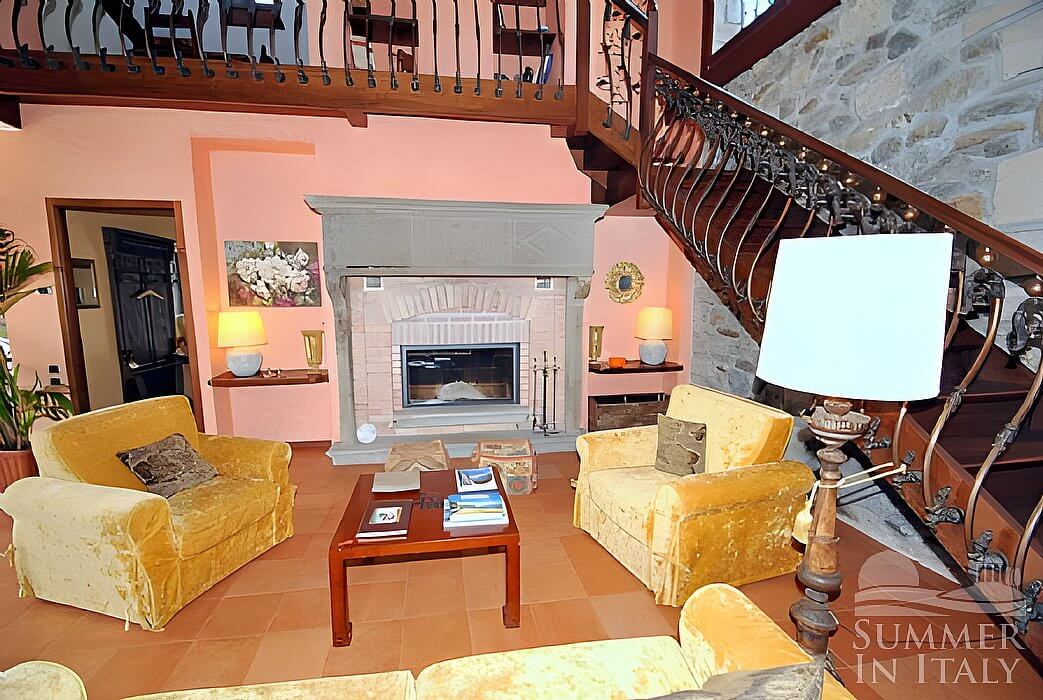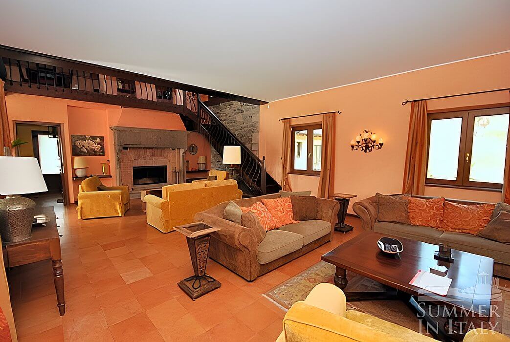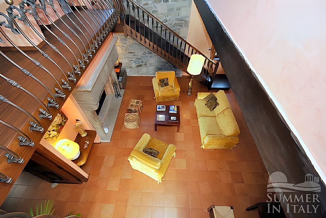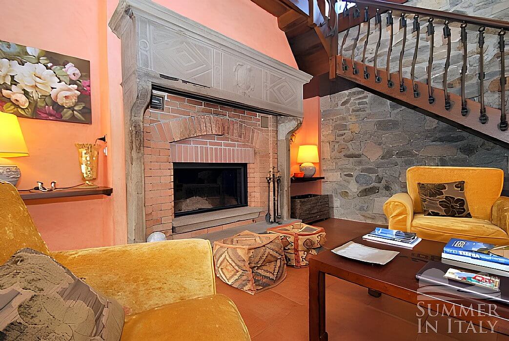 The furnishings of the living room are warm and welcoming, and include three sofas and three armchairs. There is a big and elegant fireplace made of bricks and Firenzuola stone. In this room you will find a large flat-screen satellite television (local channels). The room has three windows with a view of the garden. It is equipped with an air conditioning/heating unit.