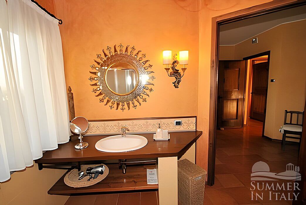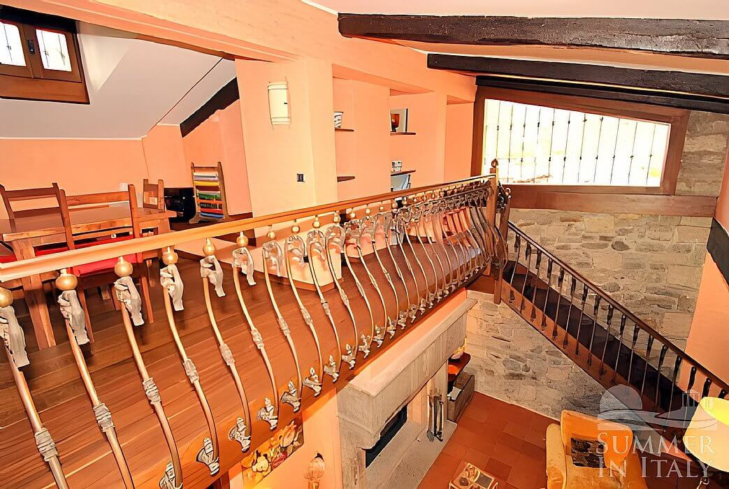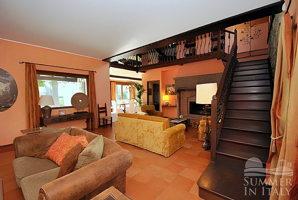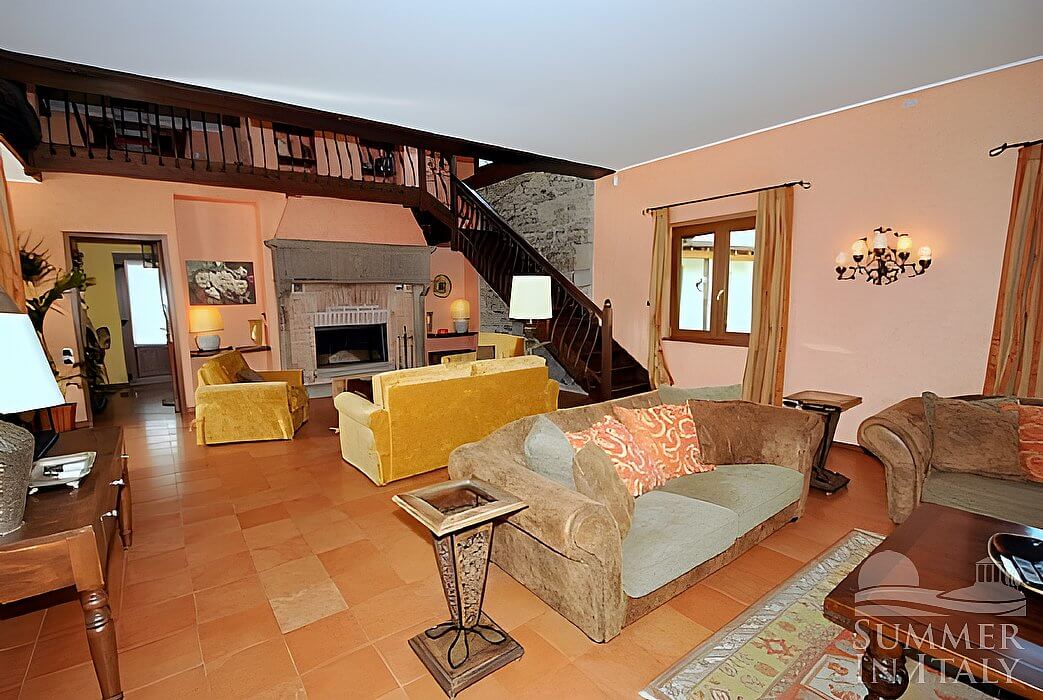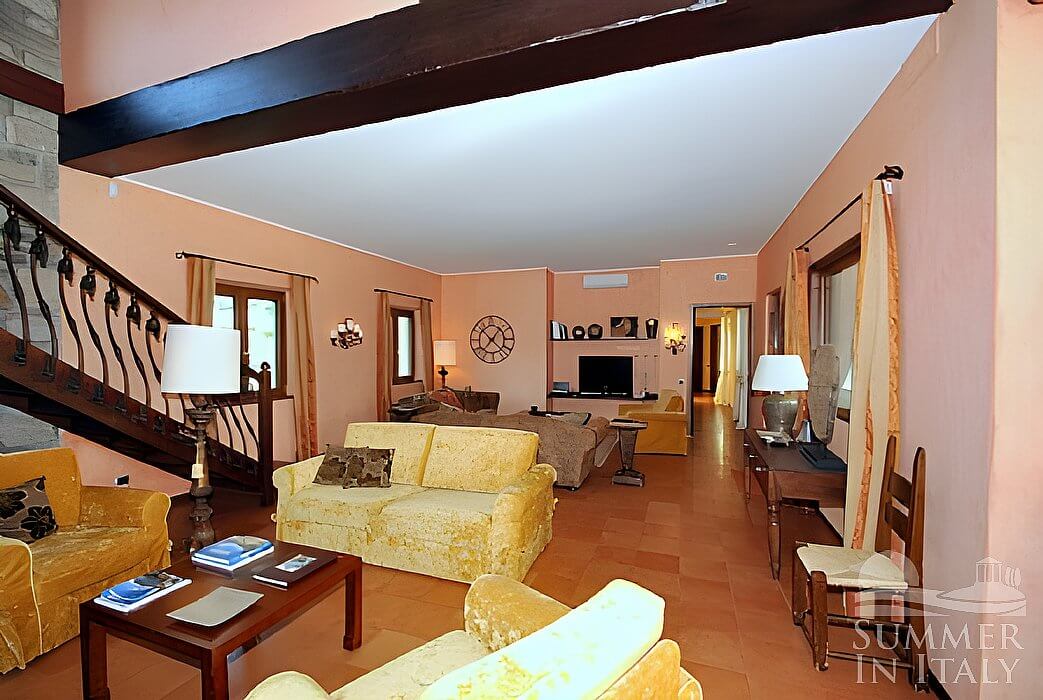 The furnishings of the living room are warm and welcoming, and include three sofas and three armchairs. There is a big and elegant fireplace made of bricks and Firenzuola stone. In this room you will find a large flat-screen satellite television (local channels). The room has three windows with a view of the garden. It is equipped with an air conditioning/heating unit.